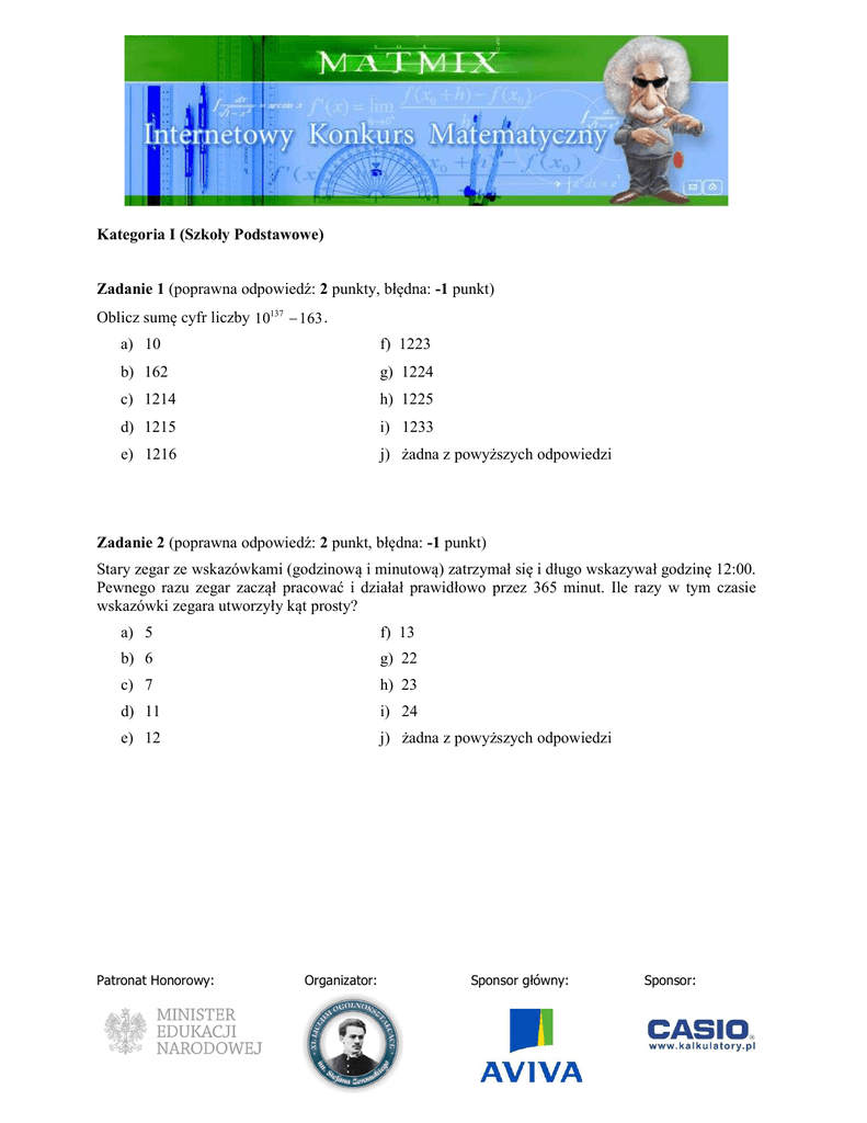Kategoria I (Szkoły Podstawowe) Zadanie 1 (poprawna odpowiedź: 2 punkty, błędna: -1 punkt) Oblicz sumę cyfr liczby 10137 163 . a) 10 f) 1223 b) 162 g) 1224 c) 1214 h) 1225 d) 1215 i) 1233 e) 1216 j) żadna z powyższych odpowiedzi Zadanie 2 (poprawna odpowiedź: 2 punkt, błędna: -1 punkt) Stary zegar ze wskazówkami (godzinową i minutową) zatrzymał się i długo wskazywał godzinę 12:00. Pewnego razu zegar zaczął pracować i działał prawidłowo przez 365 minut. Ile razy w tym czasie wskazówki zegara utworzyły kąt prosty? a) 5 f) 13 b) 6 g) 22 c) 7 h) 23 d) 11 i) 24 e) 12 j) żadna z powyższych odpowiedzi Patronat Honorowy: Organizator: Sponsor główny: Sponsor: Kategoria II (Gimnazja) Zadanie 1 (poprawna odpowiedź: 2 punkt, błędna: -1 punkt) Rozpatrzmy trójkąt ostrokątny ABC, przy czym punkt S jest środkiem okręgu opisanego na tym trójkącie, a punkt M jest środkiem odcinka AB. Ile wynosi długość odcinka SM, jeśli |AB| = 4 oraz |ACB| = 45? f) 2 2 a) 1 b) 2 g) 3 c) 3 h) d) 2 e) 12 i) 4 6 j) żadna z powyższych odpowiedzi Zadanie 2 (poprawna odpowiedź: 2 punkt, błędna: -1 punkt) Wyznacz wszystkie takie liczby rzeczywiste m, dla których rozwiązaniem układu równań 2 x y 5m 3 jest taka para liczb (x, y), że x y 8 . x 2 y 5m 1 a) m 2,) f) m 4, 2 b) m 2, 0 g) m 2, 2 c) m , 2 h) m 2, d) m 4, 2 i) m e) m 4,) j) żadna z powyższych odpowiedzi Patronat Honorowy: Organizator: 1 3 Sponsor główny: Sponsor: Kategoria III (Szkoły Ponadgimnazjalne) Zadanie 1 (poprawna odpowiedź: 2 punkt, błędna: -1 punkt) W pewnym trójkącie równoramiennym długość wysokości opuszczonej na podstawę wynosi 8,5 cm, a długości wysokości opuszczonych na ramiona mają długość 10,2 cm. Ile wynosi stosunek promienia okręgu wpisanego w ten trójkąt do promienia okręgu opisanego na tym trójkącie? 2 4 f) b) 0,4 g) c) 0,48 h) 0,6 d) 0,5 i) jest za mało danych do obliczenia tego stosunku a) e) 6 11 7 12 3 3 j) żadna z powyższych odpowiedzi Zadanie 2 (poprawna odpowiedź: 2 punkt, błędna: -1 punkt) Wyznacz wszystkie takie liczby rzeczywiste m, dla których każda z nierówności 1 (m 1) x mx 2 0 jest prawdziwa dla każdego x R . m x 3 4 x 12 5 3 x oraz (m 1) x x 2 1 g) m ; 3 3 2 h) m 3; 3 2 2 a) m 3;1 f) m ; 3 2 2 3 2 2 ; b) m ; 3 1; d) m 3 2 2 ;1 e) m 1; 3 2 2 c) m 3; 3 2 2 Patronat Honorowy: 2; i) m j) żadna z powyższych odpowiedzi Organizator: Sponsor główny: Sponsor: