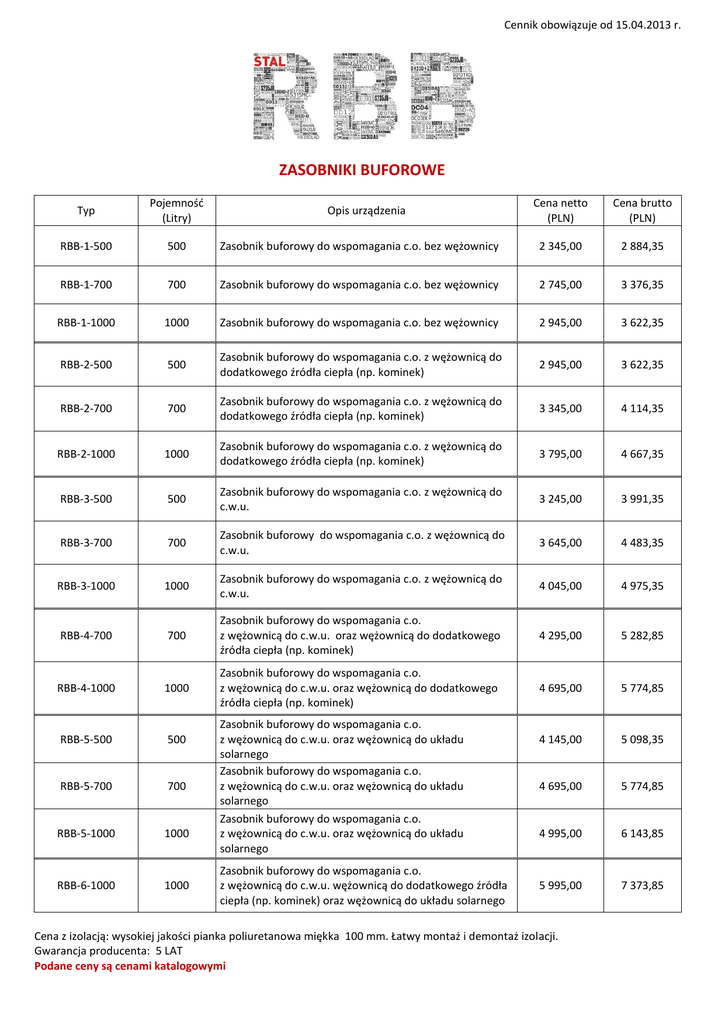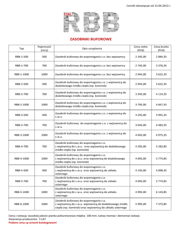 Cennik obowiązuje od 15.04.2013 r. ZASOBNIKI BUFOROWE Typ Pojemność (Litry) Cena netto (PLN) Cena brutto (PLN) RBB-1-500 500 Zasobnik buforowy do wspomagania c.o. bez wężownicy 2 345,00 2 884,35 RBB-1-700 700 Zasobnik buforowy do wspomagania c.o. bez wężownicy 2 745,00 3 376,35 RBB-1-1000 1000 Zasobnik buforowy do wspomagania c.o. bez wężownicy 2 945,00 3 622,35 RBB-2-500 500 Zasobnik buforowy do wspomagania c.o. z wężownicą do dodatkowego źródła ciepła (np. kominek) 2 945,00 3 622,35 RBB-2-700 700 Zasobnik buforowy do wspomagania c.o. z wężownicą do dodatkowego źródła ciepła (np. kominek) 3 345,00 4 114,35 RBB-2-1000 1000 Zasobnik buforowy do wspomagania c.o. z wężownicą do dodatkowego źródła ciepła (np. kominek) 3 795,00 4 667,35 RBB-3-500 500 Zasobnik buforowy do wspomagania c.o. z wężownicą do c.w.u. 3 245,00 3 991,35 RBB-3-700 700 Zasobnik buforowy do wspomagania c.o. z wężownicą do c.w.u. 3 645,00 4 483,35 RBB-3-1000 1000 Zasobnik buforowy do wspomagania c.o. z wężownicą do c.w.u. 4 045,00 4 975,35 RBB-4-700 700 Zasobnik buforowy do wspomagania c.o. z wężownicą do c.w.u. oraz wężownicą do dodatkowego źródła ciepła (np. kominek) 4 295,00 5 282,85 RBB-4-1000 1000 Zasobnik buforowy do wspomagania c.o. z wężownicą do c.w.u. oraz wężownicą do dodatkowego źródła ciepła (np. kominek) 4 695,00 5 774,85 RBB-5-500 500 4 145,00 5 098,35 RBB-5-700 700 4 695,00 5 774,85 RBB-5-1000 1000 4 995,00 6 143,85 RBB-6-1000 1000 5 995,00 7 373,85 Opis urządzenia Zasobnik buforowy do wspomagania c.o. z wężownicą do c.w.u. oraz wężownicą do układu solarnego Zasobnik buforowy do wspomagania c.o. z wężownicą do c.w.u. oraz wężownicą do układu solarnego Zasobnik buforowy do wspomagania c.o. z wężownicą do c.w.u. oraz wężownicą do układu solarnego Zasobnik buforowy do wspomagania c.o. z wężownicą do c.w.u. wężownicą do dodatkowego źródła ciepła (np. kominek) oraz wężownicą do układu solarnego Cena z izolacją: wysokiej jakości pianka poliuretanowa miękka 100 mm. Łatwy montaż i demontaż izolacji. Gwarancja producenta: 5 LAT Podane ceny są cenami katalogowymi