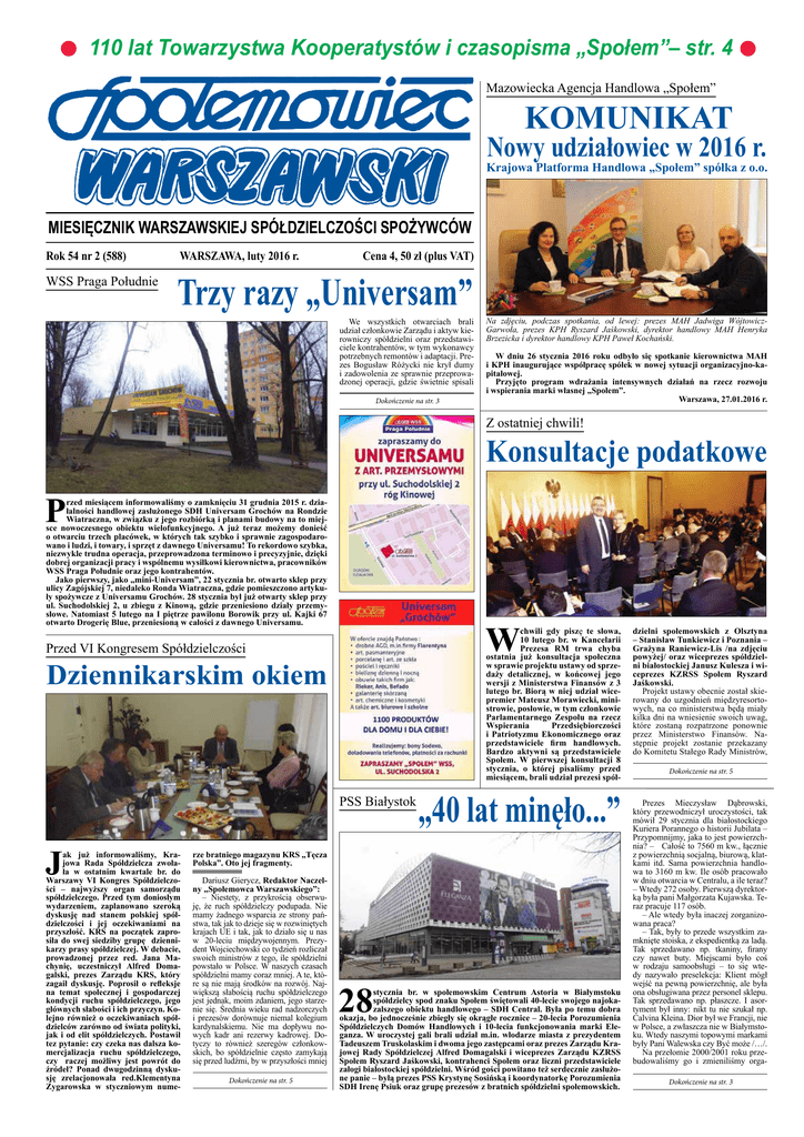 l 110 lat Towarzystwa Kooperatystów i czasopisma „Społem”– str. 4 l Mazowiecka Agencja Handlowa „Społem” Komunikat Nowy udziałowiec w 2016 r. Krajowa Platforma Handlowa „Społem” spółka z o.o. MIESIĘCZNIK WARSZAWSKIEJ SPÓŁDZIELCZOŚCI SPOŻYWCÓW Rok 54 nr 2 (588) WSS Praga Południe WARSZAWA, luty 2016 r. Cena 4, 50 zł (plus VAT) Trzy razy „Universam” We wszystkich otwarciach brali udział członkowie Zarządu i aktyw kierowniczy spółdzielni oraz przedstawiciele kontrahentów, w tym wykonawcy potrzebnych remontów i adaptacji. Prezes Bogusław Różycki nie krył dumy i zadowolenia ze sprawnie przeprowadzonej operacji, gdzie świetnie spisali Dokończenie na str. 3 Na zdjęciu, podczas spotkania, od lewej: prezes MAH Jadwiga WójtowiczGarwoła, prezes KPH Ryszard Jaśkowski, dyrektor handlowy MAH Henryka Brzezicka i dyrektor handlowy KPH Paweł Kochański. W dniu 26 stycznia 2016 roku odbyło się spotkanie kierownictwa MAH i KPH inaugurujące współpracę spółek w nowej sytuacji organizacyjno-kapitałowej. Przyjęto program wdrażania intensywnych działań na rzecz rozwoju i wspierania marki własnej „Społem”. Warszawa, 27.01.2016 r. Z ostatniej chwili! Konsultacje podatkowe P rzed miesiącem informowaliśmy o zamknięciu 31 grudnia 2015 r. działalności handlowej zasłużonego SDH Universam Grochów na Rondzie Wiatraczna, w związku z jego rozbiórką i planami budowy na to miejsce nowoczesnego obiektu wielofunkcyjnego. A już teraz możemy donieść o otwarciu trzech placówek, w których tak szybko i sprawnie zagospodarowano i ludzi, i towary, i sprzęt z dawnego Universamu! To rekordowo szybka, niezwykle trudna operacja, przeprowadzona terminowo i precyzyjnie, dzięki dobrej organizacji pracy i wspólnemu wysiłkowi kierownictwa, pracowników WSS Praga Południe oraz jego kontrahentów. Jako pierwszy, jako „mini-Universam”, 22 stycznia br. otwarto sklep przy ulicy Zagójskiej 7, niedaleko Ronda Wiatraczna, gdzie pomieszczono artykuły spożywcze z Universamu Grochów. 28 stycznia był już otwarty sklep przy ul. Suchodolskiej 2, u zbiegu z Kinową, gdzie przeniesiono działy przemysłowe. Natomiast 5 lutego na I piętrze pawilonu Borowik przy ul. Kajki 67 otwarto Drogerię Blue, przeniesioną w całości z dawnego Universamu. W chwili gdy piszę te słowa, 10 lutego br. w Kancelarii Prezesa RM trwa chyba ostatnia już konsultacja społeczna w sprawie projektu ustawy od sprzedaży detalicznej, w końcowej jego wersji z Ministerstwa Finansów z 3 lutego br. Biorą w niej udział wicepremier Mateusz Morawiecki, ministrowie, posłowie, w tym członkowie Parlamentarnego Zespołu na rzecz Wspierania Przedsiębiorczości i Patriotyzmu Ekonomicznego oraz przedstawiciele firm handlowych. Bardzo aktywni są przedstawiciele Społem. W pierwszej konsultacji 8 stycznia, o której pisaliśmy przed miesiącem, brali udział prezesi spół- Przed VI Kongresem Spółdzielczości Dziennikarskim okiem PSS Białystok J ak już informowaliśmy, Krajowa Rada Spółdzielcza zwołała w ostatnim kwartale br. do Warszawy VI Kongres Spółdzielczości – najwyższy organ samorządu spółdzielczego. Przed tym doniosłym wydarzeniem, zaplanowano szeroką dyskusję nad stanem polskiej spółdzielczości i jej oczekiwaniami na przyszłość. KRS na początek zaprosiła do swej siedziby grupę dziennikarzy prasy spółdzielczej. W debacie, prowadzonej przez red. Jana Machynię, uczestniczył Alfred Domagalski, prezes Zarządu KRS, który zagaił dyskusję. Poprosił o refleksje na temat społecznej i gospodarczej kondycji ruchu spółdzielczego, jego głównych słabości i ich przyczyn. Kolejno również o oczekiwaniach spółdzielców zarówno od świata polityki, jak i od elit spółdzielczych. Postawił tez pytanie: czy czeka nas dalsza komercjalizacja ruchu spółdzielczego, czy raczej możliwy jest powrót do źródeł? Ponad dwugodzinną dyskusję zrelacjonowała red.Klementyna Zygarowska w styczniowym nume- „40 lat minęło...” rze bratniego magazynu KRS „Tęcza Polska”. Oto jej fragmenty. Dariusz Gierycz, Redaktor Naczelny „Społemowca Warszawskiego”: – Niestety, z przykrością obserwuję, że ruch spółdzielczy podupada. Nie mamy żadnego wsparcia ze strony państwa, tak jak to dzieje się w rozwiniętych krajach UE i tak, jak to działo się u nas w 20-leciu międzywojennym. Prezydent Wojciechowski co tydzień rozliczał swoich ministrów z tego, ile spółdzielni powstało w Polsce. W naszych czasach spółdzielni mamy coraz mniej. A te, które są nie mają środków na rozwój. Największą słabością ruchu spółdzielczego jest jednak, moim zdaniem, jego starzenie się. Średnia wieku rad nadzorczych i prezesów dorównuje niemal kolegium kardynalskiemu. Nie ma dopływu nowych kadr ani rezerwy kadrowej. Dotyczy to również szeregów członkowskich, bo spółdzielnie często zamykają się przed ludźmi, by w przyszłości mniej Dokończenie na str. 5 28 stycznia br. w społemowskim Centrum Astoria w Białymstoku spółdzielcy spod znaku Społem świętowali 40-lecie swojego najokazalszego obiektu handlowego – SDH Central. Była po temu dobra okazja, bo jednocześnie zbiegły się okrągłe rocznice – 20-lecia Porozumienia Spółdzielczych Domów Handlowych i 10-lecia funkcjonowania marki Eleganza. W uroczystej gali brali udział m.in. włodarze miasta z prezydentem Tadeuszem Truskolaskim i dwoma jego zastępcami oraz prezes Zarządu Krajowej Rady Spółdzielczej Alfred Domagalski i wiceprezes Zarządu KZRSS Społem Ryszard Jaśkowski, kontrahenci Społem oraz liczni przedstawiciele załogi białostockiej spółdzielni. Wśród gości powitano też serdecznie zasłużone panie – byłą prezes PSS Krystynę Sosińską i koordynatorkę Porozumienia SDH Irenę Psiuk oraz grupę prezesów z bratnich spółdzielni społemowskich. dzielni społemowskich z Olsztyna – Stanisław Tunkiewicz i Poznania – Grażyna Raniewicz-Lis /na zdj