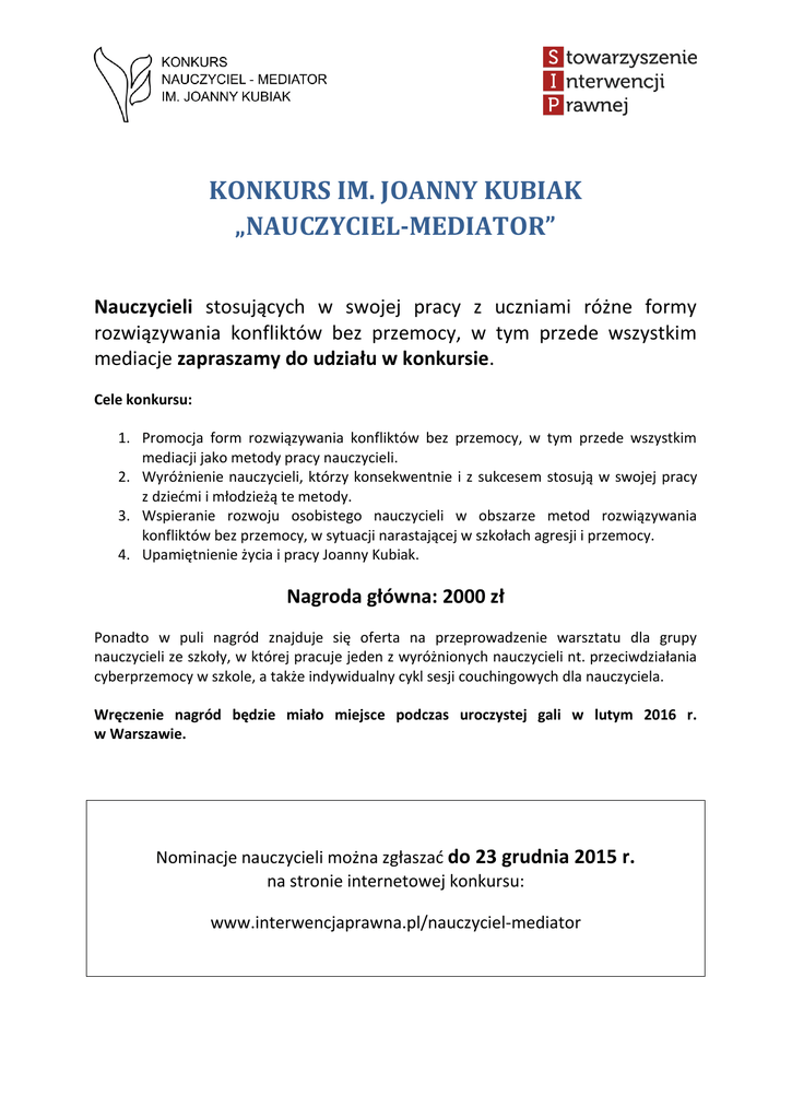 KONKURS IM. JOANNY KUBIAK „NAUCZYCIEL-MEDIATOR” Nauczycieli stosujących w swojej pracy z uczniami różne formy rozwiązywania konfliktów bez przemocy, w tym przede wszystkim mediacje zapraszamy do udziału w konkursie. Cele konkursu: 1. Promocja form rozwiązywania konfliktów bez przemocy, w tym przede wszystkim mediacji jako metody pracy nauczycieli. 2. Wyróżnienie nauczycieli, którzy konsekwentnie i z sukcesem stosują w swojej pracy z dziećmi i młodzieżą te metody. 3. Wspieranie rozwoju osobistego nauczycieli w obszarze metod rozwiązywania konfliktów bez przemocy, w sytuacji narastającej w szkołach agresji i przemocy. 4. Upamiętnienie życia i pracy Joanny Kubiak. Nagroda główna: 2000 zł Ponadto w puli nagród znajduje się oferta na przeprowadzenie warsztatu dla grupy nauczycieli ze szkoły, w której pracuje jeden z wyróżnionych nauczycieli nt. przeciwdziałania cyberprzemocy w szkole, a także indywidualny cykl sesji couchingowych dla nauczyciela. Wręczenie nagród będzie miało miejsce podczas uroczystej gali w lutym 2016 r. w Warszawie. Nominacje nauczycieli można zgłaszać do 23 grudnia 2015 r. na stronie internetowej konkursu: www.interwencjaprawna.pl/nauczyciel-mediator