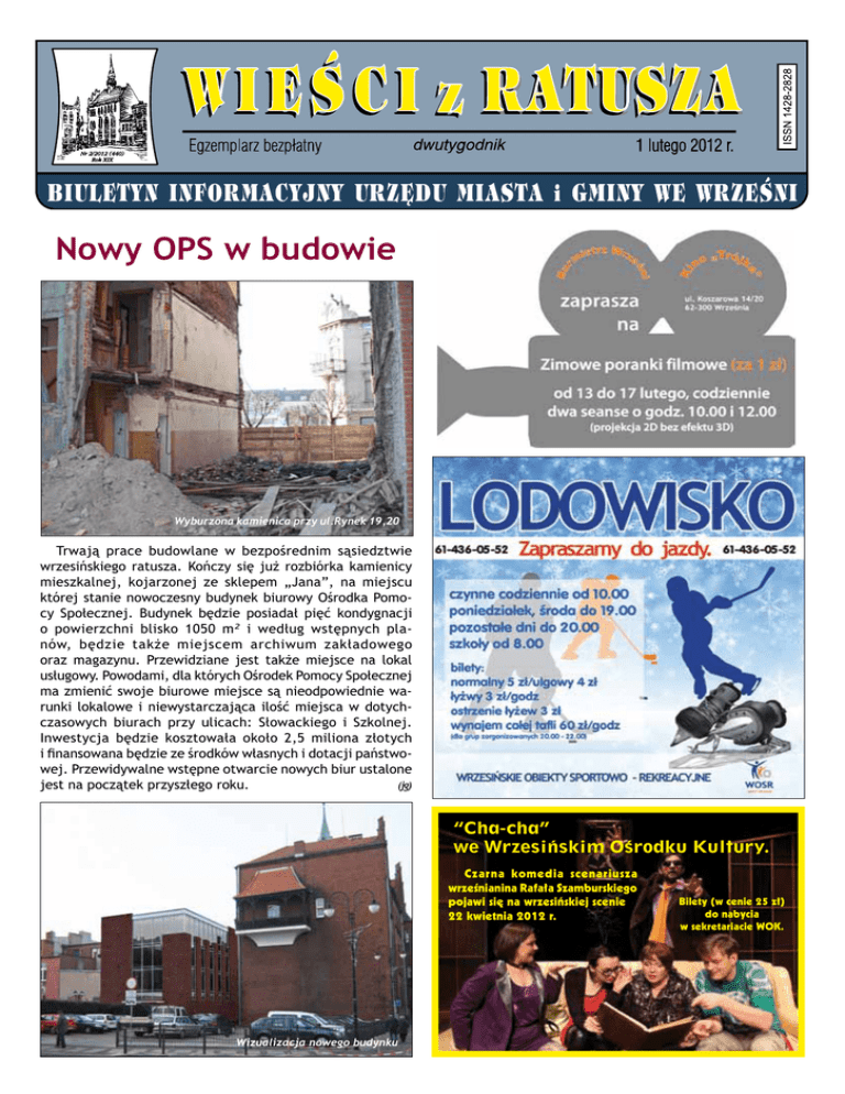 1 lutego 2012 r. WIEŚCI z RATUSZA 2/2012 1 Nowy OPS w budowie Wyburzona kamienica przy ul.Rynek 19,20 Trwają prace budowlane w bezpośrednim sąsiedztwie wrzesińskiego ratusza. Kończy się już rozbiórka kamienicy mieszkalnej, kojarzonej ze sklepem „Jana”, na miejscu której stanie nowoczesny budynek biurowy Ośrodka Pomocy Społecznej. Budynek będzie posiadał pięć kondygnacji o powierzchni blisko 1050 m² i według wstępnych planów, będzie także miejscem archiwum zakładowego oraz magazynu. Przewidziane jest także miejsce na lokal usługowy. Powodami, dla których Ośrodek Pomocy Społecznej ma zmienić swoje biurowe miejsce są nieodpowiednie warunki lokalowe i niewystarczająca ilość miejsca w dotychczasowych biurach przy ulicach: Słowackiego i Szkolnej. Inwestycja będzie kosztowała około 2,5 miliona złotych i finansowana będzie ze środków własnych i dotacji państwowej. Przewidywalne wstępne otwarcie nowych biur ustalone jest na początek przyszłego roku. (jg) “Cha-cha” we Wrzesińskim Ośrodku Kultury. Czarna komedia scenariusza wrześnianina Rafała Szamburskiego pojawi się na wrzesińskiej scenie 22 kwietnia 2012 r. Wizualizacja nowego budynku Bilety (w cenie 25 zł) do nabycia w sekretariacie WOK. WIEŚCI z RATUSZA 2/2012 2 Niech żyje bal 27 stycznia, po raz kolejny odbył się, zorganizowany przez wolontariuszy Klubu Ośmiu we współpracy z Urzędem Miasta i Gminy we Wrześni oraz Wrzesińskim Ośrodkiem Kultury, balik karnawałowy dla najmłodszych dzieci naszej gminy. 1 lutego 2012 r. „EuroLady” 2012 Rozpoczęła się druga edycja konkursu EuroLady. Jego celem jest wyłonienie kobiet, które pozyskały i wykorzystały Fundusze Europejskie oraz nagrodzenie autorki najlepiej przygotowanego projektu. Zgłoszenia można składać do 15-go lutego. Dodatkowe informacje wraz z formularzem zgłoszeniowym, dostępne na stronach : www.mareksiwiec.pl oraz www. wrzesnia.pl. Wrzesiński „Dzikus” Kilkudziesięciu wystawców z całego kraju wzięło udział w pokazie kotów rasowych, jaki odbył się 15 stycznia, w hali sportowej przy ulicy Kosynierów. Impreza rozpoczęła się o godzinie 16.00. Wtedy to na bal zaczęły przybywać bajkowe postacie, między innymi: wróżki, księżniczki, biedronki, diabełki, kotki, zajączki, policjanci itp. Impreza cieszyła się dużym powodzeniem, gdyż salę WOK wypełniło ponad 300 dzieci wraz z rodzicami i opiekunami. We wszystkim towarzyszyła im 30-osobowa grupa młodzieży z Klubu Ośmiu. Dzieci rozpoczęły świętowanie bawiąc się w kółkach, wężykach i parach. Nie zabrakło też licznych zabaw, takich jak na przykład: „Stary niedźwiedź mocno śpi”, „Pociąg”, „Nitko, nitko, hej niteczko” czy wspólne odbijanie balonów. Na milusińskich, w przerwach między pląsami i zabawami czekały słodkie poczęstunki i napoje. Były oczywiście liczne konkursy i atrakcje. Wśród nich wymienić należy przede wszystkim występy artystyczne, przygotowane przez Zespół Szkół Społecznych w Grzybowie. Uczniowie ww. szkoły zaprezentowali dwa pokazy taneczne w wykonaniu zespołów: „Blue Stars” i „Metrum” oraz indywidualne występy wokalne wykonane przez: Jakuba Majchrzyckiego, Weronikę Waszak, Aleksandrę Kryszak oraz Natalię Dylewską. Wiele frajdy dostarczyła najmłodszym uczestnikom wspólna zabawa i tańce z klaunami oraz loteria fantowa. Impreza zakończyła się około godziny 19.00. Podczas baliku panowała wspaniała atmosfera, pełna radości i dobrego humoru, a uczestnicy z wielkim entuzjazmem brali udział w przygotowanych atrakcjach. Całą imprezę poprowadził Jacek Krajniak. (pp) Wystawa zorganizowana została przez firmę X-treme z Gniezna, przy współudziale Urzędu Miasta i Gminy we Wrześni. Hodowcy przywieźli ze sobą blisko pięćdziesiąt kotów różnej rasy. Były koty bengalskie, egipskie, a najwięcej swoich reprezentantów miała rasa norweski leśny. Każdy, kto odwiedził wystawę mógł wziąć udział w wyłonieniu kota publiczności. Główną nagrodę zdobył kot o wdzięcznym imieniu „Dzikus”. Być może to nie ostatnia tego typu wystawa w naszym mieście. Organizatorzy zachęceni ogromną popularnością wystawy planują kolejne jeszcze w tym roku. (jg) Dyżury radnych Marek Kołodziejczyk – 1.02.2012 r. (środa) godz. 16.00 - 18.00. Mariola Kasierska - 7.02.2012 r. (wtorek) godz.16.00 - 18.00. Wrzesińskie biuro PO-selskie. Krystyna Poślednia otworzyła swoje biuro poselskie przy ulicy Szkolnej. Z tego powodu zorganizowała konferencję prasową dodatkowo z udziałem zaproszonych gości. Obecni na niej byli m.in. zastępca burmistrza Wrześni – Waldemar Grześkowiak oraz v-ce starosta wrzesiński Waldemar Grzegorek. Biuro posłanki Platformy Obywatelskiej mieści się w siedzibie Banku PKO przy ulicy Szkolnej 3. Otwarte będzie niemal codziennie w godzinach między 9 a 14. Kontakt z nim możliwy jest pod numerem tel. 61 436 78 81, bądź elektronicznie pod adresem: [email protected] Bożena Nowacka - 8.02.2012r. (środa) godz. 16.00 - 18.00. Stefan Ogrodowicz - 14.02.2012 r. (wtorek) godz.16.00 - 18.00. Maciej Baranowski – 15.02.2012 r. (środa) (brm) godz. 16.00 - 18.00. WIEŚCI z RATUSZA 2/2012 1 lutego 2012 r. „Moja Wielkopolska 2012” 3 patroni wrzesińskich ulic 17. Dywizja Piechoty Muzeum Regionalne we Wrześni zostało partnerem Festiwalu Fotografii im. Ireneusza Zjeżdżałki, zmarłego przed czterema laty utalentowanego wrześnianina. Festiwal Fotografii im. Ireneusza Zjeżdżałki pt. „Moja Wielkopolska” (15-27.10. br.) to projekt, który pod honorowym patronatem Marka Woźniaka, marszałka Województwa Wielkopolskiego, realizuje Wojewódzka Biblioteka Publiczna i Centrum Animacji Kultury w Poznaniu. W tym roku festiwal skupił ponad 30 partnerów – muzea, centra kultury, stowarzyszenia. Artystyczną pieczę zapewnia m.in. Związek Artystów Fotografików, Uniwersytet Artystyczny w Poznaniu, poznański oddzia