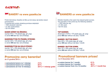 Portal internetowy Gazetka od kilku już lat cieszy się bardzo dużym powodzeniem. O popularności portalu świadczą poniższe statytstyki: ▪ 1500 odwiedzin dziennie ▪ 21 450 użytkowników ▪ 92 618 odsłon Website Gazetka a few years has enjoyed great success. The popularity of the portal say the following statistics: ▪ 1,500 visits per day ▪ 21 450 users ▪ 92 618 views wymiar 970 x 170 pikseli (jpg, gif, png) w cenie 400 eur bez vat-u/miesiąc dimension of 970 x 170 pixels (jpg, gif, png) price 400 eur without vat (tax) / month wymiar 225 x 125 pikseli (jpg, gif, png) w cenie 300 eur bez vat-u/miesiąc Size 225 x 125 pixels (jpg, gif, png) price 300 eur without vat (tax) / month wymiar 157 x 255 pikseli (jpg, gif, png) w cenie 200 eur bez vat-u/miesiąc Size 157 x 255 pixels (jpg, gif, png) price 200 eur without vat (tax) / month to 31 December 2013 do 31 grudnia 2013 r. ● zamowienie banera na 1 miesiąc: ● zamowienie banera na 3 miesiąc: ● zamowienie od 4 do 12 miesięcy: -15 % -20 % -20 % + 1 miesiąc gratis ● custom banner for 1 month: ● custom banner for 3 months: ● custom banner from 4 to 12 months: -15 % -20 % -20 % + 1 month free