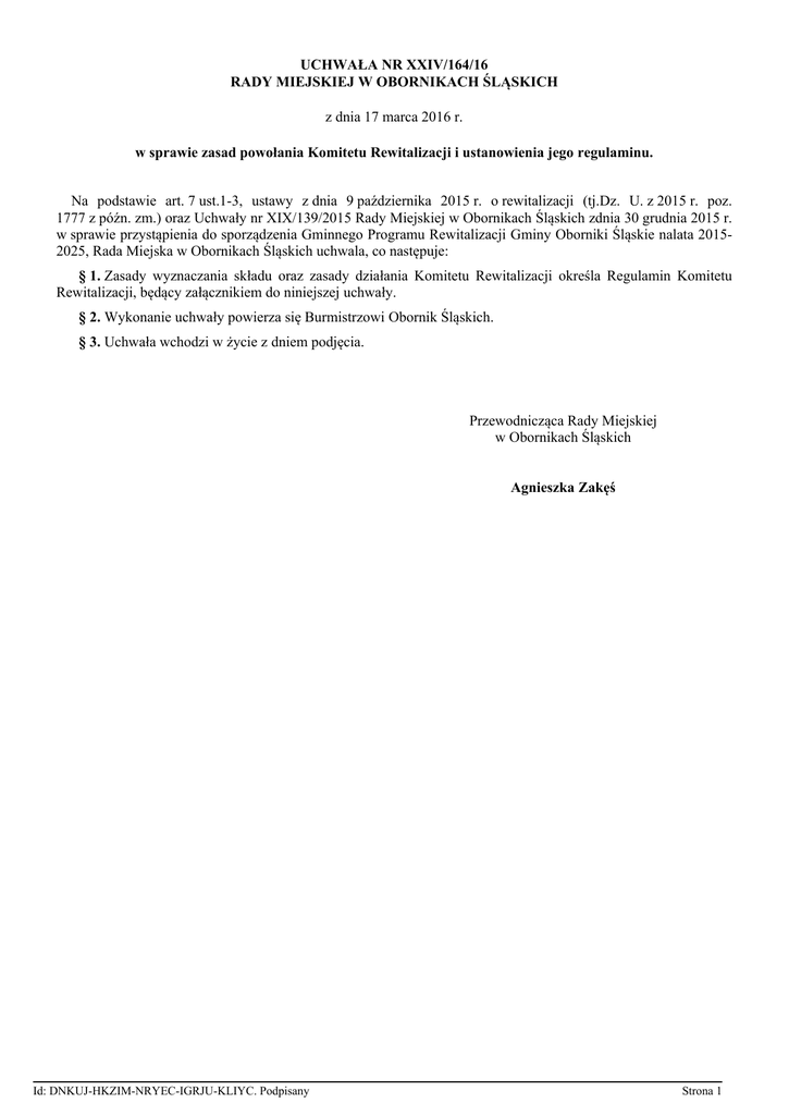 UCHWAŁA NR XXIV/164/16 RADY MIEJSKIEJ W OBORNIKACH ŚLĄSKICH z dnia 17 marca 2016 r. w sprawie zasad powołania Komitetu Rewitalizacji i ustanowienia jego regulaminu. Na podstawie art. 7 ust.1-3, ustawy z dnia 9 października 2015 r. o rewitalizacji (tj.Dz. U. z 2015 r. poz. 1777 z późn. zm.) oraz Uchwały nr XIX/139/2015 Rady Miejskiej w Obornikach Śląskich zdnia 30 grudnia 2015 r. w sprawie przystąpienia do sporządzenia Gminnego Programu Rewitalizacji Gminy Oborniki Śląskie nalata 20152025, Rada Miejska w Obornikach Śląskich uchwala, co następuje: § 1. Zasady wyznaczania składu oraz zasady działania Komitetu Rewitalizacji określa Regulamin Komitetu Rewitalizacji, będący załącznikiem do niniejszej uchwały. § 2. Wykonanie uchwały powierza się Burmistrzowi Obornik Śląskich. § 3. Uchwała wchodzi w życie z dniem podjęcia. Przewodnicząca Rady Miejskiej w Obornikach Śląskich Agnieszka Zakęś Id: DNKUJ-HKZIM-NRYEC-IGRJU-KLIYC. Podpisany Strona 1 Załącznik Nr 1 do Uchwały Nr XXIV/164/16 Rady Miejskiej w Obornikach Śląskich z dnia 17 marca 2016 r. Regulamin Komitetu Rewitalizacji Rozdział 1. Zadania Komitetu Rewitalizacji § 1. 1. Komitet Rewitalizacji, zwany dalej Komitetem wspiera działania Burmistrza Obornik Śląskich w obszarze rewitalizacji, stanowi forum współpracy i dialogu interesariuszy z organami gminy a także sprawuje funkcje opiniodawczo – doradcze w sprawach związanych z opracowaniem i wdrażaniem Gminnego Programu Rewitalizacji Gminy Oborniki Ślaskie na lata 2015- 2025, oraz oceną przebiegu procesu rewitalizacji w Gminie Oborniki Ślaskie. 2. Komitet reprezentuje lokalne środowiska gospodarcze, oświatowe, mieszkańców Gminy Oborniki Ślaskie, organizacje pozarządowe oraz inne grupy. § 2. 1. Komitet uprawniony jest do wyrażania opinii oraz podejmowania inicjatyw rozwiązań odnoszących się do rewitalizacji Gminy Oborniki Ślaskie. 2. Komitet uczestniczy w opiniowaniu oraz przygotowaniu projektów uchwał Rady Miejskiej i zarządzeń Burmistrza Obornik Ślaskich związanych z rewitalizacją. Rozdział 2. Organizacja i tryb pracy Komitetu § 1. 1. Członków Komitetu powołuje Burmistrz Obornik Śląskich w drodze Zarządzenia. 2. Komitet liczy nie więcej niż 17 członków, w tym: 1) nie więcej niż 3 przedstawicieli środowiska oświaty i kultury, 2) nie więcej niż 2 przedstawicieli Rady Miejskiej w Obornikach Śląskich, 3) nie więcej niż 1 przedstawiciel Młodzieżowej Rady Miejskiej w Obornikach Ślaskich, 4) nie więcej niż 1 przedstawiciel środowiska architektów i urbanistów, 5) nie więcej niż 3 mieszkańców Gminy Oborniki Śląskie, nie będących członkami i nie pracujących w jednostkach organizacyjnych Urzędu Miejskiego Obornikach Śląskich, stowarzyszeń 6) nie więcej niż 2 przedstawicieli środowiska gospodarczego, 7) nie więcej niż 4 przedstawicieli organizacji pozarządowych działających na obszarze Gminy Oborniki Śląskie, 8) nie więcej niż 1 przedstawiciel służby zdrowia. 3. Zgłoszenie chęci przystąpienia do Komitetu następuje na podstawie pisemnej deklaracji, której wzór stanowi załącznik do Regulaminu. 4. Informacja o naborze członków do Komitetu udostępniona będzie publicznie na stronie www.bip.obornikislaskie.pl oraz www.oborniki-slakie.pl., zaproszenia do składania deklaracji przystąpienia będą także wysłane do wszystkich wskazanych w ust. 2 środowisk. 5. Każdy z członków Komitetu musi być zameldowany na stałe lub czasowo w Gminie Oborniki Śląskie. 6. Kadencja Komitetu trwa do czasu zakończenia procesu rewitalizacji w latach 2015-2025, którego ostatnim elementem jest opracowanie Raportu z Realizacji Gminnego Programu Rewitalizacji Gminy ObornikiŚląskie na lata 2015-2025. 7. W trakcie kadencji Komitetu Burmistrz Obornik Śląskich może odwołać obecnego członka Komitetu lub powołać nowego z własnej inicjatywy, z inicjatywy mieszkańców lub na wniosek Przewodniczącego Komitetu. Id: DNKUJ-HKZIM-NRYEC-IGRJU-KLIYC. Podpisany Strona 1 § 2. 1. Pierwsze posiedzenie Komitetu zwołuje Burmistrz Obornik Śląskich. 2. Komitet wybiera na swoim pierwszym posiedzeniu Prezydium Komitetu. 3. W skład Prezydium Komitetu wchodzą Przewodniczący Komitetu i Zastępca Przewodniczącego Komitetu. 4. Wybór Prezydium Komitetu następuje zwykłą większością głosów w głosowaniu jawnym spośród członków Komitetu obecnych na posiedzeniu. § 3. 1. Przewodniczący Komitetu kieruje pracami Komitetu, a w razie jego nieobecności Wiceprzewodniczący Komitetu. 2. Przewodniczący Komitetu zwołuje posiedzenia Komitetu, w tym: 1) ustala porządek i termin obrad Komitetu w porozumieniu z Burmistrzem Obornik Śląskich; 2) przewodniczy obradom Komitetu; 3) reprezentuje Komitet; 4) zaprasza na posiedzenia Komitetu, w porozumieniu z Burmistrzem Obornik Śląskich, przedstawicieli organów, instytucji i organizacji, które nie są reprezentowane w Komitecie; 5) inicjuje i organizuje prace Komitetu. § 4. 1. Posiedzenia Komitetu odbywają się według potrzeb Komitetu, z udziałem Burmistrza Obornik Śląskich. 2. Członkowie Komitetu będą powiadomieni o posiedzeniach Komitetu pisemnie, telefonicznie lub w inny przyjęty przez Komitet sposób. 3. Z posiedzenia Komitetu sporządzany jest protokół, w którym wpisuje się wszelkie ustalenia poczynione podczas posiedzenia Komitetu i każdorazowo sporządzana jest lista obecności. 4. Komitet może także uzgadniać swe stanowisko poza zwoływanymi spotkaniami i przekazywać je w formie pisemnej Burmistrzowi Obornik Śląskich, przy czym pismo takie musi być podpisane przez co najmniej 50% członków Komitetu, Przewodniczącego Komitetu lub Zastępcę Przewodniczącego Komitetu. § 5. 1. Uczestnictwo w Komitecie ma charakter społeczny. 2. Za udział w posiedzeniach i pracach Komitetu nie przysługuje wynagrodzenie. Id: DNKUJ-HKZIM-NRYEC-IGRJU-KLIYC. Podpisany Strona 2 Załącznik do Regulaminu Komitetu Rewitalizacji FO