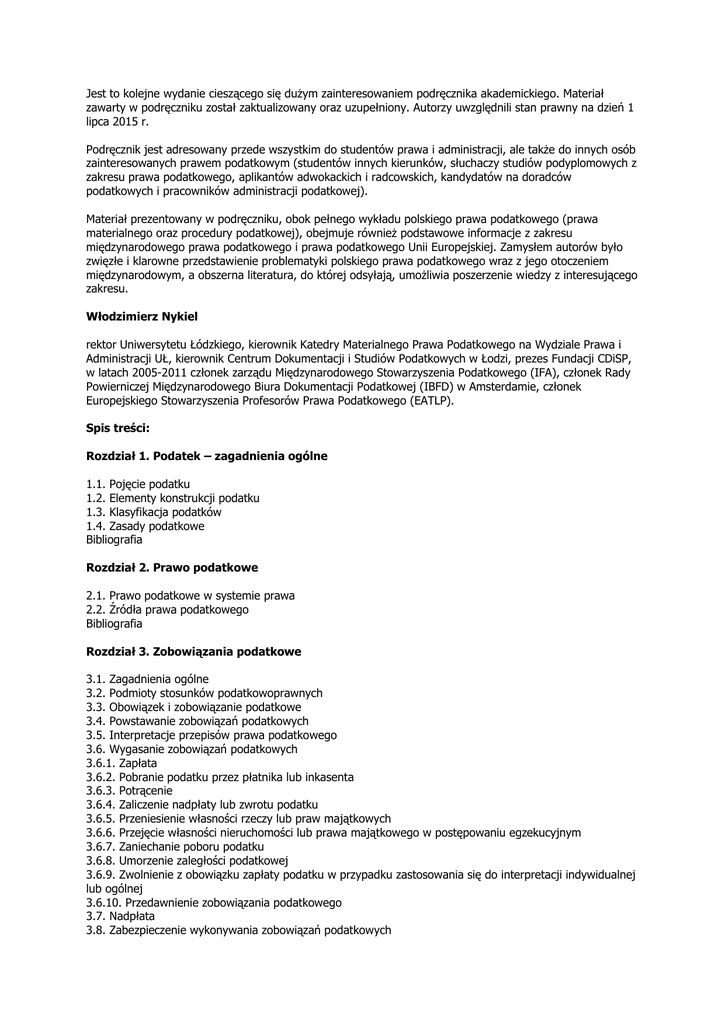 Jest to kolejne wydanie cieszącego się dużym zainteresowaniem podręcznika akademickiego. Materiał zawarty w podręczniku został zaktualizowany oraz uzupełniony. Autorzy uwzględnili stan prawny na dzień 1 lipca 2015 r. Podręcznik jest adresowany przede wszystkim do studentów prawa i administracji, ale także do innych osób zainteresowanych prawem podatkowym (studentów innych kierunków, słuchaczy studiów podyplomowych z zakresu prawa podatkowego, aplikantów adwokackich i radcowskich, kandydatów na doradców podatkowych i pracowników administracji podatkowej). Materiał prezentowany w podręczniku, obok pełnego wykładu polskiego prawa podatkowego (prawa materialnego oraz procedury podatkowej), obejmuje również podstawowe informacje z zakresu międzynarodowego prawa podatkowego i prawa podatkowego Unii Europejskiej. Zamysłem autorów było zwięzłe i klarowne przedstawienie problematyki polskiego prawa podatkowego wraz z jego otoczeniem międzynarodowym, a obszerna literatura, do której odsyłają, umożliwia poszerzenie wiedzy z interesującego zakresu. Włodzimierz Nykiel rektor Uniwersytetu Łódzkiego, kierownik Katedry Materialnego Prawa Podatkowego na Wydziale Prawa i Administracji UŁ, kierownik Centrum Dokumentacji i Studiów Podatkowych w Łodzi, prezes Fundacji CDiSP, w latach 2005-2011 członek zarządu Międzynarodowego Stowarzyszenia Podatkowego (IFA), członek Rady Powierniczej Międzynarodowego Biura Dokumentacji Podatkowej (IBFD) w Amsterdamie, członek Europejskiego Stowarzyszenia Profesorów Prawa Podatkowego (EATLP). Spis treści: Rozdział 1. Podatek – zagadnienia ogólne 1.1. Pojęcie podatku 1.2. Elementy konstrukcji podatku 1.3. Klasyfikacja podatków 1.4. Zasady podatkowe Bibliografia Rozdział 2. Prawo podatkowe 2.1. Prawo podatkowe w systemie prawa 2.2. Źródła prawa podatkowego Bibliografia Rozdział 3. Zobowiązania podatkowe 3.1. Zagadnienia ogólne 3.2. Podmioty stosunków podatkowoprawnych 3.3. Obowiązek i zobowiązanie podatkowe 3.4. Powstawanie zobowiązań podatkowych 3.5. Interpretacje przepisów prawa podatkowego 3.6. Wygasanie zobowiązań podatkowych 3.6.1. Zapłata 3.6.2. Pobranie podatku przez płatnika lub inkasenta 3.6.3. Potrącenie 3.6.4. Zaliczenie nadpłaty lub zwrotu podatku 3.6.5. Przeniesienie własności rzeczy lub praw majątkowych 3.6.6. Przejęcie własności nieruchomości lub prawa majątkowego w postępowaniu egzekucyjnym 3.6.7. Zaniechanie poboru podatku 3.6.8. Umorzenie zaległości podatkowej 3.6.9. Zwolnienie z obowiązku zapłaty podatku w przypadku zastosowania się do interpretacji indywidualnej lub ogólnej 3.6.10. Przedawnienie zobowiązania podatkowego 3.7. Nadpłata 3.8. Zabezpieczenie wykonywania zobowiązań podatkowych 3.8.1. Ogólna charakterystyka instytucji zabezpieczenia wykonywania zobowiązań podatkowych 3.8.2. Hipoteka przymusowa 3.8.3. Zastaw skarbowy 3.8.4. Szczególne formy zabezpieczenia wykonania zobowiązań podatkowych 3.9. Odpowiedzialność podatnika, płatnika i inkasenta 3.9.1. Pojęcie i zakres odpowiedzialności za zobowiązanie podatkowe 3.9.2. Odpowiedzialność podatnika za zobowiązanie podatkowe 3.9.3. Odpowiedzialność płatnika oraz inkasenta za zobowiązanie podatkowe 3.10. Odpowiedzialność osób trzecich za zaległości podatkowe 3.10.1. Ogólne zasady odpowiedzialności osób trzecich 3.10.2. Odpowiedzialność rozwiedzionego małżonka podatnika 3.10.3. Odpowiedzialność członków rodziny podatnika 3.10.4. Odpowiedzialność nabywcy określonych składników majątku podatnika 3.10.5. Odpowiedzialność jednoosobowej spółki kapitałowej 3.10.6. Odpowiedzialność firmującego 3.10.7. Odpowiedzialność właściciela, samoistnego posiadacza i użytkownika wieczystego rzeczy lub prawa majątkowego 3.10.8. Odpowiedzialność dzierżawcy i użytkownika nieruchomości podatnika 3.10.9. Odpowiedzialność wspólników spółek niemających osobowości prawnej 3.10.10. Odpowiedzialność członków zarządów spółek kapitałowych, członków zarządów (wspólników) spółek kapitałowych w organizacji oraz członków organów zarządzających innych osób prawnych 3.10.11. Odpowiedzialność osób prawnych przejmujących lub powstałych w wyniku podziału innej osoby prawnej 3.10.12. Odpowiedzialność gwaranta i poręczyciela 3.10.13. Odpowiedzialność podatnika podatku od towarów i usług 3.11. Następstwo prawne Bibliografia Rozdział 4. Postępowanie podatkowe 4.1. Zasady ogólne 4.2. Podmioty postępowania podatkowego 4.2.1. Organy podatkowe jako organy prowadzące postępowanie 4.2.2. Właściwość organu 4.2.3. Spory o właściwość 4.2.4. Wyłączenie pracownika i organu podatkowego od załatwienia sprawy 4.2.5. Strona 4.2.6. Uczestnicy postępowania na prawach strony 4.2.7. Inni uczestnicy postępowania 4.3. Przepisy porządkowe i środki oddziałujące na przebieg postępowania 4.3.1. Doręczenia 4.3.2. Wezwania 4.3.3. Metryka sprawy 4.3.4. Protokoły i adnotacje 4.3.5. Udostępnianie akt postępowania 4.3.6. Terminy 4.3.6.1. Rodzaje terminów i ich obliczanie 4.3.6.2. Przywracanie terminów 4.3.6.3. Terminy załatwiania spraw 4.4. Postępowanie przed organem pierwszej instancji 4.4.1. Wszczęcie postępowania 4.4.2. Postępowanie wyjaśniające 4.4.2.1. Zasady postępowania wyjaśniającego 4.4.2.2. Środki dowodowe 4.4.3. Zajęcie stanowiska w sprawie przez inny organ 4.4.4. Zawieszenie postępowania 4.4.5. Umorzenie postępowania 4.5. Akty kończące postępowanie 4.5.1. Decyzja 4.5.1.1. Elementy decyzji 4.5.1.2. Uzupełnienie, sprostowanie i wykładnia decyzji 4.5.2. Postanowienie 4.6. Postępowanie przed organem II instancji 4.6.1. Odwołanie 4.6.2. Postępowanie odwoławcze 4.6.2.1. Przebieg postępowania odwoławczego 4.6.2.2. Zakres uprawnień decyzyjnych organu odwoławczego 4.6.2.3. Zakaz orzekania na niekorzyść odwołującego (zakaz reformationis in peius) 4.6.2.4. Zażalenie 4.7. Weryfikacja ostatecznych decyzji i postanowień 4.