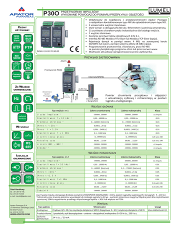 IMPULSÓW P30O PRZETWORNIK WYKONANIE POWOGAZ DO POMIARU PRZEPŁYWU I OBJĘTOŚCI • Dedykowany do współpracy z przepływomierzami Apator Powogaz z nadajnikiem kontaktronowym typu NK lub optoelektronicznym typu NO. • 2 uniwersalne wejścia impulsowe. • Dwie wersje: z obsługą karty SD lub z Ethernetem i pamiecią wewnętrzną. • 21-punktowa charakterystyka indywidualna dla każdego wejścia. • 1 wyjście alarmowe. • Zasilanie przetworników obiektowych 24V d.c. • Interfejs RS-485 Modbus RTU Slave lub Modbus TCP Slave (opcja). • Rejestracja danych w pamięci wewn. 4 MB, na zewnęrznej karcie SD/SDHC lub wewn. pamięci systemu plików (8 GB) (opcja). • Programowanie przetwornika z klawiatury, przez RS-485 za pomocą bezpłatnego programu eCon lub przez serwer www. • Możliwość aktualizacji oprogramowania przez użytkownika. CECHY UŻYTKOWE: HTTP PKWiU 33.20.70-90.00 eCon P������� ������������ Program Alarm Ch-ka 21-punktowa RTC Przetwornik P30O Ochrona hasłem Internet/WWW Impulsy Reset Hz 4-20 mA Wodomierz Apator Powogaz Start/Stop 2X WEJŚCIE UNIWERSALNE: miernik NA5 z bargrafem Pomiar strumienia przepływu i objętości z wizualizacją cyforwą i retransmisją w postaci sygnału analogowego. W������ ������ Typ wejścia nr 1 zadajnik wartości Liczba impulsow 1 Czestotliwosc f < 10 kHz Predkosc obrotowa WYJŚCIA: Okres t < 20s 1 1 t < 1,5h Okres Czestotliwosc f < 1 MHz Licznik czasu pracy + - U RS 485 Aktualny czas Licznik WE1 – WE2 Enkoder 1 1 Typ wejścia nr 2 Liczba impulsow 1 tel: (61) 84 18 148, fax: (61) 84 72 548 e-mail: [email protected] Apator Powogaz S.A. ul. Klemensa Janickiego 23/25 60-542 Poznań tel. (61) 84 18 100 WWW.APATOR.COM -99999...99999 ±1 impuls 0,05...12000 Hz 0,01 0....60000 [Rot/min] 0....72000 [Rot/min] 0,01 0,0001...20 [s] 0,0001...21 [s] 0,01 0,001...5400 [s] 0,0001...5600 [s] 0,01 0,1...1000 kHz 0,1...3000 kHz 0,01 0...99999 [h] 0...99999 [h] 0,5 sec/ 24h 00,00 ... 23.59 00,00 ... 23,59 0,5 sec/ 24h -99999...99999 -99999...99999 ±1 impuls -99999...99999 -99999...99999 ±1 impuls Zakres znamionowy Zakres maksymalny Klasa -99999...99999 -99999...99999 ±1 impuls 0,05...12000 Hz 0.01 0, 3....72000 [Rot/min] 0.01 0,0001...20 [s] 0,0001...21 [s] 0.05 Okres t < 1,5 h 0,001...5400 [s] 0,0001...5600 [s] 0.01 Czestotliwosc f < 1 MHz 0,1...1000 kHz 0,1...3000 kHz 0.01 Licznik czasu pracy 0...99999 [h] 0...99999 [h] 0,5 sek/ 24h Okres t < 20s Dział Handlowy: -99999...99999 0,05...10000 Hz 0,05...10000 Hz Predkosc obrotowa Zasilanie Klasa 0....60000 [Rot/min] Czestotliwosc f < 10 kHz 1 RS 485 1 Zakres maksymalny W������ ���������� IZOLACJA GALWANICZNA: Zakres znamionowy 1 1 Aktualny czas 00,00 ... 23,59 00,00 ... 23,59 0,5 sek/ 24h Zadajnik -99999...99999 -99999...99999 - czas trwania impulsu sterującego (funkcje zewnętrzne START/STOP, KASOWANIE) > 10ms, poziom sygnałów wejściowych i sterujących 5 ...24V d.c. 1 Minimalny czas trwania poziomu wysokiego lub niskiego sygnału to 40 µs - wartości zmierzone mogą być błędne jeżeli dla częstotliwości granicznej 10kHz wypełnienie przebiegu impulsowego będzie < 30% lub większe od 70%. Typ wyjścia Analogowe W������ Właściwości Prądowe: 0/4...20 mA, rezystancja obciążenia ≤ 500 Ω; Napięciowe: 0...10 V, rezystancja obciążenia ≥ 500 Ω Przekaźnikowe 1 przekaźnik; styki beznapięciowe – zwierne – obciążalność maksymalna 5 A 30 V d.c., 250 V a.c. Zasilanie 24 V d.c. / 30 mA pomocnicze Uwagi klasa dokładności 0,1 P30O PRZETWORNIK IMPULSÓW WYKONANIE POWOGAZ DO POMIARU PRZEPŁYWU I OBJĘTOŚCI I�������� ������� Typ interfejsu Właściwości Uwagi RS-485 Modbus RTU: 8N2, 8E1, 8O1, 8N1, Adres 1…247 prędkość transmisji: 4.8, 9.6, 19.2, 38.4, 57.6, 115.2, 230.4, 256 kbit/s Ethernet 10/100 Base-T Modbus TCP, HTTP, FTP serwer WWW, serwer FTP, DHCP client C���� ���������� Wymiary Masa Stopień ochrony Pole odczytowe 45 120 100 mm < 0,25 kg dla obudowy: IP40 LCD 2 x 8 z podświetleniem ZOBACZ TAKŻE: dla zacisków: IP10 Z��������� ������� ����������� Napięcie zasilania • 85..253 V d.c. / a.c. (40..400 Hz) • 20..40 V a.c. (40..400 Hz) lub 20…60 V d.c. Pobór mocy 5 VA Temperatura Wilgotność Pozycja pracy otoczenia: -25...23...+55°C 25...95 % dowolna magazynowania: -30...+70°C niedopuszczalne skroplenia Bezpłatny program eCon do programowania wyrobów LUMELu. Dostępny na naszej stronie internetowej. W�������� �������������� � ��������������� Kompatybilność elektromagnetyczna Izolacja między obwodami Stopień zanieczyszczenia Kategoria instalacji Maksymalne napięcie pracy między fazą a ziemią Wysokość npm wg PN-EN 61000-6-2 wg PN-EN 61000-6-4 wg PN-EN 61010-1 odporność na zakłócenia emisja zakłóceń podstawowa 2 III • dla obwodów zasilania 300 V • dla pozostałych obwodów 50 V < 2000 m wg PN-EN 61010-1 S������ �������� Rejestrator KD7 z protokołem MODBUS master do rejestracji danych mierzonych np. przez przetwornik P30O. Moduł SM3 wejść binarnych. Do odczytu stanów binarnych oraz impulsów przez protokół RS-485. NASZA OFERTA Z��������� P30o - X X X Wyjście analogowe: prądowe (zakres 0/4...20 mA) 1 napięciowe (0...10 V) 2 Dodatkowe wyposażenie: zewnętrzne gniazdo SD/SDHC 1 interfejs Ethernet z wew. pamięcią systemu plików 2 Wyjście dodatkowe: zasilające 24 V d.c. / 30 mA 2 Zasilanie: 85...253 V a.c./d.c. 20...40 V a.c., 20...60 d.c. Wykonanie: do współpracy z przepływomierzami Powogaz (G130) Wersja językowa: polska angielska inna* Próby odbiorcze: bez dodatkowych wymagań z atestem Kontroli Jakości wg uzgodnień z odbiorcą* X XX X X AKCESORIA: Karta SD Pojemność Kod zamówienia 1