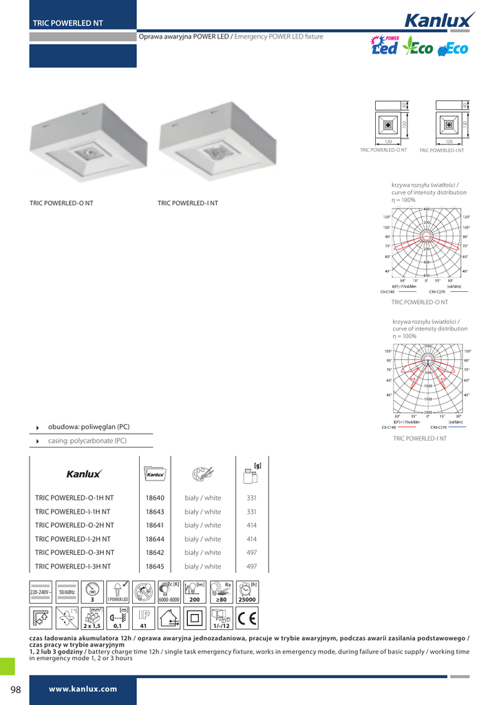 TRIC POWERLED NT 120 120 40 40 Oprawa awaryjna POWER LED / Emergency POWER LED fixture 120 120 TRIC POWERLED-O NT TRIC POWERLED-O NT TRIC POWERLED-I NT krzywa rozsyłu światłości / curve of intensity distribution η = 100% TRIC POWERLED-I NT TRIC POWERLED-O NT krzywa rozsyłu światłości / curve of intensity distribution η = 100% obudowa: poliwęglan (PC) TRIC POWERLED-I NT casing: polycarbonate (PC) TRIC POWERLED-O-1H NT 18640 biały / white 331 331 TRIC POWERLED-I-1H NT 18643 biały / white TRIC POWERLED-O-2H NT 18641 biały / white 414 TRIC POWERLED-I-2H NT 18644 biały / white 414 TRIC POWERLED-O-3H NT 18642 biały / white 497 TRIC POWERLED-I-3H NT 18645 biały / white 497 220-240V~ 50/60Hz 3 1 POWER LED 2 x 1,5 0,1 6000-8000 41 200 ≥80 25000 1/-/12 czas ładowania akumulatora 12h / oprawa awaryjna jednozadaniowa, pracuje w trybie awaryjnym, podczas awarii zasilania podstawowego / czas pracy w trybie awaryjnym 1, 2 lub 3 godziny / battery charge time 12h / single task emergency fixture, works in emergency mode, during failure of basic supply / working time in emergency mode 1, 2 or 3 hours 98 www.kanlux.com