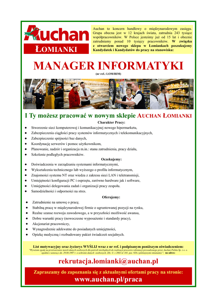 ŁOMIANKI Auchan to koncern handlowy o międzynarodowym zasięgu. Grupa obecna jest w 12 krajach świata, zatrudnia 243 tysiące współpracowników. W Polsce jesteśmy już od 15 lat i obecnie zatrudniamy ponad 10 tysięcy pracowników. W związku z otwarciem nowego sklepu w Łomiankach poszukujemy Kandydatek i Kandydatów do pracy na stanowisku: MANAGER INFORMATYKI (nr ref.: LOM/RIM) I Ty możesz pracować w nowym sklepie AUCHAN ŁOMIANKI Charakter Pracy: Stworzenie sieci komputerowej i komunikacyjnej nowego hipermarketu, Zabezpieczenia ciągłości pracy systemów informatycznych i telekomunikacyjnych, Zabezpieczenie spójności baz danych, Koordynację serwerów i pomoc użytkownikom, Planowanie, nadzór i organizacja m.in.: stanu zatrudnienia, pracy działu, Szkolenie podległych pracowników. Oczekujemy: Doświadczenia w zarządzaniu systemami informatycznymi, Wykształcenia technicznego lub wyższego o profilu informatycznym, Znajomości systemu NT oraz wiedza z zakresu sieci LAN i teletransmisji, Umiejętności konfiguracji PC i osprzętu, zarówno hardware jak i software, Umiejętności delegowania zadań i organizacji pracy zespołu. Samodzielności i odporności na stres. Oferujemy: Zatrudnienie na umowę o pracę. Stabilną pracę w międzynarodowej firmie o ugruntowanej pozycji na rynku, Realne szanse rozwoju zawodowego, a w przyszłości możliwość awansu, Dobre warunki pracy (nowoczesne wyposażenie i standardy pracy), Akcjonariat pracowniczy, Wynagrodzenie adekwatne do posiadanych umiejętności, Opiekę medyczną i rozbudowany pakiet świadczeń socjalnych. List motywacyjny oraz życiorys WYŚLIJ wraz z nr ref. i podpisanym poniższym oświadczeniem: "Wyrażam zgodę na przetwarzanie moich danych osobowych dla potrzeb niezbędnych do realizacji procesów rekrutacji prowadzonego przez Auchan Polska Sp. z o. o. zgodnie z ustawą z dn. 29.08.1997 r. o ochronie danych osobowych, (Dz. U. z 2002 nr 101. poz. 926 z późniejszymi zmianami).", na adres: [email protected] Zapraszamy do zapoznania się z aktualnymi ofertami pracy na stronie: www.auchan.pl/praca