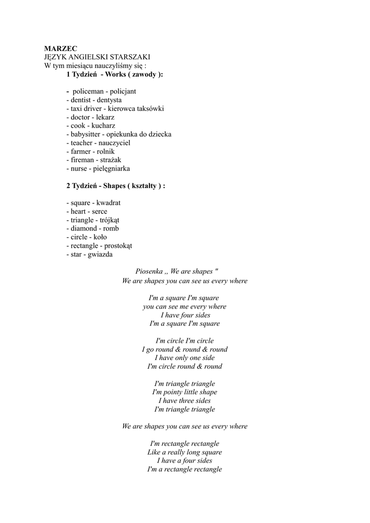 MARZEC JĘZYK ANGIELSKI STARSZAKI W tym miesiącu nauczyliśmy się : 1 Tydzień - Works ( zawody ): - policeman - policjant - dentist - dentysta - taxi driver - kierowca taksówki - doctor - lekarz - cook - kucharz - babysitter - opiekunka do dziecka - teacher - nauczyciel - farmer - rolnik - fireman - strażak - nurse - pielęgniarka 2 Tydzień - Shapes ( kształty ) : - square - kwadrat - heart - serce - triangle - trójkąt - diamond - romb - circle - koło - rectangle - prostokąt - star - gwiazda Piosenka ,, We are shapes " We are shapes you can see us every where I'm a square I'm square you can see me every where I have four sides I'm a square I'm square I'm circle I'm circle I go round & round & round I have only one side I'm circle round & round I'm triangle triangle I'm pointy little shape I have three sides I'm triangle triangle We are shapes you can see us every where I'm rectangle rectangle Like a really long square I have a four sides I'm a rectangle rectangle I'm a star I'm star in the sky so far I have five pointy arms I'm star I'm star I am a heart I am a heart I'm so curvy I'm so smart I'm a really lovely shape I'm a heart I'm a heart I'm a diamond I'm a diamond You can see me on a ring I'm so shiny I'm so bright I'm a diamond I'm a diamond We are shapes you can see us every where. 3 Tydzień - Days of the week ( dni tygodnia ) - Monday - poniedziałek - Tuesday - wtorek - Wednesday - środa - Thursday - czwartek - Friday - piątek - Saturday - sobota - Sunday - niedziela 4 Tydzień - Opposites cz. I ( przeciwieństwa cz.I ) - big - duży - small -mały - open - otwarty - close - zamknięty - fast - szybko - slow - powoli - pleas - proszę - no, thank you - nie, dziękuje - loud - głośno - quiet - cicho - peek - a - boo - a kuku Piosenka ,, Open shut them " Open shut them, open shut them. Give a little clap, clap, clap. Open shut them, open shut them. Put them in your lap, lap, lap. Big and small. Big and small. Big and small. Big, big, big, big, small, small, small. Big and small. Big and small. Big, big, big, big, small, small, small. Please. No, thank you. Please. No, thank you. Please. No, thank you. Please, please, please, please. No thank you. Please. No, thank you. Please. No, thank you. Please, please, please, please. No thank you. Fast and slow. Fast and slow. Fast and slow. Fast, fast, fast, fast, slow, slow, slow. Fast and slow. Fast and slow. Fast, fast, fast, fast, slow, slow, slow. Loud and quiet. Loud and quiet. Loud and quiet. Loud, loud, loud, loud. Shh... Quiet. Loud and quiet. Loud and quiet. Loud, loud, loud, loud. Shh... Quiet. Peek-a-boo. Peek-a-boo. Peek-a-boo. Peek-a, peek-a, peek-a-boo! Peek-a-boo. Peek-a-boo. Peek-a, peek-a, peek-a-boo!