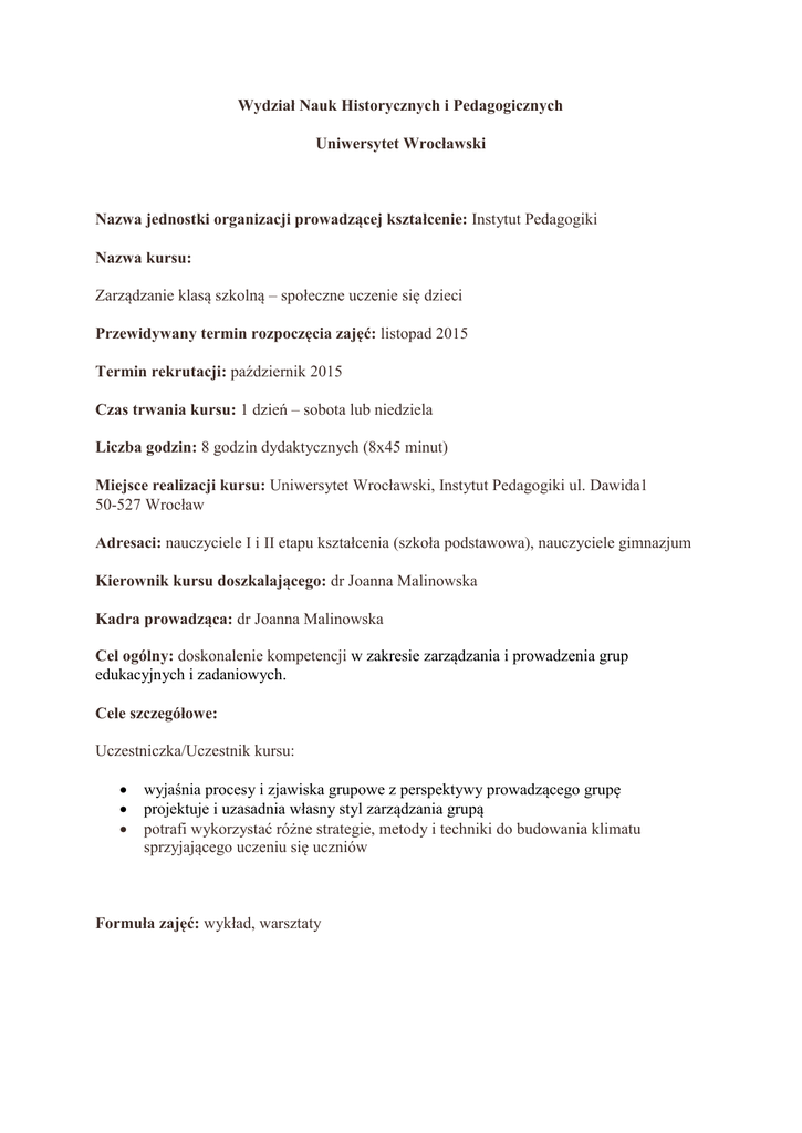 Wydział Nauk Historycznych i Pedagogicznych Uniwersytet Wrocławski Nazwa jednostki organizacji prowadzącej kształcenie: Instytut Pedagogiki Nazwa kursu: Zarządzanie klasą szkolną – społeczne uczenie się dzieci Przewidywany termin rozpoczęcia zajęć: listopad 2015 Termin rekrutacji: październik 2015 Czas trwania kursu: 1 dzień – sobota lub niedziela Liczba godzin: 8 godzin dydaktycznych (8x45 minut) Miejsce realizacji kursu: Uniwersytet Wrocławski, Instytut Pedagogiki ul. Dawida1 50-527 Wrocław Adresaci: nauczyciele I i II etapu kształcenia (szkoła podstawowa), nauczyciele gimnazjum Kierownik kursu doszkalającego: dr Joanna Malinowska Kadra prowadząca: dr Joanna Malinowska Cel ogólny: doskonalenie kompetencji w zakresie zarządzania i prowadzenia grup edukacyjnych i zadaniowych. Cele szczegółowe: Uczestniczka/Uczestnik kursu: wyjaśnia procesy i zjawiska grupowe z perspektywy prowadzącego grupę projektuje i uzasadnia własny styl zarządzania grupą potrafi wykorzystać różne strategie, metody i techniki do budowania klimatu sprzyjającego uczeniu się uczniów Formuła zajęć: wykład, warsztaty Plan kursu doszkalającego: Lp. Blok tematyczny 1. Teoretyczne podstawy tworzenia grup i zespołów Style zarządzania klasą szkolną Klimat klasy a społeczne uczenie się uczniów 2. 3. Liczba godzin wykładów 2 Liczba godzin warsztatów 4 2 Program kursu doszkalającego: Blok I Teoretyczne podstawy tworzenia grup i zespołów Tworzenie i prowadzenie grup zadaniowych i projektowych Podstawowe procesy i zjawiska grupowe oraz ich dynamika Sposoby zapobiegania i radzenia sobie ze zjawiskami zakłócającymi pracę w grupie Blok II Style zarządzania klasą szkolną 7 stylów zarządzania klasą szkolną Cele i środki zarządzania Ludzie, warunki i procedury jako elementy zarządzania Projektowanie własnego stylu zarządzania klasą jako małą grupą społeczną Blok III Klimat klasy a społeczne uczenie się uczniów Współpraca i współzawodnictwo jako odmienne strategie edukacyjne Warunki współpracy wewnątrzgrupowej i międzygrupowej Podmiotowy styl interakcji Warunki ukończenia kursu doszkalającego: aktywne uczestnictwo w pracach grupy, obecność na zajęciach Przewidywana liczba uczestników: 20 uczestników, minimum 15 osób Koszt kursu: 150 zł/osoba