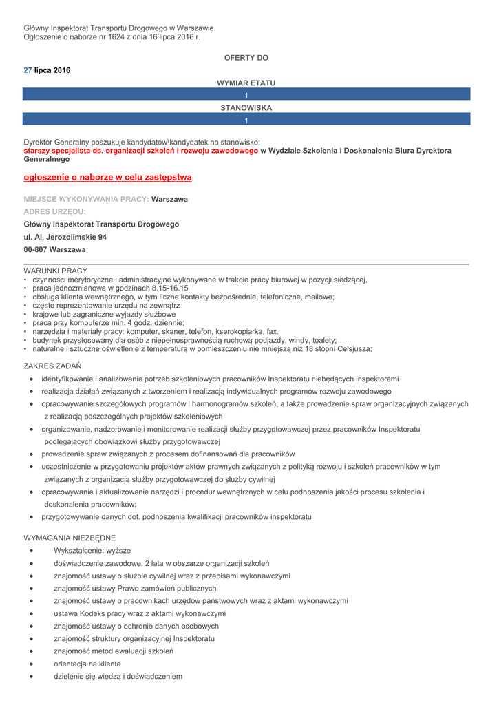 Główny Inspektorat Transportu Drogowego w Warszawie Ogłoszenie o naborze nr 1624 z dnia 16 lipca 2016 r. OFERTY DO 27 lipca 2016 WYMIAR ETATU 1 STANOWISKA 1 Dyrektor Generalny poszukuje kandydatów\kandydatek na stanowisko: starszy specjalista ds. organizacji szkoleń i rozwoju zawodowego w Wydziale Szkolenia i Doskonalenia Biura Dyrektora Generalnego ogłoszenie o naborze w celu zastępstwa MIEJSCE WYKONYWANIA PRACY: Warszawa ADRES URZĘDU: Główny Inspektorat Transportu Drogowego ul. Al. Jerozolimskie 94 00-807 Warszawa WARUNKI PRACY • czynności merytoryczne i administracyjne wykonywane w trakcie pracy biurowej w pozycji siedzącej, • praca jednozmianowa w godzinach 8.15-16.15 • obsługa klienta wewnętrznego, w tym liczne kontakty bezpośrednie, telefoniczne, mailowe; • częste reprezentowanie urzędu na zewnątrz • krajowe lub zagraniczne wyjazdy służbowe • praca przy komputerze min. 4 godz. dziennie; • narzędzia i materiały pracy: komputer, skaner, telefon, kserokopiarka, fax. • budynek przystosowany dla osób z niepełnosprawnością ruchową podjazdy, windy, toalety; • naturalne i sztuczne oświetlenie z temperaturą w pomieszczeniu nie mniejszą niż 18 stopni Celsjusza; ZAKRES ZADAŃ identyfikowanie i analizowanie potrzeb szkoleniowych pracowników Inspektoratu niebędących inspektorami realizacja działań związanych z tworzeniem i realizacją indywidualnych programów rozwoju zawodowego opracowywanie szczegółowych programów i harmonogramów szkoleń, a także prowadzenie spraw organizacyjnych związanych organizowanie, nadzorowanie i monitorowanie realizacji służby przygotowawczej przez pracowników Inspektoratu z realizacją poszczególnych projektów szkoleniowych podlegających obowiązkowi służby przygotowawczej prowadzenie spraw związanych z procesem dofinansowań dla pracowników uczestniczenie w przygotowaniu projektów aktów prawnych związanych z polityką rozwoju i szkoleń pracowników w tym związanych z organizacją służby przygotowawczej do służby cywilnej opracowywanie i aktualizowanie narzędzi i procedur wewnętrznych w celu podnoszenia jakości procesu szkolenia i doskonalenia pracowników; przygotowywanie danych dot. podnoszenia kwalifikacji pracowników inspektoratu WYMAGANIA NIEZBĘDNE Wykształcenie: wyższe doświadczenie zawodowe: 2 lata w obszarze organizacji szkoleń znajomość ustawy o służbie cywilnej wraz z przepisami wykonawczymi znajomość ustawy Prawo zamówień publicznych znajomość ustawy o pracownikach urzędów państwowych wraz z aktami wykonawczymi ustawa Kodeks pracy wraz z aktami wykonawczymi znajomość ustawy o ochronie danych osobowych znajomość struktury organizacyjnej Inspektoratu znajomość metod ewaluacji szkoleń orientacja na klienta dzielenie się wiedzą i doświadczeniem komunikatywność współpraca w zespole samodzielność organizacja pracy własnej orientacja na rezultaty rozwiązywanie problemów Posiadanie obywatelstwa polskiego Korzystanie z pełni praw publicznych Nieskazanie prawomocnym wyrokiem za umyślne przestępstwo lub umyśle przestępstwo skarbowe WYMAGANIA DODATKOWE Wykształcenie: wyższe w zakresie socjologii, psychologii lub pedagogiki język: angielski (na poziomie B2) DOKUMENTY I OŚWIADCZENIA NIEZBĘDNE Życiorys/CV i list motywacyjny Kopie dokumentów potwierdzających spełnienie wymagania niezbędnego w zakresie wykształcenia Kopie dokumentów potwierdzających spełnienie wymagania niezbędnego w zakresie doświadczenia zawodowego / stażu pracy Oświadczenie o posiadaniu obywatelstwa polskiego albo kopia dokumentu potwierdzającego posiadanie polskiego obywatelstwa Oświadczenie o wyrażeniu zgody na przetwarzanie danych osobowych do celów naboru Oświadczenie o korzystaniu z pełni praw publicznych Oświadczenie o nieskazaniu prawomocnym wyrokiem za umyślne przestępstwo lub umyślne przestępstwo skarbowe DOKUMENTY I OŚWIADCZENIA DODATKOWE kopia dokumentu potwierdzającego niepełnosprawność - w przypadku kandydatek/kandydatów, zamierzających skorzystać z pierwszeństwa w zatrudnieniu w przypadku, gdy znajdą się w gronie najlepszych kandydatek/kandydatów Kopie dokumentów potwierdzających spełnienie wymagania dodatkowego w zakresie wykształcenia TERMINY I MIEJSCE SKŁADANIA DOKUMENTÓW Dokumenty należy złożyć do: 27 lipca 2016 r. Decyduje data: stempla pocztowego / osobistego dostarczenia oferty do urzędu Miejsce składania dokumentów: Główny Inspektorat Transportu Drogowego Biuro Dyrektora Generalnego Al. Jerozolimskie 94; 00-807 Warszawa z dopiskiem na kopercie i w liście motywacyjny: BDG.110.37.2016.0363 INNE INFORMACJE: W miesiącu poprzedzającym datę upublicznienia ogłoszenia wskaźnik zatrudnienia osób niepełnosprawnych w urzędzie, w rozumieniu przepisów o rehabilitacji zawodowej i społecznej oraz zatrudnianiu osób niepełnosprawnych, nie wynosi co najmniej 6%. Prosimy o napisanie w liście motywacyjnym, jakiego ogłoszenia dotyczy oferta–numer podany w „miejscu składania dokumentów”. Kandydaci zakwalifikowani zostaną powiadomieni o terminie postępowania rekrutacyjnego. Oferty przesłane drogą elektroniczną nie opatrzone bezpiecznym podpisem elektronicznym lub faksem lub otrzymane po terminie lub nie spełniające wymagań określonych w ogłoszeniu nie będą rozpatrywane. Oferty odrzucone zostaną komisyjnie zniszczone. Przyjmujemy tylko kserokopie dokumentów. W przypadku wpływu dużej liczby ofert, Urząd zastrzega sobie możliwość rozsyłania informacji o terminie postępowania rekrutacyjnego wyłącznie drogą e-mailową. W sytuacji braku dostępu kandydata do poczty elektronicznej, prosimy o zamieszczenie takiej informacji wraz z telefonem kontaktowym w liście motywacyjnym. Weryfikacja spełniania przez kandydatów wymagań formalnych dokonana zostanie na podstawie dokumentów wymienionych w części „wymagane dokumenty i oświadczenia”. Za kompletne oferty uznane będą oferty, 