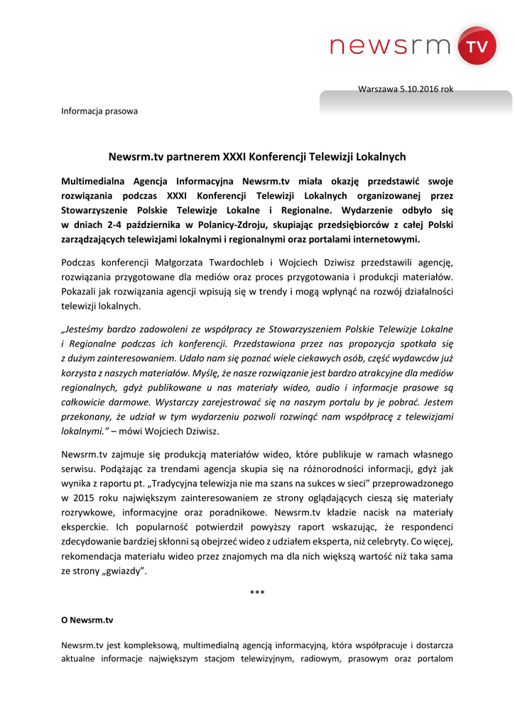 Warszawa 5.10.2016 rok Informacja prasowa Newsrm.tv partnerem XXXI Konferencji Telewizji Lokalnych Multimedialna Agencja Informacyjna Newsrm.tv miała okazję przedstawić swoje rozwiązania podczas XXXI Konferencji Telewizji Lokalnych organizowanej przez Stowarzyszenie Polskie Telewizje Lokalne i Regionalne. Wydarzenie odbyło się w dniach 2-4 października w Polanicy-Zdroju, skupiając przedsiębiorców z całej Polski zarządzających telewizjami lokalnymi i regionalnymi oraz portalami internetowymi. Podczas konferencji Małgorzata Twardochleb i Wojciech Dziwisz przedstawili agencję, rozwiązania przygotowane dla mediów oraz proces przygotowania i produkcji materiałów. Pokazali jak rozwiązania agencji wpisują się w trendy i mogą wpłynąć na rozwój działalności telewizji lokalnych. „Jesteśmy bardzo zadowoleni ze współpracy ze Stowarzyszeniem Polskie Telewizje Lokalne i Regionalne podczas ich konferencji. Przedstawiona przez nas propozycja spotkała się z dużym zainteresowaniem. Udało nam się poznać wiele ciekawych osób, część wydawców już korzysta z naszych materiałów. Myślę, że nasze rozwiązanie jest bardzo atrakcyjne dla mediów regionalnych, gdyż publikowane u nas materiały wideo, audio i informacje prasowe są całkowicie darmowe. Wystarczy zarejestrować się na naszym portalu by je pobrać. Jestem przekonany, że udział w tym wydarzeniu pozwoli rozwinąć nam współpracę z telewizjami lokalnymi.” – mówi Wojciech Dziwisz. Newsrm.tv zajmuje się produkcją materiałów wideo, które publikuje w ramach własnego serwisu. Podążając za trendami agencja skupia się na różnorodności informacji, gdyż jak wynika z raportu pt. „Tradycyjna telewizja nie ma szans na sukces w sieci” przeprowadzonego w 2015 roku największym zainteresowaniem ze strony oglądających cieszą się materiały rozrywkowe, informacyjne oraz poradnikowe. Newsrm.tv kładzie nacisk na materiały eksperckie. Ich popularność potwierdził powyższy raport wskazując, że respondenci zdecydowanie bardziej skłonni są obejrzeć wideo z udziałem eksperta, niż celebryty. Co więcej, rekomendacja materiału wideo przez znajomych ma dla nich większą wartość niż taka sama ze strony „gwiazdy”. *** O Newsrm.tv Newsrm.tv jest kompleksową, multimedialną agencją informacyjną, która współpracuje i dostarcza aktualne informacje największym stacjom telewizyjnym, radiowym, prasowym oraz portalom internetowym w Polsce i za granicą. Jej rozmówcami są najważniejsze osoby w państwie, w tym politycy, prezesi instytucji państwowych i firm oraz analitycy, eksperci rynku jak również przedstawiciele świata kultury. Ekipy reporterskie Newsrm.tv starają się być zawsze tam gdzie tworzy się informacja a materiały regularnie wykorzystują między innymi: Polsat, TVN, Onet, WP, Interia, Bankier oraz inne ogólnopolskie media. Agencja prowadzi również portal, którego użytkownikami są głównie dziennikarze, a baza zalogowanych użytkowników liczy już prawie 4000 osób. Oferuje materiały video, w najwyższej jakości obrazu i dźwięku, oraz komunikaty prasowe, które można pobrać bezpłatnie z naszej strony internetowej www.newsrm.tv. Więcej informacji udziela: Jakub Rykowski Newsrm.tv ul. Marszałkowska 140/46, 00-061 Warszawa tel. 22 126 90 88 [email protected]