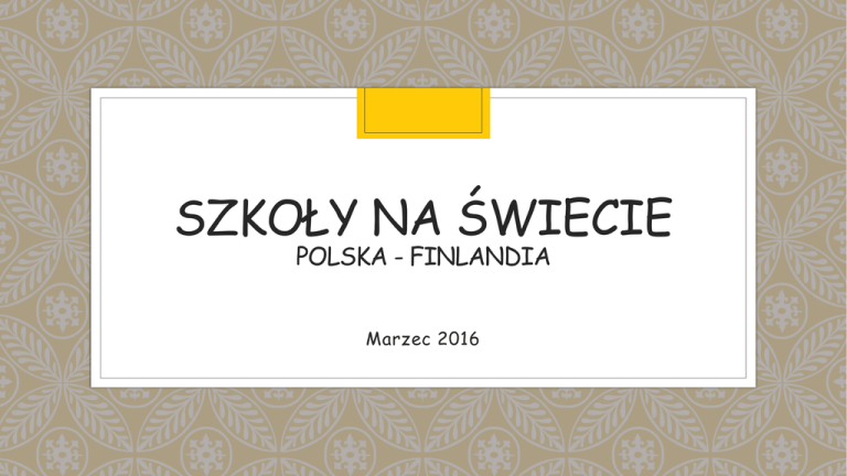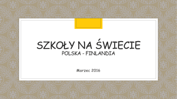 SZKOŁY NA ŚWIECIE POLSKA - FINLANDIA Marzec 2016 W marcu doczekaliśmy się ferii wielkanocnych i mieliśmy tydzień wolnego Spędziliśmy w domach Święta Wielkanocne… … które wymagały wielu przygotowań, bo w Niedzielę Palmową poszliśmy z palmami do kościoła… Najdłuższe palmy w Polsce robią Kurpiowie (północno-wschodnia część Polski) – ich palmy mają po kilka metrów wysokości … Nasze palmy są dużo skromniejsze… Wcześniej też przygotowujemy pisanki… pięknie ozdobione wkładamy do koszyczka. I święcimy pokarmy w koszyczkach… …. a muszą się w nim znaleźć: jajka, chleb, kiełbasa i sól. W Niedzielę Wielkanocną siadamy do uroczystego śniadania świątecznego, wtedy spotyka się cała rodzina i trzeba odwiedzić wszystkich dziadków i babcie A w Lany Poniedziałek, aby zapewnić sobie urodę i zdrowie trzeba dać się polać wodą. Niektórzy trochę przesadzają… Wiosna to czas radości, trzeba pozbyć się zimowego lenistwa, więc pierwszego dnia wiosny niektórzy „topią Marzannę”. Marzanna symbolizuje odchodzącą zimę, którą trzeba pożegnać na dobre w szkole możemy się pięknie przebrać, bo kto przebrany – nie pytany… …lub trenować brazylijskie sztuki walki z Mestre Marinaldo. Wiosną chętnie wyjeżdżamy na wycieczki szkolne. Uczniowie klasy II a i II f w marcu wybrali się do warszawskiego Teatru Guliwer oraz Centrum Nauki Kopernik. W marcu Alicja z 3 klasy najskuteczniej zareklamowała książkę Pitu i Kudłata w opałach Leszka Talko … i zajęła pierwsze miejsce! Gratulacje!!! A Karol z 4 klasy zrobił najlepsze zdjęcie przedstawiąjące Zimowe czytanie… Ola z 5 klasy zajęła drugie miejsce – gratulacje! Wystawa zdjęć pt. Zimowe czytanie podobała się uczniom naszej szkoły… A to marcowy widok na naszą rzekę Bzurę Przygotowały: Joanna Dobkowska Justyna Pęsiek Klasa 2f Tłumaczenie: Monika Małolepsza Sochaczew, marzec, 2016