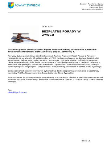 Starostwo Powiatowe w Żywcu ul. Krasińskiego 13 +48 33 860 50 23 [email protected] 08.10.2014 BEZPŁATNE PORADY W ŻYWCU Gratisową pomoc prawną uzyskać będzie można od połowy października w siedzibie Towarzystwa Miłośników Ziemi Żywieckiej przy ul. Zamkowej 4. Pierwszy dyżur specjalistów z bielskiej Kancelarii Radców Prawnych Marek Płonka & Partnerzy rozpocznie się we wtorek, 14 października, o 17.00. Następne odbywały się będą co tydzień o tej samej porze. Dyżury będą miały charakter sondażowy i potrwają miesiąc. Jeśli zainteresowanie okaże się odpowiednio duże, będą kontynuowane. Chętni będą mogli pytać o zawiłości związane z kwestiami majątkowymi, konfliktami rodzinnymi i sąsiedzkimi, o możliwości rozwiązania trudnych spraw spornych z instytucjami i urzędami oraz inne problemy wchodzące w zakres prawa cywilnego. Zorganizowanie bezpłatnych dyżurów było możliwe dzięki podpisaniu porozumienia o współpracy pomiędzy TMZŻ a Stowarzyszeniem Przedsiębiorców Ziemi Żywieckiej. Przypominamy, że obie organizacje spowodowały uruchomienie, również w siedzibie towarzystwa, od września, dyżurów Powiatowego Rzecznika Konsumentów w Żywcu – o 11.00 w każdy trzeciczwartek miesiąca. foto olowski-lex.firmy.net Strona 1/1 Powered by TCPDF (www.tcpdf.org)