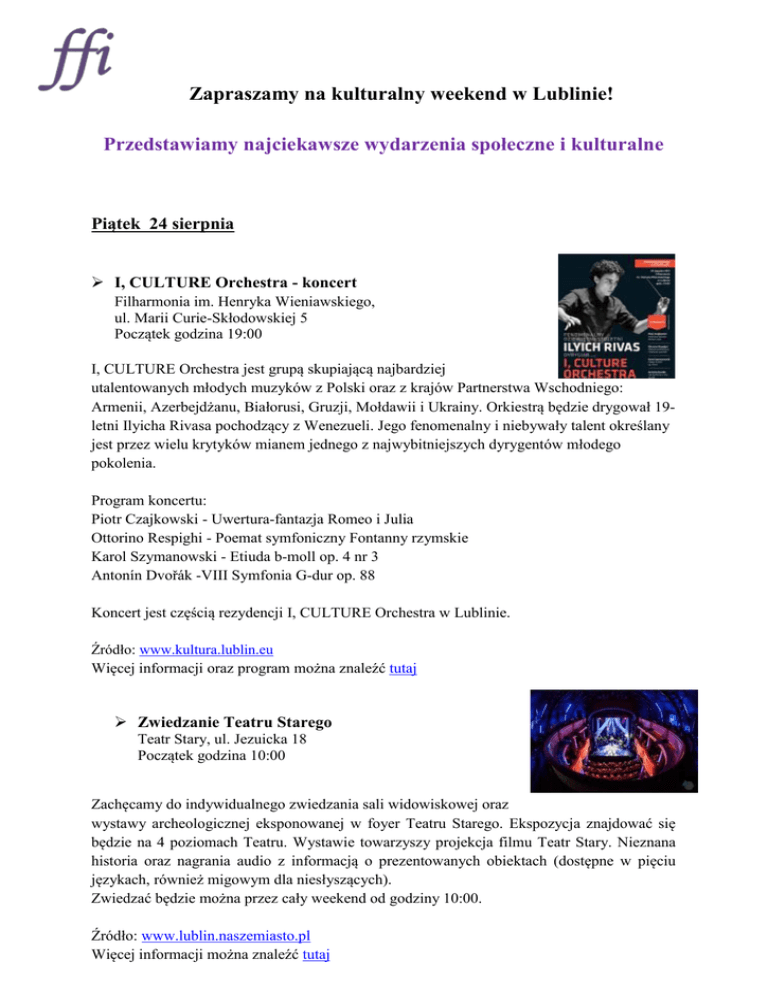 Zapraszamy na kulturalny weekend w Lublinie! Przedstawiamy najciekawsze wydarzenia społeczne i kulturalne Piątek 24 sierpnia I, CULTURE Orchestra - koncert Filharmonia im. Henryka Wieniawskiego, ul. Marii Curie-Skłodowskiej 5 Początek godzina 19:00 I, CULTURE Orchestra jest grupą skupiającą najbardziej utalentowanych młodych muzyków z Polski oraz z krajów Partnerstwa Wschodniego: Armenii, Azerbejdżanu, Białorusi, Gruzji, Mołdawii i Ukrainy. Orkiestrą będzie drygował 19letni Ilyicha Rivasa pochodzący z Wenezueli. Jego fenomenalny i niebywały talent określany jest przez wielu krytyków mianem jednego z najwybitniejszych dyrygentów młodego pokolenia. Program koncertu: Piotr Czajkowski - Uwertura-fantazja Romeo i Julia Ottorino Respighi - Poemat symfoniczny Fontanny rzymskie Karol Szymanowski - Etiuda b-moll op. 4 nr 3 Antonín Dvořák -VIII Symfonia G-dur op. 88 Koncert jest częścią rezydencji I, CULTURE Orchestra w Lublinie. Źródło: www.kultura.lublin.eu Więcej informacji oraz program można znaleźć tutaj Zwiedzanie Teatru Starego Teatr Stary, ul. Jezuicka 18 Początek godzina 10:00 Zachęcamy do indywidualnego zwiedzania sali widowiskowej oraz wystawy archeologicznej eksponowanej w foyer Teatru Starego. Ekspozycja znajdować się będzie na 4 poziomach Teatru. Wystawie towarzyszy projekcja filmu Teatr Stary. Nieznana historia oraz nagrania audio z informacją o prezentowanych obiektach (dostępne w pięciu językach, również migowym dla niesłyszących). Zwiedzać będzie można przez cały weekend od godziny 10:00. Źródło: www.lublin.naszemiasto.pl Więcej informacji można znaleźć tutaj Cykl pokazów "Kino w Browarze" Perła - Browary Lubelskie S.A., ul. Bernardyńska 15 Początek: po zachodzie słońca Cykl bezpłatnych projekcji filmowych organizowanych przez Fundację ArtLink, będzie można obejrzeć na terenie lubelskiego browaru przy ul. Bernardyńskiej 15. Sponsorem całego przedsięwzięcia jest „Perła” Browary Lubelskie SA. W programie na weekend przewidziane są takie projekcje jak: Piątek: „Nie lubię poniedziałku”- Reżyseria: Tadeusz Chmielewski Sobota: „Hotel Ruandae”- Reżyseria: Terry George Niedziela: „Niczego nie żałuję”- Edith Piaf- Reżyseria: Olivier Dahan Źródło: www.mmlublin.pl Więcej informacji można znaleźć tutaj Sobota 25 sierpnia Wystawa „Brzegi Wisły. Wielka historia wsi i miasteczek Powiśla od Sandomierza do Stężycy” Muzeum Lubelskie, ul. Zamkowa 9 Początek godzina 10:00 Ekspozycja przybliża jedne z najpiękniejszych i najważniejszych historycznie ziem polskich i ich położone po obu brzegach Wisły miejscowości. Większość z nich zlokalizowana jest w unikatowej w skali europejskiej dolinie Małopolskiego Przełomu Wisły, uważanego za najciekawszy krajobrazowo fragment królowej polskich rzek. Źródło: www.lublin.naszemiasto.pl Więcej informacji można znaleźć tutaj Niedziela 26 sierpnia Niedzielny poranek filmowy – pokaz animacji Galeria Labirynt, ul. Grodzka 5a Początek godzina 12:00-13:00 Warsztaty edukacyjne są propozycją twórczego spędzania wolnego czasu dla najmłodszych w wieku 4-11 lat. W każdą ostatnią niedzielę miesiąca Galeria Labirynt pokazuje filmy animowane, które stanowią alternatywę dla współczesnych bajek telewizyjnych. Filmy te nie tylko bawią, ale i uczą. Źródło: www.lublin.naszemiasto.pl Więcej informacji można znaleźć tutaj Projekt "O-Twórz Lublin!" - "Wzgórza Lublina" Stare Miasto-Plac po Farze Początek godzina 17:00 Stowarzyszenie Grupa Projekt zaprasza wszystkich Lublinian, miłośników fotografii otworkowej, a także sympatyków projektu "O-Twórz Lublin!", na drugą edycję spotkań z fotografią, historią, pięknem i duszą naszego miasta, Lublina. Nawiązując do legendy Lublina – miasta wzniesionego na siedmiu wzgórzach, będziemy zachęcać uczestników projektu do odnajdywania w topografii miasta „założycielskich wzniesień” i spoglądania na miasto właśnie z tych monumentalnych perspektyw. Zapraszamy na stronę organizatora: www.openlublin.eu Źródło: www.kultura.lublin.eu Więcej informacji można znaleźć tutaj Dożynki dworskie Muzeum Wsi Lubelskiej, al. Aleja Warszawska 96 Lublin Początek godz. 14:00 W najbliższą niedzielę w Muzeum Wsi Lubelskiej odbędą się Dożynki dworskie przywołujące tradycyjne zwyczaje dożynkowe. W programie m.in. dożynkowa Msza Święta z poświęceniem wieńców, inscenizacja dożynek dworskich, przejście orszaku dożynkowego oraz koncerty muzyczne. Źródło: www.kultura.lublin.eu Więcej informacji można znaleźć tutaj