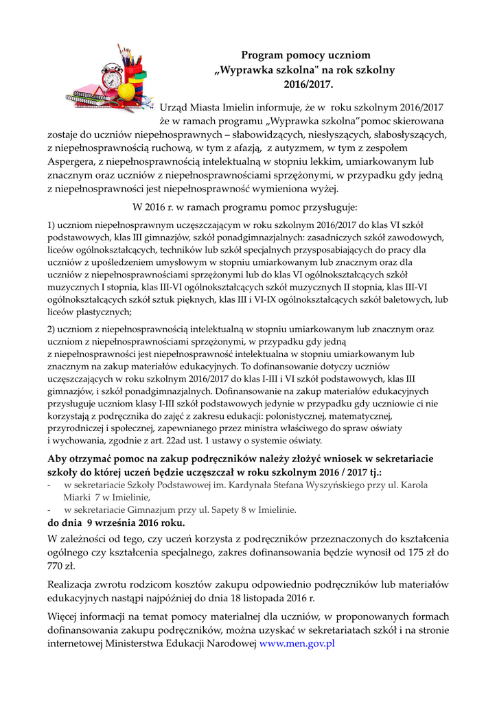 Program pomocy uczniom „Wyprawka szkolna" na rok szkolny 2016/2017. Urząd Miasta Imielin informuje, że w roku szkolnym 2016/2017 że w ramach programu „Wyprawka szkolna”pomoc skierowana zostaje do uczniów niepełnosprawnych – słabowidzących, niesłyszących, słabosłyszących, z niepełnosprawnością ruchową, w tym z afazją, z autyzmem, w tym z zespołem Aspergera, z niepełnosprawnością intelektualną w stopniu lekkim, umiarkowanym lub znacznym oraz uczniów z niepełnosprawnościami sprzężonymi, w przypadku gdy jedną z niepełnosprawności jest niepełnosprawność wymieniona wyżej. W 2016 r. w ramach programu pomoc przysługuje: 1) uczniom niepełnosprawnym uczęszczającym w roku szkolnym 2016/2017 do klas VI szkół podstawowych, klas III gimnazjów, szkół ponadgimnazjalnych: zasadniczych szkół zawodowych, liceów ogólnokształcących, techników lub szkół specjalnych przysposabiających do pracy dla uczniów z upośledzeniem umysłowym w stopniu umiarkowanym lub znacznym oraz dla uczniów z niepełnosprawnościami sprzężonymi lub do klas VI ogólnokształcących szkół muzycznych I stopnia, klas III-VI ogólnokształcących szkół muzycznych II stopnia, klas III-VI ogólnokształcących szkół sztuk pięknych, klas III i VI-IX ogólnokształcących szkół baletowych, lub liceów plastycznych; 2) uczniom z niepełnosprawnością intelektualną w stopniu umiarkowanym lub znacznym oraz uczniom z niepełnosprawnościami sprzężonymi, w przypadku gdy jedną z niepełnosprawności jest niepełnosprawność intelektualna w stopniu umiarkowanym lub znacznym na zakup materiałów edukacyjnych. To dofinansowanie dotyczy uczniów uczęszczających w roku szkolnym 2016/2017 do klas I-III i VI szkół podstawowych, klas III gimnazjów, i szkół ponadgimnazjalnych. Dofinansowanie na zakup materiałów edukacyjnych przysługuje uczniom klasy I-III szkół podstawowych jedynie w przypadku gdy uczniowie ci nie korzystają z podręcznika do zajęć z zakresu edukacji: polonistycznej, matematycznej, przyrodniczej i społecznej, zapewnianego przez ministra właściwego do spraw oświaty i wychowania, zgodnie z art. 22ad ust. 1 ustawy o systemie oświaty. Aby otrzymać pomoc na zakup podręczników należy złożyć wniosek w sekretariacie szkoły do której uczeń będzie uczęszczał w roku szkolnym 2016 / 2017 tj.: - w sekretariacie Szkoły Podstawowej im. Kardynała Stefana Wyszyńskiego przy ul. Karola Miarki 7 w Imielinie, w sekretariacie Gimnazjum przy ul. Sapety 8 w Imielinie. do dnia 9 września 2016 roku. W zależności od tego, czy uczeń korzysta z podręczników przeznaczonych do kształcenia ogólnego czy kształcenia specjalnego, zakres dofinansowania będzie wynosił od 175 zł do 770 zł. Realizacja zwrotu rodzicom kosztów zakupu odpowiednio podręczników lub materiałów edukacyjnych nastąpi najpóźniej do dnia 18 listopada 2016 r. Więcej informacji na temat pomocy materialnej dla uczniów, w proponowanych formach dofinansowania zakupu podręczników, można uzyskać w sekretariatach szkół i na stronie internetowej Ministerstwa Edukacji Narodowej www.men.gov.pl