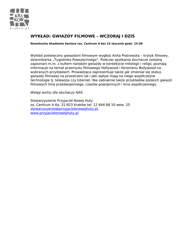 WYKŁAD: GWIAZDY FILMOWE – WCZORAJ I DZIŚ Nowohucka Akademia Seniora (os. Centrum A 6a) 23 stycznia godz. 15.00 Wykład poświęcony gwiazdom filmowym wygłosi Anita Piotrowska – krytyk filmowy, dziennikarka „Tygodnika Powszechnego”. Podczas spotkania słuchacze zostaną zapoznani m.in. z kultem narodzin gwiazdy w kontekście mitologii i religii, poznają informacje na temat przemysłu filmowego Hollywood i fenomenu Bollywood na wybranych przykładach. Prowadząca zaprezentuje także jak zmieniał się status gwiazdy filmowej na przestrzeni lat i jaki wpływ mają na niego współczesne technologie tj. telewizja czy Internet. Nie zabraknie także przykładów polskich gwiazd filmowych kina przedwojennego, czasów powojennych i kina współczesnego. Wstęp wolny dla słuchaczy NAS. Stowarzyszenie Przyjaciół Nowej Huty os. Centrum A 6a, 31-923 Kraków tel. 12 644 68 10 wew. 25 [email protected], www.przyjacielenowejhuty.pl Powered by TCPDF (www.tcpdf.org)