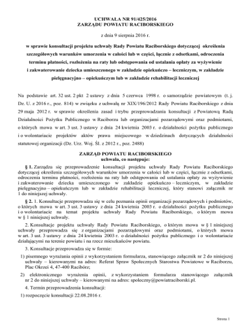 UCHWAŁA NR 91/425/2016 ZARZĄDU POWIATU RACIBORSKIEGO z dnia 9 sierpnia 2016 r. w sprawie konsultacji projektu uchwały Rady Powiatu Raciborskiego dotyczącej określenia szczegółowych warunków umorzenia w całości lub w części, łącznie z odsetkami, odroczenia terminu płatności, rozłożenia na raty lub odstępowania od ustalania opłaty za wyżywienie i zakwaterowanie dziecka umieszczonego w zakładzie opiekuńczo – leczniczym, w zakładzie pielęgnacyjno – opiekuńczym lub w zakładzie rehabilitacji leczniczej Na podstawie art. 32 ust. 2 pkt 2 ustawy z dnia 5 czerwca 1998 r. o samorządzie powiatowym (t. j. Dz. U. z 2016 r., poz. 814) w związku z uchwałą nr XIX/196/2012 Rady Powiatu Raciborskiego z dnia 29 maja 2012 r. w sprawie określenia zasad i trybu przeprowadzania konsultacji z Powiatową Radą Działalności Pożytku Publicznego w Raciborzu lub organizacjami pozarządowymi oraz podmiotami, o których mowa w art. 3 ust. 3 ustawy z dnia 24 kwietnia 2003 r. o działalności pożytku publicznego i o wolontariacie projektów aktów prawa miejscowego w dziedzinach dotyczących działalności statutowej organizacji (Dz. Urz. Woj. Śl. z 2012 r., poz. 2488) ZARZĄD POWIATU RACIBORSKIEGO uchwala, co następuje: § 1. Zarządza się przeprowadzenie konsultacji projektu uchwały Rady Powiatu Raciborskiego dotyczącej określenia szczegółowych warunków umorzenia w całości lub w części, łącznie z odsetkami, odroczenia terminu płatności, rozłożenia na raty lub odstępowania od ustalania opłaty za wyżywienie i zakwaterowanie dziecka umieszczonego w zakładzie opiekuńczo – leczniczym, w zakładzie pielęgnacyjno – opiekuńczym lub w zakładzie rehabilitacji leczniczej, który stanowi załącznik nr 1 do niniejszej uchwały. § 2. 1. Konsultacje przeprowadza się w celu poznania opinii organizacji pozarządowych i podmiotów, o których mowa w art. 3 ust. 3 ustawy z dnia 24 kwietnia 2003 r. o działalności pożytku publicznego i o wolontariacie na temat projektu uchwały Rady Powiatu Raciborskiego, o którym mowa w § 1 niniejszej uchwały. 2. Konsultacje projektu uchwały Rady Powiatu Raciborskiego, o którym mowa w § 1 niniejszej uchwały przeprowadza się z organizacjami pozarządowymi oraz podmiotami, o których mowa w art. 3 ust. 3 ustawy z dnia 24 kwietnia 2003 r. o działalności pożytku publicznego i o wolontariacie działającymi na terenie powiatu i na rzecz mieszkańców powiatu. 3. Konsultacje przeprowadza się w formie: 1) pisemnego wyrażania opinii z wykorzystaniem formularza, stanowiącego załącznik nr 2 do niniejszej uchwały – kierowanymi na adres: Referat Spraw Społecznych Starostwa Powiatowe w Raciborzu, Plac Okrzei 4, 47-400 Racibórz; 2) elektronicznego wyrażenia opinii, z wykorzystaniem formularza stanowiącego nr 2 do niniejszej uchwały – kierowanymi na adres: [email protected]. załącznik 4. Termin przeprowadzenia konsultacji: 1) rozpoczęcie konsultacji 22.08.2016 r. Strona 1 2) zakończenie konsultacji 06.09.2016 r. 5. Osobą upoważnioną do kontaktu z organizacjami pozarządowymi i podmiotami, o których mowa w art. 3 ust. 3 ustawy z dnia 24 kwietnia 2003 r. o działalności pożytku publicznego i o wolontariacie jest Aleksander Kasprzak Kierownik Referatu Spraw Społecznych Starostwa Powiatowego w Raciborzu: - Racibórz, Plac Okrzei 4 pokój 9B, - tel: 32 45 97 347, fax: 32 45 97 387, e-mail: [email protected]. § 3. Wykonanie uchwały powierza się Wicestaroście Markowi Kurpisowi. § 4. Uchwała wchodzi w życie z dniem podjęcia. RADCA PRAWNY STAROSTA Michalina Staniszewska Ryszard Winiarski Strona 2 Uzasadnienie Zgodnie z art. 5 ustawy z dnia 24 kwietnia 2003 r. o działalności pożytku publicznego i o wolontariacie (t. j. Dz. U. z 2016 r., poz. 239 ze zm.) organy administracji publicznej prowadzą działalność w sferze zadań publicznych we współpracy z organizacjami pozarządowymi oraz podmiotami, o których mowa w art. 3 ust. 3 ustawy. Współpraca ta, polega między innymi na konsultowaniu projektów aktów normatywnych. Realizując uchwałę nr XIX/196/2012 Rady Powiatu Raciborskiego z dnia 29 maja 2012 r. Zarząd Powiatu kieruje do konsultacji przez organizacje pozarządowe oraz podmioty, o których mowa w art. 3 ust. 3 ustawy projekt uchwały Rady Powiatu Raciborskiego dotyczącej określenia szczegółowych warunków umorzenia w całości lub w części, łącznie z odsetkami, odroczenia terminu płatności, rozłożenia na raty lub odstępowania od ustalania opłaty za wyżywienie i zakwaterowanie dziecka umieszczonego w zakładzie opiekuńczo – leczniczym, w zakładzie pielęgnacyjno – opiekuńczym lub w zakładzie rehabilitacji leczniczej. Wobec powyższego, w tym stanie prawnym i faktycznym, podjęcie uchwały jest celowe i uzasadnione. KIEROWNIK REFERATU SPRAW SPOŁECZNYCH STAROSTA Ryszard Winiarski Aleksander Kasprzak Strona 3 Załącznik nr 1 do uchwały nr 91/425/2016 Zarządu Powiatu Raciborskiego z dnia 9 sierpnia 2016r. UCHWAŁA NR ............................. RADY POWIATU RACIBORSKIEGO z dnia ............................. 2016 r. w sprawie określenia szczegółowych warunków umorzenia w całości lub w części, łącznie z odsetkami, odroczenia terminu płatności, rozłożenia na raty lub odstępowania od ustalania opłaty za wyżywienie i zakwaterowanie dziecka umieszczonego w zakładzie opiekuńczo – leczniczym, w zakładzie pielęgnacyjno – opiekuńczym lub w zakładzie rehabilitacji leczniczej Na podstawie art. 12 pkt 11 ustawy z dnia 5 czerwca 1998 r. o samorządzie powiatowym (t. j. Dz. U. z 2016 r., poz. 814) w związku art. 18 ust. 7 ustawy z dnia 27 sierpnia 2004 r. o świadczeniach opieki zdrowotnej finansowanych ze środków publicznych (t. j. Dz. U. z 2015 r., poz. 581 ze zm.), po przeprowadzeniu wymaganych prawem konsultacji RADA POWIATU RACIBORSKIEGO uchwala, co następuje: § 1. Określa się szczegółowe warunki umorzenia w całości lub w części, łączni