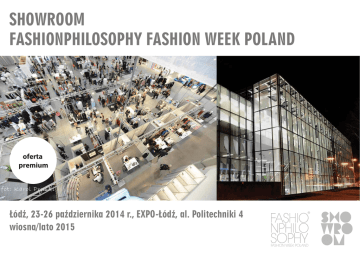 SHOWROOM FASHIONPHILOSOPHY FASHION WEEK POLAND oferta premium , , , Łódz, 23-26 pazdziernika 2014 r., EXPO-Łódz, al. Politechniki 4 wiosna/lato 2015 ZAPROSZENIE Proponujemy Państwu udział w XI edycji Fashion Philosophy Fashion Week Poland stoik exclusive SHOWROOM. FashionPhilosophy Fashion Week Poland to największe wydarzenie modowe w tej części Europy, gdzie czołowi polscy projektanci prezentują swoje premierowe kolekcje. Jesienna edycja odbędzie się 23-26.10.2014 r. w centrum EXPO-ŁÓDŹ, przy alei Politechniki 4 w Łodzi. ATUTY FASHION WEEK POLAND • Ekskluzywny i niepowtarzalny charakter wydarzeń • Budowanie wizerunku marki przed kilkunastotysięczną widownią największego i najbardziej medialnego wydarzenia modowego w Polsce • Możliwość spotkania przedstawicieli prasy, stylistów, celebrytów i pasjonatów mody • Możliwość nawiązania kontaktów handlowych i branżowych • Obecność ponad 200 kupców z Polski i Europy • Obecność przedstawicieli czołowych imprez targowych w Europie, m.in. z Amsterdamu, Berlina, Londynu, Lwowa 16 000 GOŚCI 10 EDYCJI • Możliwość uczestnictwa w szkoleniach prowadzonych przez specjalistów z całego świata • Ponad 4000 mkw. powierzchni wystawienniczej • Najgorętsze premiery sezonu wiosna-lato 2015 ponad ok. 150 200 300 130 160 100 7 000 46 000 projektantów wystawców dziennikarzy kupców wolontariuszy gości zagranicznych gości każdego dnia fanów na portalu FACEBOOK MIEJSCE STREFY SHOWROOM XI edycja FashionPhilosophy Fashion Week Poland odbędzie się w nowoczesnych przestrzeniach EXPO-ŁÓDŹ. Otwarte w 2012 roku centrum konferencyjno-wystawiennicze stanowi idealną odpowiedź na zapotrzebowanie Projektantów oraz Gości. Centrum dostosowane jest w pełni do organizacji pokazów mody, imprez o charakterze targow ym oraz posiada komfortowo wyposażone sale konferencyjne. To właśnie w EXPO-ŁÓDŹ będą miały pokazy “Designer Avenue’’, strefa Showroom oraz seminaria “Let Them Know”. Strefa Showroom będzie realizowana na powierzchni ponad 4 000 mkw. OFERTA Oferta obejmuje Przestrzeń prezentacji o powierzchni: 25 mkw. (4,5m x 5 m + zaplecze): • • • • • • • Oświetlenie metalohalogenowe Gniazdo elektryczne (do 3 kW) Ścianki wykonane z OSB (5 m x 2,5 m) Zaplecze o powierzchni 2,3 mkw. Wyposażenie: wykładznina, 1 stlik, 4 krzesła, lada recepcyjna Wydruk wielkoformatowy ma płycie PCV (5 m x 2,5 m ) z dowolną ZGŁOSZENIE Zgłoszenie uczestnictwa • • • • Wypełnienie deklaracji uczestnictwa Termin składania deklaracji do 5 września 2014 r. Wniesienie opłaty do 5 września 2014 r. Przesyłanie materiałów promocyjnych do 5 września 2014 r. REJESTRACJA Rejestracja obejmuje • 4 karty wstępu na Showroom • 2karnety GUEST • Jedno miejsce parkingowe na samochód osobowy na terenie EXPO-Łódź • Wpis do katalogu wydarzenia rozpowszechnianego w Polsce i zagranicą w ilości 2000 szt. • • Sprzątanie, kosz i wywóz śmieci KOSZTY UCZESTNICTWA 1025 125 450 220 Premium A 500 60 220 450 KOSZTY UCZESTNICTWA 1025 125 450 60 220 500 220 450 Premium B OPCJE DODATKOWE Opcje dodatkowe: • Całostronicowa reklama w katalogu: 500 PLN + VAT • Akredytacja na wszystkie pokazy “Guest” w preferencyjnej cenie: 400 PLN + VAT • *Niniejsze zestawienie ma charakter informacyjny i nie stanowi oferty handlowej w rozumieniu Art.66 §1 Kodeksu Cywilnego KONTAKT MF PRODUCTION ul. A. Struga 78/21A, 90-557 Łódź tel. + 48 42 636 36 76, www.fashionweek.pl [email protected] [email protected] ZAPRASZAMY!