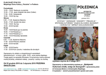PLAN ZAJĘĆ STAŁYCH Miejskiego Domu Kultury „Południe” w Podlesiu Poniedziałek 15.00 – 18.00 Nauka gry na pianinie 15.30 – 17.00 Język angielski dla dzieci (Callan) 17.00 - 18.00 Gwiazdeczki 18.00 – 19.00 Hip hop Wtorek 9.00 – 11.00 Akademia Malucha 16.00 – 17.00 Aerobik dla dzieci 17.00 – 18.00 Hip hop 19.00 – 20.00 Aerobik Środa 15.00 – 18.00 Nauka gry na pianinie 16.00 – 17.00 Plastyka gr. I 17.15 – 18.45 Plastyka gr. II 18.00 – 19.30 Warsztaty rękodzieła Czwartek 9.00 – 11.00 Akademia Malucha 17.00 – 20.00 Wieczory skatowe 19.00 – 20.00 Aerobik Piątek 17.00 – 20.00 Szachy 17.00 – 20.00 Kurs rysunku i malarstwa dla dorosłych Zapraszamy do udziału w cotygodniowych warsztatach rękodzielniczych , w środy o godz. 18.00 - wicie wianka śląskiego. Trwają zapisy na warsztaty filcowania. W tej technice można wykonać modną biżuterię, unikatowe makaty, prezenty i ozdoby na choinkę. Od 22 grudnia 2010 do 3 stycznia 2010 PRZERWA ŚWIĄTECZNA www.mdkpoludnie.com e-mail: [email protected] tel. 32 / 201-50-10 Miejski Dom Kultury POŁUDNIE w Podlesiu, 40-748 Katowice, ul. Sołtysia 25 POŁEDNICA INFORMATOR MIEJSKIEGO DOMU KULTURY „POŁUDNIE” w Podlesiu grudzień 2010 WYSTAWY * WERNISAŻE * KONCERTY * PRELEKCJE * SPOTKANIA AUTORSKIE * ZAJĘCIA DLA DZIECI, MŁODZIEŻY I DOROSŁYCH * IMPREZY OKOLICZNOŚCIOWE wystawa czynna do 4 lutego 2011 Zapraszamy na dokumentalną wystawę pt. „Betlejemki. Kulturowe źródła, wstęp do ikonografii”, opracowaną przez dr Ireneusza Botora z Uniwersytetu Śląskiego. O wystawie i swoich poszukiwaniach opowie sam autor. Oprócz 30 plansz, pokażemy oryginalną, naturalnych rozmiarów szopkę domową należącą do rodziny państwa Marii i Jana Macurów z Podlesia. Szopka jest co roku ustawiana w mieszkaniu na stałym rusztowaniu zbudowanym z płyt styropianowych i warstwowo nakładanej pianki izolacyjnej. Materiały imitują skały i grotę Bożego Narodzenia w Betlejem. Oświetlona tajemniczo scenografia mieści kolekcję kilkuset aniołków z kolekcji córki państwa Macurów – Beaty. Klasycznym przykładem śląskiej betlyjki jest ta ustawiana w domu państwa Klimaszów z Podlesia WESOŁYCH I POGODNYCH ŚWIĄT BOŻEGO NARODZENIA ORAZ SPEŁNIENIA MARZEŃ Z OKAZJI NADCHODZĄCEGO 2011 ROKU ŻYCZY MDK W PODLESIU