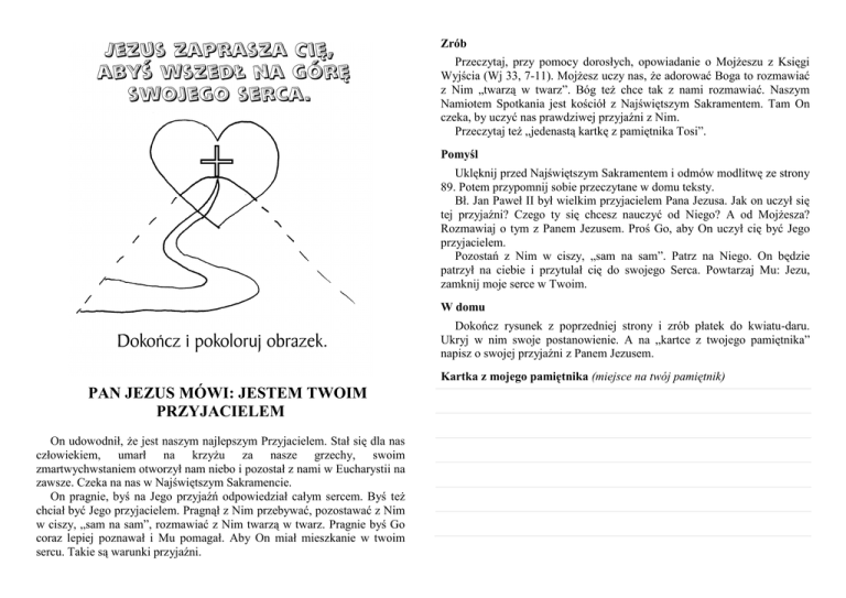 Zrób Przeczytaj, przy pomocy dorosłych, opowiadanie o Mojżeszu z Księgi Wyjścia (Wj 33, 7-11). Mojżesz uczy nas, że adorować Boga to rozmawiać z Nim „twarzą w twarz”. Bóg też chce tak z nami rozmawiać. Naszym Namiotem Spotkania jest kościół z Najświętszym Sakramentem. Tam On czeka, by uczyć nas prawdziwej przyjaźni z Nim. Przeczytaj też „jedenastą kartkę z pamiętnika Tosi”. Pomyśl Uklęknij przed Najświętszym Sakramentem i odmów modlitwę ze strony 89. Potem przypomnij sobie przeczytane w domu teksty. Bł. Jan Paweł II był wielkim przyjacielem Pana Jezusa. Jak on uczył się tej przyjaźni? Czego ty się chcesz nauczyć od Niego? A od Mojżesza? Rozmawiaj o tym z Panem Jezusem. Proś Go, aby On uczył cię być Jego przyjacielem. Pozostań z Nim w ciszy, „sam na sam”. Patrz na Niego. On będzie patrzył na ciebie i przytulał cię do swojego Serca. Powtarzaj Mu: Jezu, zamknij moje serce w Twoim. W domu Dokończ rysunek z poprzedniej strony i zrób płatek do kwiatu-daru. Ukryj w nim swoje postanowienie. A na „kartce z twojego pamiętnika” napisz o swojej przyjaźni z Panem Jezusem. Kartka z mojego pamiętnika (miejsce na twój pamiętnik) PAN JEZUS MÓWI: JESTEM TWOIM PRZYJACIELEM On udowodnił, że jest naszym najlepszym Przyjacielem. Stał się dla nas człowiekiem, umarł na krzyżu za nasze grzechy, swoim zmartwychwstaniem otworzył nam niebo i pozostał z nami w Eucharystii na zawsze. Czeka na nas w Najświętszym Sakramencie. On pragnie, byś na Jego przyjaźń odpowiedział całym sercem. Byś też chciał być Jego przyjacielem. Pragnął z Nim przebywać, pozostawać z Nim w ciszy, „sam na sam”, rozmawiać z Nim twarzą w twarz. Pragnie byś Go coraz lepiej poznawał i Mu pomagał. Aby On miał mieszkanie w twoim sercu. Takie są warunki przyjaźni.