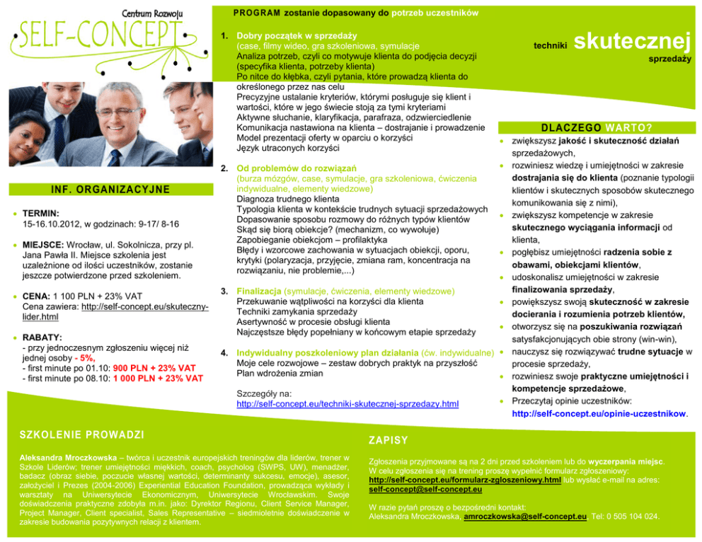 PRO G RAM zostanie dopasowany do potrzeb uczestników 1. Dobry początek w sprzedaży (case, filmy wideo, gra szkoleniowa, symulacje) Analiza potrzeb, czyli co motywuje klienta do podjęcia decyzji (specyfika klienta, potrzeby klienta) Po nitce do kłębka, czyli pytania, które prowadzą klienta do określonego przez nas celu Precyzyjne ustalanie kryteriów, którymi posługuje się klient i wartości, które w jego świecie stoją za tymi kryteriami Aktywne słuchanie, klaryfikacja, parafraza, odzwierciedlenie Komunikacja nastawiona na klienta – dostrajanie i prowadzenie Model prezentacji oferty w oparciu o korzyści Język utraconych korzyści INF. ORGANIZACYJNE TERMIN: 15-16.10.2012, w godzinach: 9-17/ 8-16 MIEJSCE: Wrocław, ul. Sokolnicza, przy pl. Jana Pawła II. Miejsce szkolenia jest uzależnione od ilości uczestników, zostanie jeszcze potwierdzone przed szkoleniem. CENA: 1 100 PLN + 23% VAT Cena zawiera: http://self-concept.eu/skutecznylider.html RABATY: - przy jednoczesnym zgłoszeniu więcej niż jednej osoby - 5%, - first minute po 01.10: 900 PLN + 23% VAT - first minute po 08.10: 1 000 PLN + 23% VAT techniki skutecznej sprzedaży DLACZEGO WARTO? zwiększysz jakość i skuteczność działań sprzedażowych, rozwiniesz wiedzę i umiejętności w zakresie 2. Od problemów do rozwiązań dostrajania się do klienta (poznanie typologii (burza mózgów, case, symulacje, gra szkoleniowa, ćwiczenia indywidualne, elementy wiedzowe) klientów i skutecznych sposobów skutecznego Diagnoza trudnego klienta komunikowania się z nimi), Typologia klienta w kontekście trudnych sytuacji sprzedażowych zwiększysz kompetencje w zakresie Dopasowanie sposobu rozmowy do różnych typów klientów skutecznego wyciągania informacji od Skąd się biorą obiekcje? (mechanizm, co wywołuje) Zapobieganie obiekcjom – profilaktyka klienta, Błędy i wzorcowe zachowania w sytuacjach obiekcji, oporu, pogłębisz umiejętności radzenia sobie z krytyki (polaryzacja, przyjęcie, zmiana ram, koncentracja na obawami, obiekcjami klientów, rozwiązaniu, nie problemie,...) udoskonalisz umiejętności w zakresie finalizowania sprzedaży, 3. Finalizacja (symulacje, ćwiczenia, elementy wiedzowe) Przekuwanie wątpliwości na korzyści dla klienta powiększysz swoją skuteczność w zakresie Techniki zamykania sprzedaży docierania i rozumienia potrzeb klientów, Asertywność w procesie obsługi klienta otworzysz się na poszukiwania rozwiązań Najczęstsze błędy popełniany w końcowym etapie sprzedaży satysfakcjonujących obie strony (win-win), 4. Indywidualny poszkoleniowy plan działania (ćw. indywidualne) nauczysz się rozwiązywać trudne sytuacje w Moje cele rozwojowe – zestaw dobrych praktyk na przyszłość procesie sprzedaży, Plan wdrożenia zmian rozwiniesz swoje praktyczne umiejętności i kompetencje sprzedażowe, Szczegóły na: Przeczytaj opinie uczestników: http://self-concept.eu/techniki-skutecznej-sprzedazy.html http://self-concept.eu/opinie-uczestnikow. SZKOLENIE PROWADZI Aleksandra Mroczkowska – twórca i uczestnik europejskich treningów dla liderów, trener w Szkole Liderów; trener umiejętności miękkich, coach, psycholog (SWPS, UW), menadżer, badacz (obraz siebie, poczucie własnej wartości, determinanty sukcesu, emocje), asesor, założyciel i Prezes (2004-2006) Experiential Education Foundation, prowadząca wykłady i warsztaty na Uniwersytecie Ekonomicznym, Uniwersytecie Wrocławskim. Swoje doświadczenia praktyczne zdobyła m.in. jako: Dyrektor Regionu, Client Service Manager, Project Manager, Client specialist, Sales Representative – siedmioletnie doświadczenie w zakresie budowania pozytywnych relacji z klientem. ZAPISY Zgłoszenia przyjmowane są na 2 dni przed szkoleniem lub do wyczerpania miejsc. W celu zgłoszenia się na trening proszę wypełnić formularz zgłoszeniowy: http://self-concept.eu/formularz-zgloszeniowy.html lub wysłać e-mail na adres: [email protected] W razie pytań proszę o bezpośredni kontakt: Aleksandra Mroczkowska, [email protected], Tel: 0 505 104 024.