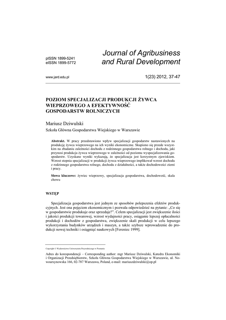 pISSN 1899-5241 eISSN 1899-5772 Journal of Agribusiness and Rural Development www.jard.edu.pl 1(23) 2012, 37-47 POZIOM SPECJALIZACJI PRODUKCJI ŻYWCA WIEPRZOWEGO A EFEKTYWNOŚĆ GOSPODARSTW ROLNICZYCH Mariusz Dziwulski Szkoła Główna Gospodarstwa Wiejskiego w Warszawie Abstrakt. W pracy przedstawiono wpływ specjalizacji gospodarstw nastawionych na produkcję żywca wieprzowego na ich wyniki ekonomiczne. Skupiono się przede wszystkim na zbadaniu zależności dochodu z rodzinnego gospodarstwa rolnego i dochodu, jaki przynosi produkcja żywca wieprzowego w zależności od poziomu wyspecjalizowania gospodarstw. Uzyskane wyniki wykazują, że specjalizacja jest korzystnym zjawiskiem. Wzrost stopnia specjalizacji w produkcji żywca wieprzowego implikował wzrost dochodu z rodzinnego gospodarstwa rolnego, dochodu z działalności, a także dochodowości ziemi i pracy. Słowa kluczowe: żywiec wieprzowy, specjalizacja gospodarstwa, dochodowość, skala chowu WSTĘP Specjalizacja gospodarstwa jest jednym ze sposobów polepszenia efektów produkcyjnych. Jest ona pojęciem ekonomicznym i pozwala odpowiedzieć na pytanie: „Co się w gospodarstwie produkuje oraz sprzedaje?”. Celem specjalizacji jest zwiększenie ilości i jakości produkcji towarowej, wzrost wydajności pracy, osiąganie lepszej opłacalności produkcji i dochodów z gospodarstwa, zwiększenie skali produkcji w celu lepszego wykorzystania budynków urządzeń i maszyn, a także szybsze wprowadzenie do produkcji nowej techniki i osiągnięć naukowych [Fereniec 1999]. Copyright © Wydawnictwo Uniwersytetu Przyrodniczego w Poznaniu Adres do korespondencji – Corresponding author: mgr Mariusz Dziwulski, Katedra Ekonomiki i Organizacji Przedsiębiorstw, Szkoła Główna Gospodarstwa Wiejskiego w Warszawie, ul. Nowoursynowska 166, 02-787 Warszawa, Poland, e-mail: [email protected] 38 M. Dziwulski Specjalizacja gospodarstwa może przynieść rolnikowi określone korzyści. Pozwala na uzyskanie większych ilości produktów lepszej jakości, za które można uzyskać wyższe ceny. Pozwala także na prowadzenie przez rolnika produkcji określonego rodzaju, czasami odpowiadającej jego wiedzy, umiejętnościom i zainteresowaniom. Wykorzystanie własnej siły roboczej jest też lepsze i bardziej równomierne, niż w gospodarstwach wielokierunkowych, ponieważ praca rolnika skupia się na jednym kierunku produkcji. Specjalizacja umożliwia także śledzenie na bieżąco postępu w rolnictwie, a tym samym łatwiejsze jego wprowadzanie do gospodarstwa, gdyż w czasach szybkiego rozwoju techniki i wiedzy bardzo ciężko jest się skoncentrować na wielu dziedzinach. Dzięki wyspecjalizowaniu produkcji, w gospodarstwie wytwarza się więcej produktów jednorodnych. Koszty stałe, takie jak podatki, ubezpieczenia rozkładają się na większą liczbę wyprodukowanych jednostek, co obniża koszty ich wytworzenia. Uprawa jednolitych roślin lub utrzymywanie zwierząt tego samego gatunku ułatwia również efektywną mechanizację i zapewnia lepsze wykorzystanie budynków, maszyn i urządzeń będących w posiadaniu gospodarstwa. Wpływa to korzystnie na funkcjonowanie przedsiębiorstwa rolniczego (gospodarstwa), a tym samym pozwala rolnikowi na osiągnięcie wyższych dochodów [Ziętara 1976]. Manteuffel [1979] uznaje jednak specjalizację jako rozwiązanie nie zawsze racjonalne. Wprowadzana w sposób nieodpowiedni i nieprzemyślany może niekorzystnie wpłynąć na funkcjonowanie gospodarstwa, czasami może nawet pogorszyć jego sytuację. Rolnik, biorąc pod uwagę posiadaną ziemię, kapitał i umiejętności, powinien więc ocenić, czy warto specjalizować gospodarstwo, czy też nie. Manteuffel do wad specjalizacji zalicza: niewykorzystanie naturalnych warunków i zasobów gospodarstwa – np. poprzez niewykorzystanie stanowisk w zmianowaniu oraz niebezpieczeństwo ekstensyfikacji – zwłaszcza w produkcji roślinnej. Pojawia się również ryzyko częstszego występowania chorób i szkodników, np. gdy w strukturze zasiewów przeważa jedna roślina zwiększa się prawdopodobieństwo występowania chorób, w produkcji zwierzęcej wzrastają natomiast wydatki na opiekę weterynaryjną. Specjalizacja powoduje także powstawanie szczytów zapotrzebowania na siłę roboczą i pociągową oraz specjalne maszyny – w okresach szczytów pracy, np. żniw, może wystąpić zwiększone zapotrzebowanie na maszyny, co wiąże się z dodatkowymi kosztami maszyn i siły roboczej oraz stwarza niebezpieczeństwo względnej nadprodukcji określonego artykułu. Wzrasta również ryzyko wynikające z prowadzenia jednostronnej produkcji – im stopień specjalizacji jest wyższy, tym to ryzyko jest większe. W przypadku zdarzeń mogących wpływać ujemnie na działalność (susze, nadmierne opady, upadki zwierząt), rolnik nie ma ubezpieczenia w postaci drugiej działalności, która mogłaby być dochodowa [Manteuffel 1979]. Mimo wielu zalet specjalizacji, obecnie w polskim rolnictwie zarówno jej stopień, jak i skala produkcji są dość niskie. Ogranicza to wprowadzanie zmian w technice wytwarzania oraz zastosowania nowych technologii, co powoduje, że efektywność gospodarowania jest niska [Wiatrak 2001]. Poprawa efektywności produkcji w przypadku producentów żywca wieprzowego, w warunkach zmiennej sytuacji rynkowej, powinna być jednym z ważniejszych celów w gospodarstwie. Jednak jak zauważa Szymańska [2009], gdy konkurencja jest silna, jej zwiększanie stanowi wyzwanie dla wielu rolników w Polsce. Journal of Agribusiness and Rural Development Poziom specjalizacji produkcji żywca wieprzowego a efektywność gospodarstw ... 39 CEL I METODYKA BADAŃ Celem opracowania jest określenie zależności między poziomem specjalizacji gospodarstw w produkcji żywca wieprzowego a efektywnością jego produkcji. Badaniami objęto 141 indywidualnych gospodarstw rolnych, które w 2008 roku zajmowały się produkcją żywca wieprzowego. Próbę stanow