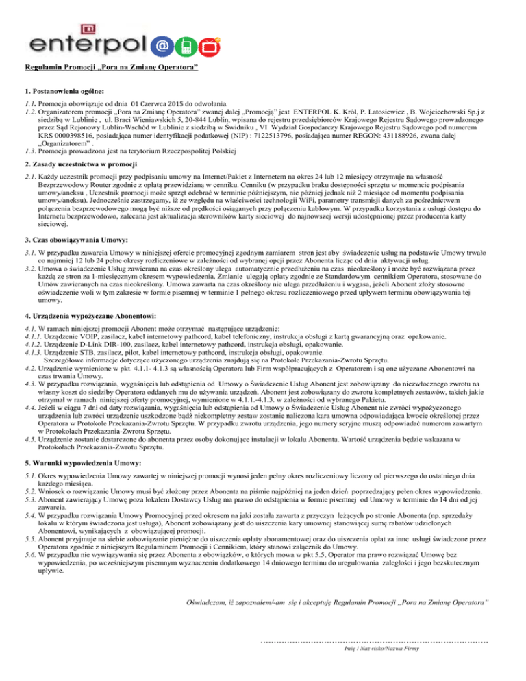 Regulamin Promocji „Pora na Zmianę Operatora” 1. Postanowienia ogólne: 1.1. Promocja obowiązuje od dnia 01 Czerwca 2015 do odwołania. 1.2. Organizatorem promocji „Pora na Zmianę Operatora” zwanej dalej „Promocją” jest ENTERPOL K. Król, P. Latosiewicz , B. Wojciechowski Sp.j z siedzibą w Lublinie , ul. Braci Wieniawskich 5, 20-844 Lublin, wpisana do rejestru przedsiębiorców Krajowego Rejestru Sądowego prowadzonego przez Sąd Rejonowy Lublin-Wschód w Lublinie z siedzibą w Świdniku , VI Wydział Gospodarczy Krajowego Rejestru Sądowego pod numerem KRS 0000398516, posiadająca numer identyfikacji podatkowej (NIP) : 7122513796, posiadająca numer REGON: 431188926, zwana dalej „Organizatorem” . 1.3. Promocja prowadzona jest na terytorium Rzeczpospolitej Polskiej 2. Zasady uczestnictwa w promocji 2.1. Każdy uczestnik promocji przy podpisaniu umowy na Internet/Pakiet z Internetem na okres 24 lub 12 miesięcy otrzymuje na własność Bezprzewodowy Router zgodnie z opłatą przewidzianą w cenniku. Cenniku (w przypadku braku dostępności sprzętu w momencie podpisania umowy/aneksu , Uczestnik promocji może sprzęt odebrać w terminie późniejszym, nie później jednak niż 2 miesiące od momentu podpisania umowy/aneksu). Jednocześnie zastrzegamy, iż ze względu na właściwości technologii WiFi, parametry transmisji danych za pośrednictwem połączenia bezprzewodowego mogą być niższe od prędkości osiąganych przy połączeniu kablowym. W przypadku korzystania z usługi dostępu do Internetu bezprzewodowo, zalecana jest aktualizacja sterowników karty sieciowej do najnowszej wersji udostępnionej przez producenta karty sieciowej. 3. Czas obowiązywania Umowy: 3.1. W przypadku zawarcia Umowy w niniejszej ofercie promocyjnej zgodnym zamiarem stron jest aby świadczenie usług na podstawie Umowy trwało co najmniej 12 lub 24 pełne okresy rozliczeniowe w zależności od wybranej opcji przez Abonenta licząc od dnia aktywacji usług. 3.2. Umowa o świadczenie Usług zawierana na czas określony ulega automatycznie przedłużeniu na czas nieokreślony i może być rozwiązana przez każdą ze stron za 1-miesięcznym okresem wypowiedzenia. Zmianie ulegają opłaty zgodnie ze Standardowym cennikiem Operatora, stosowane do Umów zawieranych na czas nieokreślony. Umowa zawarta na czas określony nie ulega przedłużeniu i wygasa, jeżeli Abonent złoży stosowne oświadczenie woli w tym zakresie w formie pisemnej w terminie 1 pełnego okresu rozliczeniowego przed upływem terminu obowiązywania tej umowy. 4. Urządzenia wypożyczane Abonentowi: 4.1. W ramach niniejszej promocji Abonent może otrzymać następujące urządzenie: 4.1.1. Urządzenie VOIP, zasilacz, kabel internetowy pathcord, kabel telefoniczny, instrukcja obsługi z kartą gwarancyjną oraz opakowanie. 4.1.2. Urządzenie D-Link DIR-100, zasilacz, kabel internetowy pathcord, instrukcja obsługi, opakowanie. 4.1.3. Urządzenie STB, zasilacz, pilot, kabel internetowy pathcord, instrukcja obsługi, opakowanie. Szczegółowe informacje dotyczące użyczonego urządzenia znajdują się na Protokole Przekazania-Zwrotu Sprzętu. 4.2. Urządzenie wymienione w pkt. 4.1.1- 4.1.3 są własnością Operatora lub Firm współpracujących z Operatorem i są one użyczane Abonentowi na czas trwania Umowy. 4.3. W przypadku rozwiązania, wygaśnięcia lub odstąpienia od Umowy o Świadczenie Usług Abonent jest zobowiązany do niezwłocznego zwrotu na własny koszt do siedziby Operatora oddanych mu do używania urządzeń. Abonent jest zobowiązany do zwrotu kompletnych zestawów, takich jakie otrzymał w ramach niniejszej oferty promocyjnej, wymienione w 4.1.1.-4.1.3. w zależności od wybranego Pakietu. 4.4. Jeżeli w ciągu 7 dni od daty rozwiązania, wygaśnięcia lub odstąpienia od Umowy o Świadczenie Usług Abonent nie zwróci wypożyczonego urządzenia lub zwróci urządzenie uszkodzone bądź niekompletny zestaw zostanie naliczona kara umowna odpowiadająca kwocie określonej przez Operatora w Protokole Przekazania-Zwrotu Sprzętu. W przypadku zwrotu urządzenia, jego numery seryjne muszą odpowiadać numerom zawartym w Protokołach Przekazania-Zwrotu Sprzętu. 4.5. Urządzenie zostanie dostarczone do abonenta przez osoby dokonujące instalacji w lokalu Abonenta. Wartość urządzenia będzie wskazana w Protokołach Przekazania-Zwrotu Sprzętu. 5. Warunki wypowiedzenia Umowy: 5.1. Okres wypowiedzenia Umowy zawartej w niniejszej promocji wynosi jeden pełny okres rozliczeniowy liczony od pierwszego do ostatniego dnia każdego miesiąca. 5.2. Wniosek o rozwiązanie Umowy musi być złożony przez Abonenta na piśmie najpóźniej na jeden dzień poprzedzający pełen okres wypowiedzenia. 5.3. Abonent zawierający Umowę poza lokalem Dostawcy Usług ma prawo do odstąpienia w formie pisemnej od Umowy w terminie do 14 dni od jej zawarcia. 5.4. W przypadku rozwiązania Umowy Promocyjnej przed okresem na jaki została zawarta z przyczyn leżących po stronie Abonenta (np. sprzedaży lokalu w którym świadczona jest usługa), Abonent zobowiązany jest do uiszczenia kary umownej stanowiącej sumę rabatów udzielonych Abonentowi, wynikających z obowiązującej promocji. 5.5. Abonent przyjmuje na siebie zobowiązanie pieniężne do uiszczenia opłaty abonamentowej oraz do uiszczenia opłat za inne usługi świadczone przez Operatora zgodnie z niniejszym Regulaminem Promocji i Cennikiem, który stanowi załącznik do Umowy. 5.6. W przypadku nie wywiązywania się przez Abonenta z obowiązków, o których mowa w pkt 5.5, Operator ma prawo rozwiązać Umowę bez wypowiedzenia, po wcześniejszym pisemnym wyznaczeniu dodatkowego 14 dniowego terminu do uregulowania zaległości i jego bezskutecznym upływie. Oświadczam, iż zapoznałem/-am się i akceptuję Regulamin Promocji „Pora na Zmianę Operatora” ...................................................................................... Imię i Nazwisko/Nazwa Firm