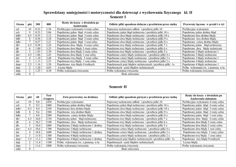Sprawdziany umiejętności i motoryczności dla dziewcząt z wychowania fizycznego kl. II Semestr I Ocena pkt 300 800 cel celbdb+ bdb bdbdb+ db dbdst+ dst dstdop+ dop dopndst 10 9 8.5 8 7 6.5 6 5 4.5 4 3 2.5 2 1 0 0.52 0.53 0.55 0.56 0,57 0,58 1.00 1.03 1.06 1.10 1.13 1.16 1.20 1.25 2.58 3,06 3,12 3,18 3,21 3,26 3,33 3,39 3,43 3,48 3,53 3,58 4,03 4,10 Rzuty do kosza z dwutaktu po kozłowaniu Perfekcyjne wykonanie 4 rzuty celne Popełniony jeden błąd 4 rzuty celne Popełniony jeden błąd 3 rzuty celne Popełniony jeden błąd 2 rzuty celne Popełniony jeden błąd 1 rzut celny Popełnione dwa błędy 4 rzuty celne Popełnione dwa błędy 3 rzuty celne Popełnione dwa błędy 2 rzuty celne Popełnione dwa błędy 1 rzut celny Popełnione trzy błędy 2 rzuty celne Popełnione trzy błędy 1 rzut celny Popełnione trzy błędy 0 trafnych Liczne błędy Próba wykonania ćwiczenia Odbiór piłki sposobem dolnym z przebiciem przez siatkę Poprawny technicznie odbiór i przebicie piłki 10 Popełniony jeden błąd techniczny i przebicie piłki 10 x Popełnione dwa błędy techniczne i przebicie piłki 10 x Popełnione dwa błędy techniczne i przebicie piłki 9 x Popełnione dwa błędy techniczne i przebicie piłki 8 x Popełnione trzy błędy techniczne i przebicie piłki 7 x Popełnione trzy błędy techniczne i przebicie piłki 6 x Popełnione trzy błędy techniczne i przebicie piłki 5 x Popełnione cztery błędy techniczne i przebicie piłki 4 x Popełnione cztery błędy techniczne i przebicie piłki 3 x Popełnione cztery błędy techniczne i przebicie piłki 2 x Popełnionych pięć błędów technicznych i przebicie piłki 1x Popełnionych sześć błędów technicznych Próba wykonania ćwiczenia Brak zaliczenia Przewroty łączone w przód i w tył Perfekcyjne wykonanie Popełniony jeden drobny błąd Popełnione dwa drobne błędy Popełnione trzy drobne błędy Popełnione cztery drobne błędy Popełniony jeden błąd techniczny Popełnione dwa błędy techniczne Popełnione 2 błędy techniczne 1 Popełnione 3 błędy techniczne drobny Popełnione 3 błędy techniczne 1 Popełnione 4 błędy techniczne drobny Popełnione 4 błędy techniczne 1 drobnywykonania ćw. z pomocą n-la Próba Próba wykonania ćwiczenia Semestr II Ocena pkt 60 cel celbdb+ bdb bdbdb+ db dbdst+ dst dstdop+ dop dopndst 10 9 8.5 8 7 6.5 6 5 4.5 4 3 2.5 2 1 0 9,0 9,2 9,4 9,6 9,8 10,0 10,2 10,4 10,6 10,8 11.0 11,2 11,4 11,6 Test Coopera 2450 2400 2350 2300 2200 2150 2100 1800 1700 1600 1300 1200 1100 1000 Zwis przewrotny na drabince Perfekcyjne wykonanie Popełniony jeden drobny błąd Popełnione dwa drobne błędy Popełnione trzy drobne błędy Popełnione cztery drobne błędy Popełniony jeden błąd techniczny Popełnione dwa błędy techniczne Popełnione 2 błędy techniczne 1 drobny Popełnione 3 błędy techniczne Popełnione 3 błędy techniczne 1 drobny Popełnione 4 błędy techniczne Popełnione 4 błędy techniczne 1 drobny Próba wykonania ćw. z pomocą n-la Próba wykonania ćwiczenia Odbiór piłki sposobem górnym z przebiciem przez siatkę Poprawny technicznie odbiór i przebicie piłki 10 Popełniony jeden błąd techniczny i przebicie piłki 10 x Popełnione dwa błędy techniczne i przebicie piłki 10 x Popełnione dwa błędy techniczne i przebicie piłki 9 x Popełnione dwa błędy techniczne i przebicie piłki 8 x Popełnione trzy błędy techniczne i przebicie piłki 7 x Popełnione trzy błędy techniczne i przebicie piłki 6 x Popełnione trzy błędy techniczne i przebicie piłki 5 x Popełnione cztery błędy techniczne i przebicie piłki 4 x Popełnione cztery błędy techniczne i przebicie piłki 3 x Popełnione cztery błędy techniczne i przebicie piłki 2 x Popełnionych pięć błędów technicznych i przebicie piłki 1x Popełnionych sześć błędów technicznych Próba wykonania ćwiczenia Brak zaliczenia Rzuty do kosza z dwutaktu po kozłowaniu slalomem Perfekcyjne wykonanie 4 rzuty celne Popełniony jeden błąd 4 rzuty celne Popełniony jeden błąd 3 rzuty celne Popełniony jeden błąd 2 rzuty celne Popełniony jeden błąd 1 rzut celny Popełnione dwa błędy 4 rzuty celne Popełnione dwa błędy 3 rzuty celne Popełnione dwa błędy 2 rzuty celne Popełnione dwa błędy 1 rzut celny Popełnione trzy błędy 2 rzuty celne Popełnione trzy błędy 1 rzut celny Popełnione trzy błędy 0 trafnych Liczne błędy Próba wykonania ćwiczenia