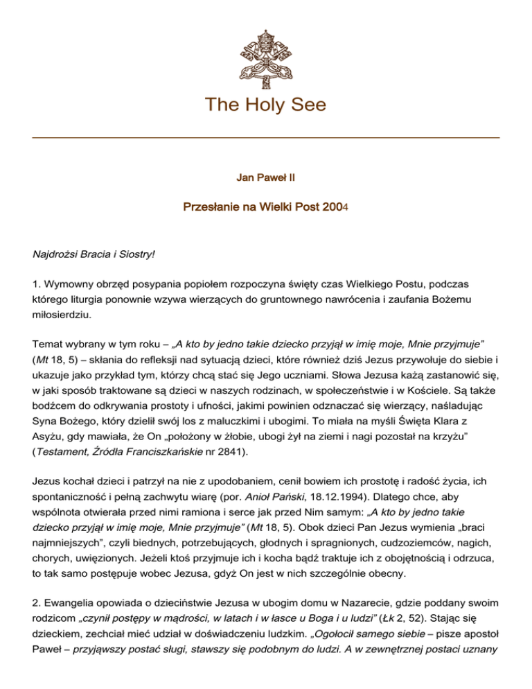 The Holy See Jan Paweł II Przesłanie na Wielki Post 2004 Najdrożsi Bracia i Siostry! 1. Wymowny obrzęd posypania popiołem rozpoczyna święty czas Wielkiego Postu, podczas którego liturgia ponownie wzywa wierzących do gruntownego nawrócenia i zaufania Bożemu miłosierdziu. Temat wybrany w tym roku – „A kto by jedno takie dziecko przyjął w imię moje, Mnie przyjmuje” (Mt 18, 5) – skłania do refleksji nad sytuacją dzieci, które również dziś Jezus przywołuje do siebie i ukazuje jako przykład tym, którzy chcą stać się Jego uczniami. Słowa Jezusa każą zastanowić się, w jaki sposób traktowane są dzieci w naszych rodzinach, w społeczeństwie i w Kościele. Są także bodźcem do odkrywania prostoty i ufności, jakimi powinien odznaczać się wierzący, naśladując Syna Bożego, który dzielił swój los z maluczkimi i ubogimi. To miała na myśli Święta Klara z Asyżu, gdy mawiała, że On „położony w żłobie, ubogi żył na ziemi i nagi pozostał na krzyżu” (Testament, Źródła Franciszkańskie nr 2841). Jezus kochał dzieci i patrzył na nie z upodobaniem, cenił bowiem ich prostotę i radość życia, ich spontaniczność i pełną zachwytu wiarę (por. Anioł Pański, 18.12.1994). Dlatego chce, aby wspólnota otwierała przed nimi ramiona i serce jak przed Nim samym: „A kto by jedno takie dziecko przyjął w imię moje, Mnie przyjmuje” (Mt 18, 5). Obok dzieci Pan Jezus wymienia „braci najmniejszych”, czyli biednych, potrzebujących, głodnych i spragnionych, cudzoziemców, nagich, chorych, uwięzionych. Jeżeli ktoś przyjmuje ich i kocha bądź traktuje ich z obojętnością i odrzuca, to tak samo postępuje wobec Jezusa, gdyż On jest w nich szczególnie obecny. 2. Ewangelia opowiada o dzieciństwie Jezusa w ubogim domu w Nazarecie, gdzie poddany swoim rodzicom „czynił postępy w mądrości, w latach i w łasce u Boga i u ludzi” (Łk 2, 52). Stając się dzieckiem, zechciał mieć udział w doświadczeniu ludzkim. „Ogołocił samego siebie – pisze apostoł Paweł – przyjąwszy postać sługi, stawszy się podobnym do ludzi. A w zewnętrznej postaci uznany 2 za człowieka, uniżył samego siebie, stawszy się posłusznym aż do śmierci i to śmierci krzyżowej” (Flp 2, 7-8). Kiedy jako dwunastoletni chłopiec pozostał w świątyni jerozolimskiej, szukającym Go strapionym rodzicom powiedział: „Czemuście Mnie szukali? Czy nie wiedzieliście, że powinienem być w tym, co należy do mego Ojca?” (Łk 2, 49). Prawdziwie całe Jego istnienie było nacechowane ufnym i synowskim poddaniem Ojcu niebieskiemu. „Moim pokarmem - mówił On – jest wypełnić wolę Tego, który Mnie posłał, i wykonać Jego dzieło” (J 4, 34). W latach swego życia publicznego powtarzał wiele razy, że tylko ci, którzy potrafią stać się jak dzieci, wejdą do Królestwa Niebieskiego (por. Mt 18, 3; Mk 10, 15; Łk 18, 17; J 3, 3). W Jego nauczaniu dziecko stanowi wymowny obrazem ucznia, wezwanego, by z dziecięcą uległością szedł za Boskim Mistrzem: „Kto się więc uniży jak to dziecko, ten jest największy w królestwie niebieskim” (Mt 18, 4). „Stawanie się” maluczkimi i „przyjmowanie” maluczkich: to dwa wymiary tego samego nauczania, które Pan również w naszych czasach kieruje do swoich uczniów. Tylko ten, kto czyni siebie „maluczkim” potrafi przyjąć z miłością „najmniejszych” braci. 3. Liczni wierzący próbują wiernie podążać za tym nauczaniem Pana. Chciałbym tutaj wspomnieć o rodzicach, którzy bez wahania biorą na siebie odpowiedzialność za rodzinę wielodzietną; o matkach i ojcach, którzy nie uznają za najważniejsze poszukiwania sukcesu zawodowego i kariery, lecz troszczą się o przekazanie dzieciom tych wartości ludzkich i religijnych, które nadają prawdziwy sens istnieniu. Z pełnym wdzięczności podziwem myślę o tych, którzy podejmują się wychowania dzieci przeżywających trudności i starają się ulżyć im i ich krewnym w cierpieniach spowodowanych przez wojny i przemoc, przez brak jedzenia i wody, przez wymuszoną emigrację i tyle innych form niesprawiedliwości istniejących na świecie. Obok takiej wielkoduszności trzeba jednak dostrzec również egoizm tych, którzy nie „przyjmują” dzieci. Nie brak nieletnich głęboko zranieni przez przemoc dorosłych: nadużycia seksualne, przymuszanie do prostytucji, wciąganie w sprzedaż i zażywanie narkotyków; dzieci zmuszane są do pracy lub rekrutowane do wojska; na całe życie pozostają urazy niewinnym z rodzin rozbitych; nie oszczędza maluczkich haniebny handel organami i ludźmi. A co powiedzieć o tragedii AIDS i jego dewastujących następstwach w Afryce? Mówi się, że plaga ta obejmuje miliony ludzi, z których wielu to zarażeni od urodzenia. Ludzkość nie może zamykać oczu na tak zatrważający dramat! 4. Cóż złego uczyniły te dzieci, że zasłużyły na takie cierpienia? Z ludzkiego punktu widzenia niełatwo, a może nawet nie sposób odpowiedzieć na to niepokojące pytanie. Tylko wiara pomaga nam wniknąć w tak głęboką otchłań cierpienia. Stając się „posłusznym aż do śmierci i to śmierci krzyżowej” (Flp 2, 8), Jezus przyjął na siebie ludzkie cierpienie i oświecił je jaśniejącym światłem 3 zmartwychwstania. Swoją śmiercią na zawsze zwyciężył śmierć. Podczas Wielkiego Postu przygotowujemy się do ponownego przeżywania Tajemnicy Paschalnej, która oświeca nadzieją całe nasze istnienie, nawet jego najbardziej złożone i bolesne wymiary. Wielki Tydzień, poprzez wymowne obrzędy Triduum Paschalnego, na nowo przybliży nam tę tajemnicę zbawienia. Drodzy Bracia i Siostry, z ufnością rozpocznijmy wielkopostną drogę, ożywiani wzmożoną modlitwą, pokutą i wrażliwością na potrzebujących. Wielki Post niech będzie szczególnie sposobną okazją, aby poświęcić więcej troski dzieciom w środowisku rodzinnym i społecznym: one są przyszłośc