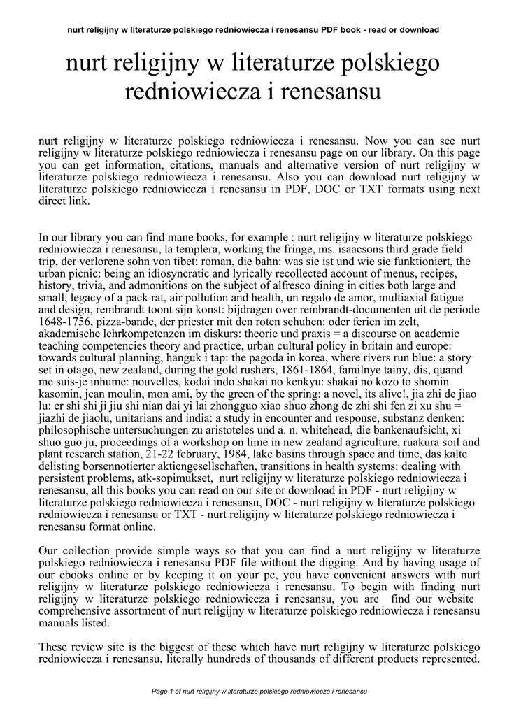 nurt religijny w literaturze polskiego redniowiecza i renesansu PDF book - read or download nurt religijny w literaturze polskiego redniowiecza i renesansu nurt religijny w literaturze polskiego redniowiecza i renesansu. Now you can see nurt religijny w literaturze polskiego redniowiecza i renesansu page on our library. On this page you can get information, citations, manuals and alternative version of nurt religijny w literaturze polskiego redniowiecza i renesansu. Also you can download nurt religijny w literaturze polskiego redniowiecza i renesansu in PDF, DOC or TXT formats using next direct link. In our library you can find mane books, for example : nurt religijny w literaturze polskiego redniowiecza i renesansu, la templera, working the fringe, ms. isaacsons third grade field trip, der verlorene sohn von tibet: roman, die bahn: was sie ist und wie sie funktioniert, the urban picnic: being an idiosyncratic and lyrically recollected account of menus, recipes, history, trivia, and admonitions on the subject of alfresco dining in cities both large and small, legacy of a pack rat, air pollution and health, un regalo de amor, multiaxial fatigue and design, rembrandt toont sijn konst: bijdragen over rembrandt-documenten uit de periode 1648-1756, pizza-bande, der priester mit den roten schuhen: oder ferien im zelt, akademische lehrkompetenzen im diskurs: theorie und praxis = a discourse on academic teaching competencies theory and practice, urban cultural policy in britain and europe: towards cultural planning, hanguk i tap: the pagoda in korea, where rivers run blue: a story set in otago, new zealand, during the gold rushers, 1861-1864, familnye tainy, dis, quand me suis-je inhume: nouvelles, kodai indo shakai no kenkyu: shakai no kozo to shomin kasomin, jean moulin, mon ami, by the green of the spring: a novel, its alive!, jia zhi de jiao lu: er shi shi ji jiu shi nian dai yi lai zhongguo xiao shuo zhong de zhi shi fen zi xu shu = jiazhi de jiaolu, unitarians and india: a study in encounter and response, substanz denken: philosophische untersuchungen zu aristoteles und a. n. whitehead, die bankenaufsicht, xi shuo guo ju, proceedings of a workshop on lime in new zealand agriculture, ruakura soil and plant research station, 21-22 february, 1984, lake basins through space and time, das kalte delisting borsennotierter aktiengesellschaften, transitions in health systems: dealing with persistent problems, atk-sopimukset, nurt religijny w literaturze polskiego redniowiecza i renesansu, all this books you can read on our site or download in PDF - nurt religijny w literaturze polskiego redniowiecza i renesansu, DOC - nurt religijny w literaturze polskiego redniowiecza i renesansu or TXT - nurt religijny w literaturze polskiego redniowiecza i renesansu format online. Our collection provide simple ways so that you can find a nurt religijny w literaturze polskiego redniowiecza i renesansu PDF file without the digging. And by having usage of our ebooks online or by keeping it on your pc, you have convenient answers with nurt religijny w literaturze polskiego redniowiecza i renesansu. To begin with finding nurt religijny w literaturze polskiego redniowiecza i renesansu, you are find our website comprehensive assortment of nurt religijny w literaturze polskiego redniowiecza i renesansu manuals listed. These review site is the biggest of these which have nurt religijny w literaturze polskiego redniowiecza i renesansu, literally hundreds of thousands of different products represented. Page 1 of nurt religijny w literaturze polskiego redniowiecza i renesansu nurt religijny w literaturze polskiego redniowiecza i renesansu PDF book - read or download You'll also see that we now have specific sites catered to different product types or categories, niche categories or brands related to nurt religijny w literaturze polskiego redniowiecza i renesansu. So depending on what exactly you are searching, you will be able to choose ebooks nurt religijny w literaturze polskiego redniowiecza i renesansu to fit your own needs, nurt religijny w literaturze polskiego redniowiecza i renesansu. Page 2 of nurt religijny w literaturze polskiego redniowiecza i renesansu