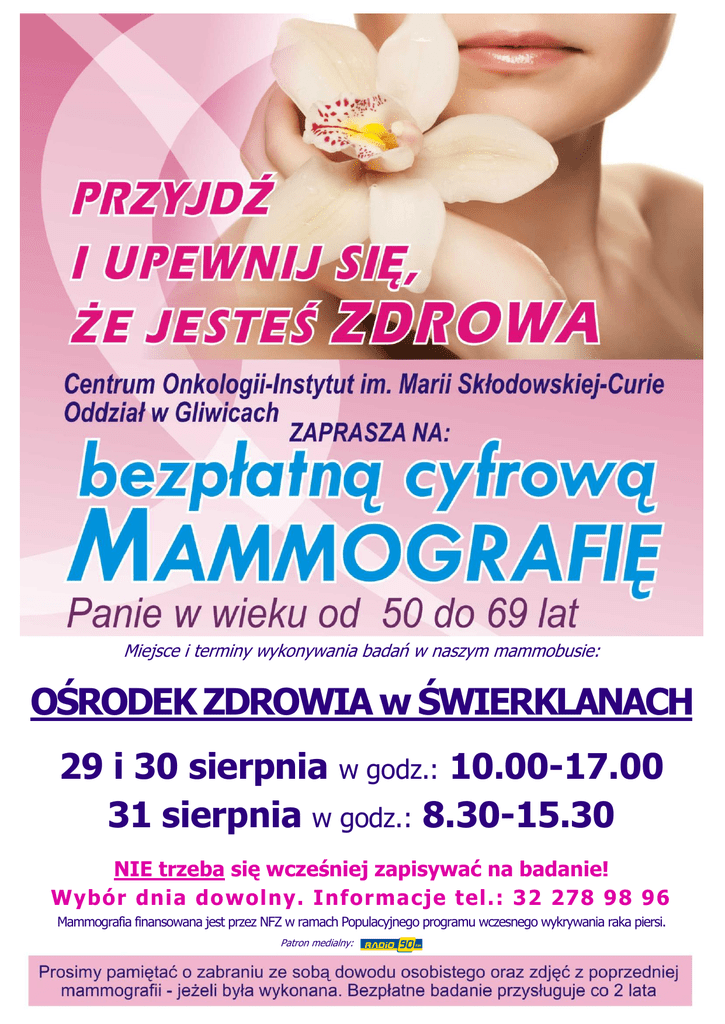 Miejsce postoju mammobusu: Miejsce i terminy wykonywania badań w naszym mammobusie: OŚRODEK ZDROWIA w ŚWIERKLANACH 29 i 30 sierpnia w godz.: 10.00-17.00 31 sierpnia w godz.: 8.30-15.30 NIE trzeba się wcześniej zapisywać na badanie! Wybór dnia do wolny. Informacje tel.: 32 278 98 96 Mammografia finansowana jest przez NFZ w ramach Populacyjnego programu wczesnego wykrywania raka piersi. Patron medialny: