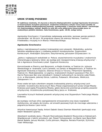 UROK STAREJ PIOSENKI W najbliższa niedzielę, 22 stycznia w Dworku Białoprądnickim wystąpi Agnieszka Grochowicz w towarzystwie muzyków jazzowych. Znakomici krakowscy artyści rzucą nowe światło na klasykę polskiej międzywojennej piosenki, wydobywając z utworów nową jakość i zachowując ich nieprzemijający wdzięk. Będzie to miłe dla ucha połączenie klasycznego jazzu ze znakomitym polskim tekstem. Sala Kominkowa, godz. 18.00, wstęp wolny. Agnieszka Grochowicz i Czarodzieje zaśpiewają autorskie, jazzowe wersje polskich standardów lat 30-tych. W programie utwory do wierszy Hemara, Tuwima i Friedwalda z muzyką m.in Warsa i Petersburskiego. Agnieszka Grochowicz Jedna z najciekawszych postaci krakowskiej scen piosenki. Wokalistka, autorka tekstów współpracująca z czołówką polskich kompozytorów: Zygmuntem Koniecznym, Andrzejem Zaryckim, Ewą Kornecką, Januszem Grzywaczem i in. „Jedna z najlepszych wokalistek w Polsce; wszechstronnie muzykalna i znakomicie interpretująca śpiewany tekst. Jej występ jest niezapomnianą kreacją artystyczną” – tak o Agnieszce Grochowicz pisał Zygmunt Konieczny Koncertowała w Piwnicy pod Baranami, w Radio Kraków, w Teatrze im. Juliusza Słowackiego w Krakowie, Loch Camelot, na Zamku w Niepołomicach, w Teatrze im. Agnieszki Osieckiej w Sopocie, Dworze Artusa w Toruniu, Filharmonii Opolskiej, Teatrze im. Modrzejewskiej w Legnicy, krakowskich klubach jazzowych Piec Art i Harris Piano Jazz Bar oraz ośrodkach i klubach kulturalnych na terenie całej Polski, m.in. w Warszawie, Jeleniej Górze, Lublinie, Puławach, Wrocławiu, Wieliczce, Zakopanem i in. Przez wiele lat była członkiem zespołu krakowskiej piwnicy artystycznej Loch Camelot. Uczestniczka dorocznych Nocy Poezji organizowanych przez Urząd Miasta Krakowa pod egidą Prezydenta Miasta, gdzie dorocznie premieruje projekty piosenki artystycznej. Uczestniczka prestiżowej Nocy Jazzu w Krakowie. Laureatka licznych festiwali piosenki artystycznej oraz Stypendium Twórczego Miasta Krakowa. Jej występy cechuje silne zaangażowanie emocjonalne oraz duża rozpiętość stylistyczna, od szeptu do krzyku, od smooth-jazzowej liryki do mocnego uderzenia z pogranicza bluesa i jazz-rocka. Artystce towarzyszyć będą: Antoni Dębski (bass) Damian Niewiński (perkusja) oraz Adam Niedzielin (piano). Absolwent wydziału Jazzu i Muzyki Rozrywkowej Akademii Muzycznej w Katowicach. Współpracuje z takimi artystami, jak: Paweł Tomaszewski, Ivo Band, Jazz Band Ball, Marek Bałata, Janusz Muniak, Curtis Johnson, Megitza, Renata Przemyk, Dj Krime, Teatr Witkacego. Centrum Kultury „Dworek Białoprądnicki” ul. Papiernicza 2, 31-221 Kraków 12 420 49 62 http://dworek.eu/ https://www.facebook.com/dworek.bialopradnicki Powered by TCPDF (www.tcpdf.org)
