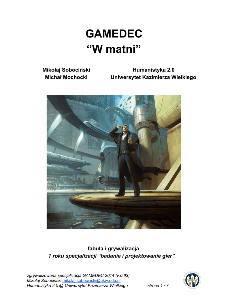 GAMEDEC “W matni” Mikołaj Sobociński Michał Mochocki Humanistyka 2.0 Uniwersytet Kazimierza Wielkiego fabuła i grywalizacja 1 roku specjalizacji “badanie i projektowanie gier” zgrywalizowana specjalizacja GAMEDEC 2014 (v.0.93) Mikolaj Sobocinski [email protected] Humanistyka 2.0 @ Uniwersytet Kazimierza Wielkiego strona 1 / 7 Gra to model sytuacji konfliktowej. W znanym nam świecie wszystko można pod nią podciągnąć. Atom zderza się z atomem. Konflikt. Asteroid uderza w asteroid. Idea zwalcza ideę, potrzeba wypiera kontrpotrzebę, instynkt konkuruje z instynktem, myśl bije się z myślą, jedno uczucie jest sprzeczne z innym, człowiek odczuwa niechęć do drugiego. Wszystko jest grą. W tym ujęciu pana zawód zyskuje uniwersalny wymiar. Gamedec to po prostu ktoś, kto umie grać w… życie. (M. Przybyłek, Zabaweczki, s. 299300) Rozdział 1. Odprawa Młody kandydacie na gamedeca. Liczymy na Ciebie i Twoje zaangażowanie. Świat stanął nad przepaścią. Wszyscy zostaliśmy uwikłani w rozgrywki wielkich potentatów, koncernów, lobbystów, polityków i rządów. Świat Realium przenika się z Virtualium, opleciony troniką i analityką, doświadczany poprzez media, ujęty w globalne systemy o rosnącej złożoności. To jest czas gamedeków. Dzisiaj Ty i Tobie podobni adepci, poznając reguły i mechanizmy rządzące wszelkimi grami tego świata, mają szansę na zmianę przyszłości. Masz szansę stać się światłem, za którym podążą tłumy! Czeka cię szkolenie wyostrzające zmysły i intelekt. Zadania, przed którymi staniesz w najbliższych miesiącach, będą ponad siły zwykłego człowieka, ale przecież jesteś tu właśnie dlatego, że zwyczajność już Ci nie wystarcza. Będziesz musiał pokonać swoje słabości. Gamedec, którym chcesz się stać, nie poddaje się nawet w obliczu porażki. Nadszedł czas próby. Czy podołasz wyzwaniu? Czy zwyciężysz z wewnętrznym lenistwem, pragnąc jedynie spokoju za cenę przegranej? Ani Ty, ani świat nie mogą sobie na to pozwolić. Pasywność nie jest rozwiązaniem, lenistwo do niczego nie prowadzi, system nie może nad nami zatriumfować! System, który nas otacza jest przepotężny i niezwyciężony. A jednak można nie dać mu się zniewolić. Gamedec wchodzi w światy wirtualne nie po to, by ogłupiać się płytką rozrywką. Gamedec idzie tam, aby działać. Krok pierwszy: dostrzec ukrytą strukturę, która rządzi światem i człowiekiem. Drugi: zrozumieć jej funkcjonowanie. Trzeci: poznawszy zasady obejść je, nagiąć i wykorzystać. Tak, Systemu nie pokonasz, ale możesz się w nim poruszać zachowując względną niezależność i realizując własne cele. Tylko tyle aż tyle! dadzą Ci najbliższe miesiące szkoleń. A nim rzucisz wyzwanie Systemowi, musisz wygrać jeszcze inną walkę. Ze swoim własnym Cieniem, który sprzyja Systemowi, bo paraliżuje zdolność do działania. Z prymitywną Małpą, którą rządzi lenistwo, egoizm, instynkt stadny i terytorialny. Pamiętaj: iIekroć podejmiesz działanie, wygrywa Bohater. Ilekroć rezygnujesz, wygrywa leniwa ludzka małpa. Oto skarlały heroizm naszych czasów. Gra nie idzie o to, by powalić przeciwnika, ale by przeciwnik nie pokonał ciebie. Dopóki się nie poddasz jesteś zwycięzcą. zgrywalizowana specjalizacja GAMEDEC 2014 (v.0.93) Mikolaj Sobocinski [email protected] Humanistyka 2.0 @ Uniwersytet Kazimierza Wielkiego strona 2 / 7 SPECJALIZACJE: By rozumieć światy, trzeba znać ich budowę i działanie. Świat realny oraz światy wirtualne są układem sprzężonych systemów: ekonomia, ekologia, sieci komunikacyjne, ludzkie kultury i społeczeństwa, systemy prawne i filozoficzne… Sprawa, której rozwiązanie zlecą gamedekowi, może kryć się w każdym z tych aspektów. Gamedec musi umieć podejść do problemu z każdej strony. Albo znaleźć dojście z tej, z której ma przewagę. W trakcie elitarnych szkoleń na Gamedec.UKW masz przed sobą szansę na rozwinięcie pięiu specjalizacji. Twój wybór, której przyznasz najwyższy priorytet. Nie, nie decydujesz teraz. Rozpoznasz swój talent mierząc się z wyzwaniami. Bard (narracja i czynnik ludzki) zbiera postęp z: ● punktów za aktywność i special taski na “Projektowaniu roleplaying” ● Projektów i Współpracy, w które wniósł wkład storytellera ● +bonus z egzaminu z wykładu do “Projektowania roleplaying” Technik (schematy konstrukcyjne) zbiera postęp z: ● punktów za aktywność i special taski na “Projektowaniu plansz/kart” ● Projektów i Współpracy, w które wniósł wkład inżynierski ● +bonus z egzaminu z wykładu do “Projektowania planszkart” Hacker (obróbka cyfrowa) zbiera postęp z: ● punktów za aktywność i special taski na “Projektowaniu gier wideo” ● Projektów i Współpracy, w które wniósł wkład polegający obróbce czegoś na komputerze (również grafiki / dźwięku) Lider (organizacja i przywództwo) zbiera postęp z: ● Projektów i Współpracy, w których był leaderem lub pomimo innego stanowiska dodatkowo rzeczywiście zarządzał częścią projektu ● nawiązywania kontaktów i załatwiania spraw organizacyjnych dla zespołu i dla H2.0 w ramach Współpracy z… Uczony (wiedza i informacja) zbiera postęp za: ● znajomość teorii i faktów okazywaną podczas zajęć i w specjalnych zadaniach “wiedzowych” ● research prowadzony przy realizacji Projektów ● egzamin z Wprowadzenia do Gier: ocena x 2 XP (od 3.0 wzwyż) zgrywalizowana specjalizacja GAMEDEC 2014 (v.0.93) Mikolaj Sobocinski [email protected] Humanistyka 2.0 @ Uniwersytet Kazimierza Wielkiego strona 3 / 7 Gamedec ma taką profesję, dla jakiej zdobył najwięcej XP (co może się zmieniać). Na każdej ścieżce zdobywa Levele / Poziomy. Od 2 poziomu, najlepiej rozwinięta profesja daje zdolność specjalną. ● Tkacz Wątków: 1/mc, Bard może złożyć analizę / adaptację / rozszerzenie do narracyjnego projektu inn