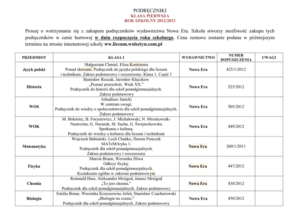 PODRĘCZNIKI KLASA PIERWSZA ROK SZKOLNY 2012/2013 Proszę o wstrzymanie się z zakupem podręczników wydawnictwa Nowa Era. Szkoła stworzy możliwość zakupu tych podręczników w cenie hurtowej w dniu rozpoczęcia roku szkolnego. Cena zestawu zostanie podana w późniejszym terminie na stronie internetowej szkoły ww.liceum.wolsztyn.com.pl PRZEDMIOT Język polski Historia WOS WOK Matematyka Fizyka Chemia Biologia KLASA I Małgorzata Chmiel, Eliza Kostrzewa Ponad słowami. Podręcznik do języka polskiego dla liceum i technikum. Zakres podstawowy i rozszerzony. Klasa 1. Część 1 Stanisław Roszak, Jarosław Kłaczkow „Poznać przeszłość. Wiek XX.” Podręcznik do historii dla szkół ponadgimnazjalnych. Zakres podstawowy Arkadiusz Janicki W centrum uwagi. Podręcznik do wiedzy o społeczeństwie dla szkół ponadgimnazjalnych. Zakres podstawowy M. Bokiniec, B. Forysiewicz, J. Michałowski, N. MrozkowiakNastrożna, G. Nazaruk, M. Sacha, G. Świętochowska Spotkania z kulturą. Podręcznik do wiedzy o kulturze dla liceum i technikum Wojciech Babiański, Lech Chańko, Dorota Ponczek MATeMAtyka 1. Podręcznik dla szkół ponadgimnazjalnych. Zakres podstawowy i rozszerzony Marcin Braun, Weronika Śliwa Odkryć fizykę. Podręcznik dla szkół ponadgimnazjalnych. Kształcenie ogólne w zakresie podstawowym Romuald Hass, Aleksandra Mrzigod, Janusz Mrzigod „To jest chemia.” Podręcznik dla szkół ponadgimnazjalnych. Zakres podstawowy Emilia Bonar, Weronika Krzeszowiec-Jeleń, Stanisław Czachorowski „Biologia na czasie.” Podręcznik dla szkół ponadgimazjalnych. Zakres podstawowy WYDAWNICTWO NUMER DOPUSZCZENIA Nowa Era 425/1/2012 Nowa Era 525/2012 Nowa Era 505/2012 Nowa Era 449/2012 Nowa Era 360/1/2011 Nowa Era 447/2012 Nowa Era 438/2012 Nowa Era 450/2012 UWAGI Geografia Podstawy przedsiębiorczości Radosław Uliszak, Krzysztof Wiedermann Oblicza geografii. Podręcznik dla szkół ponadgimnazjalnych. Zakres podstawowy Zbigniew Makieła, Tomasz Rachwał Krok w przedsiębiorczość. Podręcznik dla szkół ponadgimnazjalnych Nowa Era 433/2012 Nowa Era 467/2012 Informatyka Arkadiusz Gawełek Informatyka. Zakres podstawowy. Podręcznik dla szkół ponadgimnazjalnych OPERON 452/2012 Edukacja dla bezpieczeństwa Jarosław Słoma Żyję i działam bezpiecznie. Podręcznik do edukacji dla bezpieczeństwa dla szkół ponadgimnazjalnych Nowa Era 426/2012 Religia Ks. Jan Szpet, Danuta Jackowiak „Moje miejsce w Kościele” Księgarnia Św. Wojciecha AZ-4-01/10 J. angielski dla wszystkich kontynuujących naukę tego języka, również dla klasy lingwistycznej Marta Rosińska, Philip Kerr „Matura Masters Pre-Intermediate” Macmillan 119/2/2009 J. niemiecki dla kontynuujących naukę tego języka i realizujących w gimnazjum język Alina Dorota Jarząbek, Danuta Koper Motive - Deutsch 1. WSiP 289/1/2010 Wstrzymać się z zakupem podręcznika dokładne informacje na pierwszych zajęciach. Należy zakupić również zeszyt ćwiczeń Podręczniki do religii udostępnia się uczniom w szkole Zakup podręcznika w szkole. Termin zakupu kolejnych części podręcznika podaje nauczyciel prowadzący daną grupę językową Wstrzymać się z zakupem podręcznika dokładne informacje na poziomie III.0 lub III.1) na pierwszych zajęciach J. niemiecki dla kontynuujących naukę w klasie lingwistycznej Krystyna Łuniewska, Urszula Tworek, Zofia Wąsik, Maria Zagórna „Alles klar 1a” – zakres rozszerzony WSiP J. francuski dla wszystkich, którzy wybrali naukę tego języka Regine Boutegege, Magdalena Supryn-Klepcarz Francofolie express 1. Wydawnictwo Szkolne PWN 382/1/2011 J. rosyjski Małgorzata Wiatr-Kmieciak, Sławomira Wujec Wot i my 1. Podręcznik. Język rosyjski dla szkół ponadgimnazjalnych Wydawnictwo Szkolne PWN 324/1/2011 J. hiszpański I. Bueso, R. Gomez, C.Oliva, I. Pardo, M.Ruiz de Gauna, R. Vazquez “PRISMA Comienza A1” Wydawnictwo "Nowela" 482/1/2012 281/2010 Należy zakupić również ćwiczenia Wstrzymać się z zakupem podręcznika dokładne informacje na pierwszych zajęciach.