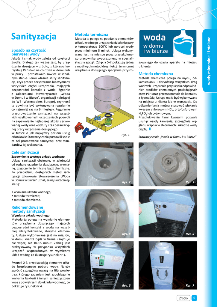 Sposób na czystość pierwszej wody Jakość i smak wody zależą od czystości źródła. Dlatego tak ważne jest, by urządzenie dozujące – źródło, z którego korzystają Państwo na co dzień w domu lub w pracy – pozostawało zawsze w idealnym stanie. Temu właśnie służy sanityzacja, czyli proces oczyszczania lub wymiany wszystkich części urządzenia, mających bezpośredni kontakt z wodą. Zgodnie z zaleceniami Stowarzyszenia „Woda w Domu i w Biurze”, organizacji należącej do WE (Watercoolers Europe), czynność ta powinna być wykonywana regularnie co najmniej raz na 6 miesięcy. Regularne przeprowadzanie sanityzacji na wszystkich użytkowanych urządzeniach pozwoli na zapewnienie najlepszej jakości serwowanej wody oraz wydłuży czas bezawaryjnej pracy urządzenia dozującego. W trosce o jak najwyższy poziom usług członkowie Stowarzyszenia postawili sobie za cel promowanie sanityzacji oraz standardów jej wykonania. Metoda termiczna Metoda ta polega na poddaniu elementów układu wodnego urządzenia działaniu pary o temperaturze 100°C lub gorącej wody przez minimum 5 minut. Usługa wykonywana jest na miejscu przez przeszkolonego pracownika wyposażonego w specjalistyczny sprzęt. Zdjęcia 5-7 pokazują jedną z możliwych metod dezynfekcji termicznej urządzenia dozującego specjalnie przysto- sowanego do użycia aparatu na miejscu u klienta. Metoda chemiczna Metoda chemiczna polega na myciu, odkamienianiu i dezynfekcji wszystkich dróg wodnych urządzenia przy użyciu odpowiednich środków chemicznych posiadających atest PZH oraz przeznaczonych do kontaktu z żywnością. Usługa może być wykonywana na miejscu u klienta lub w warsztacie. Do odkamieniania można stosować płukanie kwasem chlorowym HCL, ortofosforowym H3PO4 lub cytrynowym. Przepłukiwanie tymi kwasami pozwala usunąć osady kamienia, szczególnie węglanu wapnia w zbiornikach i układzie wody ciepłej. Rys. 1. Stowarzyszenie „Woda w Domu i w Biurze” Cele sanityzacji Zapewnienie czystego układu wodnego Usługa sanityzacji obejmuje, w zależności od rodzaju urządzenia dozującego, wymianę, czyszczenie termiczne bądź chemiczne. Po przebadaniu dostępnych metod sanityzacji członkowie Stowarzyszenia „Woda w Domu i w Biurze” uznali, że najskuteczniejsze są: Rys. 2 Rys. 3 Rys. 4 Rys. 5 Rys. 6 Rys. 7 • wymiana układu wodnego; • metoda termiczna; • metoda chemiczna. Rekomendowane metody sanityzacji Wymiana układu wodnego Metoda ta polega na wymianie elementów urządzenia dozującego mających bezpośredni kontakt z wodą na wcześniej zdezynfekowane, sterylne elementy. Usługa wykonywana jest na miejscu, w domu klienta bądź w firmie i zajmuje nie więcej niż 10-15 minut. Zabieg jest praktykowany w przypadku wszystkich urządzeń wyposażonych w wymienny układ wodny, co ilustruje rysunek nr 1. Rysunki 2-3 przedstawiają elementy układu bezpiecznego poboru wody. Należy zwrócić szczególną uwagę na filtr powietrza, którego zadaniem jest zapobieganie wnikania bakterii i innych zanieczyszczeń wraz z powietrzem do układu wodnego, co pokazuje rysunek nr 4. Źródło wody mineralne i źródlane Sanityzacja