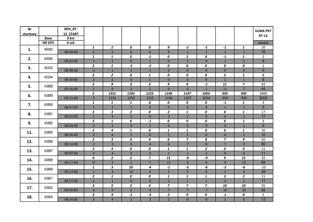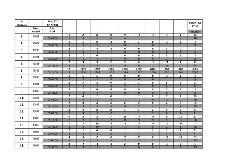 Nr startowy Baza NR GPS 1. 40082 2. 40084 3. 40243 4. 40244 5. 43888 6. 43889 7. 43890 8. 43891 9. 43892 11. 43895 12. 43896 13. 43897 14. 43898 15. 43899 16. 43901 17. 43902 18. 43904 RPH_RT12_START 0 km 0 sek 08:49:00 08:42:00 08:48:00 08:50:00 09:16:00 09:21:00 08:47:00 08:55:00 08:44:00 08:56:00 09:14:00 09:07:00 09:17:00 09:13:00 08:57:00 09:00:00 08:54:00 SUMA PKT RT-12 1 1 1 1 2 2 2 2 2 2 2 2 1 1 2 2 2 2 2 2 2 2 3 3 0 0 1 1 2 2 3 3 3 3 2 2 1 1 1 1 2 2 9 9 1331 1331 1 1 3 3 1 1 4 4 3 3 4 4 2 2 3 3 1 1 5 5 4 4 0 0 0 0 -1 1 0 0 3 3 1292 1292 1 1 2 2 0 0 1 1 4 4 0 0 2 2 10 10 0 0 2 2 -1 1 0 0 -1 1 -1 1 1 1 2 2 1225 1225 0 0 0 0 -1 1 0 0 4 4 0 0 7 7 -4 4 0 0 4 4 -2 2 9 9 0 0 0 0 0 0 9 9 1196 1196 0 0 2 2 0 0 1 1 6 6 1 1 15 15 -1 1 1 1 7 7 2 2 -1 1 1 1 0 0 0 0 0 0 1107 1107 0 0 1 1 0 0 1 1 7 7 1 1 -9 9 -5 5 1 1 7 7 0 0 -1 1 0 0 0 0 0 0 -1 1 1054 1054 0 0 0 0 0 0 0 0 8 8 2 2 -9 9 -6 6 1 1 7 7 0 0 -1 1 -1 1 0 0 2 2 11 11 950 950 -1 1 6 6 0 0 0 0 7 7 0 0 9 9 -2 2 3 3 10 10 -1 1 1 1 1 1 0 0 1 1 7 7 940 940 1 1 1 1 1 1 1 1 9 9 0 0 15 15 -6 6 2 2 10 10 0 0 moduł 10 16 2 6 1 5 8 8 42 44 3000 3000 3 5 17 17 3 5 10 10 50 50 11 11 32 68 -10 38 11 11 55 55 5 13