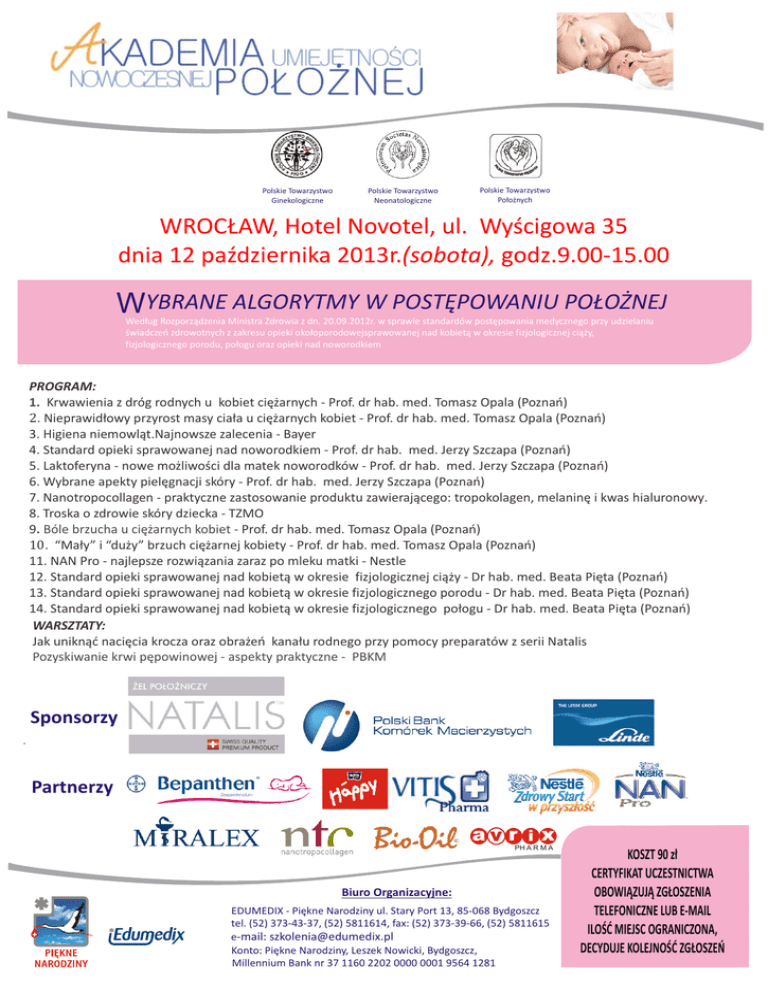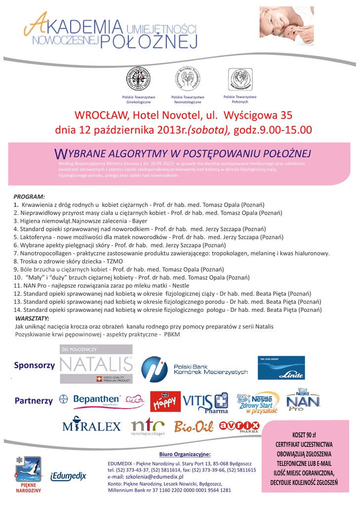 Polskie Towarzystwo Ginekologiczne Polskie Towarzystwo Neonatologiczne Polskie Towarzystwo Położnych WROCŁAW, Hotel Novotel, ul. Wyścigowa 35 dnia 12 października 2013r.(sobota), godz.9.00-15.00 WYBRANE ALGORYTMY W POSTĘPOWANIU POŁOŻNEJ Według Rozporządzenia Ministra Zdrowia z dn. 20.09.2012r. w sprawie standardów postępowania medycznego przy udzielaniu świadczeń zdrowotnych z zakresu opieki okołoporodowejsprawowanej nad kobietą w okresie fizjologicznej ciąży, fizjologicznego porodu, połogu oraz opieki nad noworodkiem PROGRAM: 1. Krwawienia z dróg rodnych u kobiet ciężarnych - Prof. dr hab. med. Tomasz Opala (Poznań) 2. Nieprawidłowy przyrost masy ciała u ciężarnych kobiet - Prof. dr hab. med. Tomasz Opala (Poznań) 3. Higiena niemowląt.Najnowsze zalecenia - Bayer 4. Standard opieki sprawowanej nad noworodkiem - Prof. dr hab. med. Jerzy Szczapa (Poznań) 5. Laktoferyna - nowe możliwości dla matek noworodków - Prof. dr hab. med. Jerzy Szczapa (Poznań) 6. Wybrane apekty pielęgnacji skóry - Prof. dr hab. med. Jerzy Szczapa (Poznań) 7. Nanotropocollagen - praktyczne zastosowanie produktu zawierającego: tropokolagen, melaninę i kwas hialuronowy. 8. Troska o zdrowie skóry dziecka - TZMO 9. Bóle brzucha u ciężarnych kobiet - Prof. dr hab. med. Tomasz Opala (Poznań) 10. “Mały” i “duży” brzuch ciężarnej kobiety - Prof. dr hab. med. Tomasz Opala (Poznań) 11. NAN Pro - najlepsze rozwiązania zaraz po mleku matki - Nestle 12. Standard opieki sprawowanej nad kobietą w okresie fizjologicznej ciąży - Dr hab. med. Beata Pięta (Poznań) 13. Standard opieki sprawowanej nad kobietą w okresie fizjologicznego porodu - Dr hab. med. Beata Pięta (Poznań) 14. Standard opieki sprawowanej nad kobietą w okresie fizjologicznego połogu - Dr hab. med. Beata Pięta (Poznań) WARSZTATY: Jak uniknąć nacięcia krocza oraz obrażeń kanału rodnego przy pomocy preparatów z serii Natalis Pozyskiwanie krwi pępowinowej - aspekty praktyczne - PBKM Sponsorzy . Partnerzy av r i x PH . ARMA Biuro Organizacyjne: EDUMEDIX - Piękne Narodziny ul. Stary Port 13, 85-068 Bydgoszcz tel. (52) 373-43-37, (52) 5811614, fax: (52) 373-39-66, (52) 5811615 e-mail: [email protected] Konto: Piękne Narodziny, Leszek Nowicki, Bydgoszcz, Millennium Bank nr 37 1160 2202 0000 0001 9564 1281 KOSZT 90 zł CERTYFIKAT UCZESTNICTWA OBOWIĄZUJĄ ZGŁOSZENIA TELEFONICZNE LUB E-MAIL ILOŚĆ MIEJSC OGRANICZONA, DECYDUJE KOLEJNOŚĆ ZGŁOSZEŃ