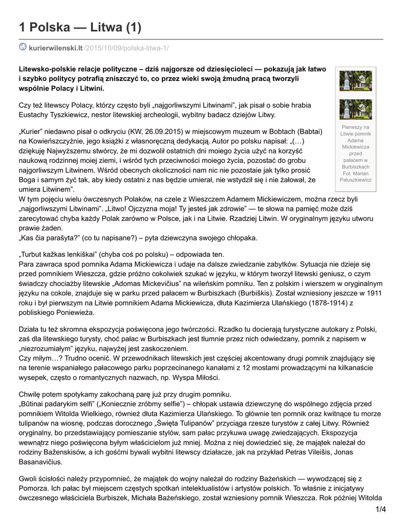 1 Polska — Litwa (1) kurierwilenski.lt /2015/10/09/polska-litwa-1/ Litewsko-polskie relacje polityczne – dziś najgorsze od dziesięcioleci — pokazują jak łatwo i szybko politycy potrafią zniszczyć to, co przez wieki swoją żmudną pracą tworzyli wspólnie Polacy i Litwini. Czy też litewscy Polacy, którzy często byli „najgorliwszymi Litwinami”, jak pisał o sobie hrabia Eustachy Tyszkiewicz, nestor litewskiej archeologii, wybitny badacz dziejów Litwy. Pierwszy na „Kurier” niedawno pisał o odkryciu (KW, 26.09.2015) w miejscowym muzeum w Bobtach (Babtai) Litwie pomnik Adama na Kowieńszczyźnie, jego książki z własnoręczną dedykacją. Autor po polsku napisał: „(…) Mickiewicza dziękuję Najwyższemu stwórcy, że mi dozwolił ostatnich dni moiego życia użyć na korzyść przed pałacem w naukową rodzinnej moiej ziemi, i wśród tych przeciwności moiego życia, pozostać do grobu Burbiszkach najgorliwszym Litwinem. Wśród obecnych okoliczności nam nic nie pozostaie jak tylko prosić Fot. Marian Paluszkiewicz Boga i samym żyć tak, aby kiedy ostatni z nas będzie umierał, nie wstydził się i nie żałował, że umiera Litwinem”. W tym pojęciu wielu ówczesnych Polaków, na czele z Wieszczem Adamem Mickiewiczem, można rzecz byli „najgorliwszymi Litwinami”. „Litwo! Ojczyzna moja! Ty jesteś jak zdrowie” — te słowa na pamięć może dziś zarecytować chyba każdy Polak zarówno w Polsce, jak i na Litwie. Rzadziej Litwin. W oryginalnym języku utworu prawie żaden. „Kas čia parašyta?” (co tu napisane?) – pyta dziewczyna swojego chłopaka. „Turbut kažkas lenkiškai” (chyba coś po polsku) – odpowiada ten. Para zawraca spod pomnika Adama Mickiewicza i udaje na dalsze zwiedzanie zabytków. Sytuacja nie dzieje się przed pomnikiem Wieszcza, gdzie próżno cokolwiek szukać w języku, w którym tworzył litewski geniusz, o czym świadczy chociażby litewskie „Adomas Mickevičius” na wileńskim pomniku. Ten z polskim i wierszem w oryginalnym języku na cokole, znajduje się w parku przed pałacem w Burbiszkach (Burbiškis). Został wzniesiony jeszcze w 1911 roku i był pierwszym na Litwie pomnikiem Adama Mickiewicza, dłuta Kazimierza Ulańskiego (1878-1914) z pobliskiego Poniewieża. Działa tu też skromna ekspozycja poświęcona jego twórczości. Rzadko tu docierają turystyczne autokary z Polski, zaś dla litewskiego turysty, choć pałac w Burbiszkach jest tłumnie przez nich odwiedzany, pomnik z napisem w „niezrozumiałym” języku, najwyżej jest zaskoczeniem. Czy miłym…? Trudno ocenić. W przewodnikach litewskich jest częściej akcentowany drugi pomnik znajdujący się na terenie wspaniałego pałacowego parku poprzecinanego kanałami z 12 mostami prowadzącymi na kilkanaście wysepek, często o romantycznych nazwach, np. Wyspa Miłości. Chwilę potem spotykamy zakochaną parę już przy drugim pomniku. „Būtinai padarykim selfi” („Koniecznie zróbmy selfie”) – chłopak ustawia dziewczynę do wspólnego zdjęcia przed pomnikiem Witolda Wielkiego, również dłuta Kazimierza Ulańskiego. To głównie ten pomnik oraz kwitnące tu morze tulipanów na wiosnę, podczas dorocznego „Święta Tulipanów” przyciąga rzesze turystów z całej Litwy. Również oryginalny, bo przedstawiający pomieszanie stylów, sam pałac przykuwa uwagę zwiedzających. Ekspozycja wewnątrz niego poświęcona byłym właścicielom już mniej. Można z niej dowiedzieć się, że majątek należał do rodziny Baženskisów, a ich gośćmi bywali wybitni litewscy działacze, jak na przykład Petras Vileišis, Jonas Basanavičius. Gwoli ścisłości należy przypomnieć, że majątek do wojny należał do rodziny Bażeńskich — wywodzącej się z Pomorza. Ich pałac był miejscem częstych spotkań intelektualistów i artystów polskich. To właśnie z inicjatywy ówczesnego właściciela Burbiszek, Michała Bażeńskiego, został wzniesiony pomnik Wieszcza. Rok później Witolda 1/4 Wielkiego. Po wojnie Bażeńscy przenieśli się na teren pojałtańskiej Polski. W 1991 roku potomek rodu Adam Bażeński odwiedził swoją ojcowiznę i przekazał ją niepodległej Litwie, pod warunkiem, że zespół pałacowo-parkowy zostanie odrestaurowany i udostępniony zwiedzającym. Historia Burbiszek jest również związana z postacią Kornela Makuszyńskiego (1884-1953), autora słynnego kanonu polskiej literatury dziecięcej „120 przygód Koziołka Matołka”. Makuszyński był mężem córki Michała Ignacego Bażeńskiego, Emilii (1881-1926). Mieszkali oni w Burbiszkach w latach 1913-14, a później w latach 1922-25 często tu przyjeżdżali. Właśnie w 1923 r. podczas swoich wakacji „na Litwie” Makuszyński napisał poemat „Pieśń o ojczyźnie” — trzy lata później odznaczony nagrodą państwową. O tym próżno szukać informacji w przewodnikach litewskich. Tak samo, jak trudno nieznającemu turyście skojarzyć informacje w nich, że Bordzie (Bijotai) związane z życiem i twórczością Dionizego Paszkiewicza (1757-1830). Polsko-litewskiego pisarza, filologa, kolekcjonera i historyka autor m. in. słownika litewsko-polsko-łacińskiego „ukrywa się” dziś pod nazwiskiem Dionizas Poška. Paszkiewicz vel Poška fascynował się badaniami nad etnografią Żmudzi. W 1812 roku kazał ściąć tysiącletni dąb i we wnętrzu jego pnia zorganizował oryginalne muzeum pamiątek historycznych z czasów Rzeczypospolitej Obojga Narodów, które posłużyło też inspiracją w twórczości Adama Mickiewicza. Dziś w Bordziech znajduje się oryginalne muzeum Baublisów – ekspozycji w pniach dębów, mieszczące się na terenie parku z pozostałościami po pałacu. Jak wynika z miejscowego przewodnika, „Dionizas Poška” miał brata „Norberta Paškevičiusa”, który to właśnie na przy dworku w Bordziech utworzył park. Po wojnie park i dworek należał do kołchozu im. Poški. Obecnie pozostały tylko ruiny 