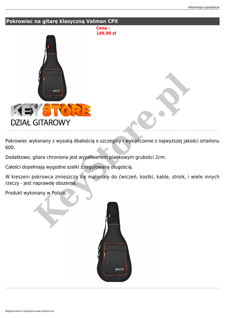 Informacje o produkcie Pokrowiec na gitarę klasyczną Vatman CPX or e. pl Cena : 149,00 zł Pokrowiec wykonany z wysoką dbałością o szczegóły i wykończenie z najwyższej jakości ortalionu 600. St Dodatkowo, gitara chroniona jest wypełnienem piankowym grubości 2cm. Całości dopełniają wygodne szelki z regulowaną długością. ey W kieszeni pokrowca zmieszczą się materiały do ćwiczeń, kostki, kable, stroik, i wiele innych rzeczy - jest naprawdę obszerna. K Produkt wykonany w Polsce. Wygenerowano w programie www.oscGold.com
