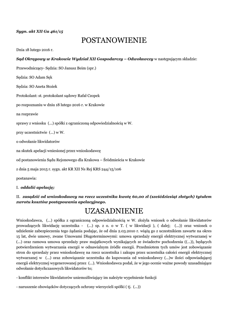 Sygn. akt XII Ga 461/15 POSTANOWIENIE Dnia 18 lutego 2016 r. Sąd Okręgowy w Krakowie Wydział XII Gospodarczy – Odwoławczy w następującym składzie: Przewodniczący- Sędzia: SO Janusz Beim (spr.) Sędzia: SO Adam Sęk Sędzia: SO Aneta Stożek Protokolant: st. protokolant sądowy Rafał Czopek po rozpoznaniu w dniu 18 lutego 2016 r. w Krakowie na rozprawie sprawy z wniosku (...) spółki z ograniczoną odpowiedzialnością w W. przy uczestnictwie (...) w W. o odwołanie likwidatorów na skutek apelacji wniesionej przez wnioskodawcę od postanowienia Sądu Rejonowego dla Krakowa – Śródmieścia w Krakowie z dnia 5 maja 2015 r. sygn. akt KR XII Ns Rej KRS 244/15/106 postanawia: I. oddalić apelację; II. zasądzić od wnioskodawcy na rzecz uczestnika kwotę 60,00 zł (sześćdziesiąt złotych) tytułem zwrotu kosztów postępowania apelacyjnego. UZASADNIENIE Wnioskodawca, (...) spółka z ograniczoną odpowiedzialnością w W. złożyła wniosek o odwołanie likwidatorów prowadzących likwidację uczestnika - (...) sp. z o. o w T. ( w likwidacji ), ( dalej; (...)) oraz wniosek o udzielenie zabezpieczenia tego żądania podając, że od dnia 2.03.2010 r. wiążą go z uczestnikiem zawarte na okres 15 lat, dwie umowy, zwane Umowami Długoterminowymi: umowa sprzedaży energii elektrycznej wytwarzanej w (...) oraz ramowa umowa sprzedaży praw majątkowych wynikających ze świadectw pochodzenia ((...)), będących potwierdzeniem wytwarzania energii w odnawialnym źródle energii. Przedmiotem tych umów jest zobowiązanie stron do sprzedaży przez wnioskodawcę na rzecz uczestnika i zakupu przez uczestnika całości energii elektrycznej wytwarzanej w (...) oraz zobowiązanie uczestnika do kupowania od wnioskodawcy (...)w ilości odpowiadającej energii elektrycznej wygenerowanej przez (...). Wnioskodawca podał, że w jego ocenie ważne powody uzasadniające odwołanie dotychczasowych likwidatorów to; - konflikt interesów likwidatorów uniemożliwiający im należyte wypełnienie funkcji - naruszenie obowiązków dotyczących ochrony wierzycieli spółki ( tj. (...)) - uchylanie się od zakończenia bieżących interesów spółki, tj. wykonania lub zgodnego z prawem rozwiązania umów długoterminowych wiążących (...) z wnioskodawcą. Wnioskodawca obszernie i szczegółowo opisał powyższe okoliczności. Wnioskodawca stwierdził nadto we wniosku, że ma interes prawny w uzyskaniu zabezpieczenia roszczenia, ponieważ jego wierzytelności w stosunku do uczestnika nie zostały dotychczas zaspokojone ani zabezpieczone przez likwidatorów. Zdaniem wnioskodawcy likwidatorzy ochraniają interesy jedynego wspólnika spółki, naruszając interesy pozostałych wierzycieli, a zmiana likwidatorów przywróciłaby właściwy bieg postępowania likwidacyjnego, czyniąc je zgodnym z przepisami k.s.h. Podniósł wnioskodawca, że zachodzi uzasadniona obawa podjęcia w niedalekiej przyszłości przez likwidatorów działań uniemożliwiających realizację celów postępowania likwidacyjnego oraz naruszających prawa wnioskodawcy. Zarzucił, że likwidatorzy realizują czynności likwidacyjne w sposób wybiórczy, konsekwentnie pomijając czynności mające na celu wypełnienie zobowiązań uczestnika wynikających z Umów Długoterminowych oraz zabezpieczenie wierzytelności przysługujących wnioskodawcy z tego tytułu. Jako podstawę prawną swojego wniosku wnioskodawca wskazał regulacje art. 276 § 4 ksh. Postanowieniem z dnia 13 stycznia 2015 r. sąd rejestrowy udzielił zabezpieczenia. Powyższe postanowienie w całości zaskarżył zażaleniem uczestnik , wnosząc o zmianę zaskarżonego postanowienia i oddalenie wniosku o udzielenie zabezpieczenia, a także o zasądzenie od wnioskodawcy kosztów postępowania zażaleniowego. Na wypadek nieuwzględnienia zażalenia uczestnik wniósł o wstrzymanie wykonalności zaskarżonego postanowienia. Zaskarżonemu postanowieniu uczestnik zarzucił: - naruszenie art. 7301 § 1 k.p.c. w zw. z art. 276 § 4 k.s.h. przez przyjęcie, że wnioskodawca uprawdopodobnił roszczenie i przez udzielenie zabezpieczenia, pomimo, że: * wnioskodawcy nie przysługuje roszczenie z art. 276 § 4 k.s.h. o odwołanie likwidatorów, bowiem nie jest on podmiotem uprawnionym do złożenia takiego wniosku ani nie ma interesu prawnego o jakim mowa w tym przepisie * wnioskodawca błędnie sformułował wniosek o odwołanie likwidatorów, przez co wniosek w ogóle nie może stanowić podstawy do odwołania likwidatorów, bowiem wnioskodawca nie wniósł jednocześnie o ustanowienie nowych likwidatorów; a skoro roszczenie nie może zostać uwzględnione, to nie może być zabezpieczone - naruszenie art. 7301 § 1 i 2 k.p.c. w zw. z art. 276 § 4 k.s.h. przez udzielenie zabezpieczenia, mimo, ze wnioskodawca nie ma interesu prawnego w jego uzyskaniu, gdyż brak zabezpieczenia w żaden sposób nie uniemożliwi ani nie utrudni osiągnięcia celu postępowania jakim jest w intencji wnioskodawcy odwołanie likwidatorów - naruszenie art. 755 § 1 k.p.c. w zw. z art. 7301 § 3 k.p.c. przez zastosowanie nieadekwatnych do zgłoszonego żądania sposobów zabezpieczenia, co potwierdza, że faktycznym celem wniosku jest paraliż postępowania likwidacyjnego, bowiem wskazane we wniosku sposoby zabezpieczenia dotyczą dalszego przebiegu likwidacji, który nie podlega nadzorowi sądu rejestrowego - naruszenie art. 328 § 2 k.p.c. w zw. z art. 361 k.p.c. w zw. z art. 13 § 2 k.p.c. przez zaniechanie wyjaśnienia podstawy prawnej zaskarżonego postanowienia, ponieważ Sąd nie przedstawił ani faktów, jakie uznał za udowodnione, ani dowodów ani własnej oceny prawnej koniecznych przesłanek zabezpieczenia, co uniemożliwia poznanie motywów rozstrzygnięcia, tym bardziej, ze wraz z postanowieniem nie doręczono uczestnikowi wniosku o udzielenie zabezpieczenia W obszernym uzasadnieniu zażalenia uczestnik podniósł, że wnioskodawca oraz inne spółki związane długoterminowymi umo