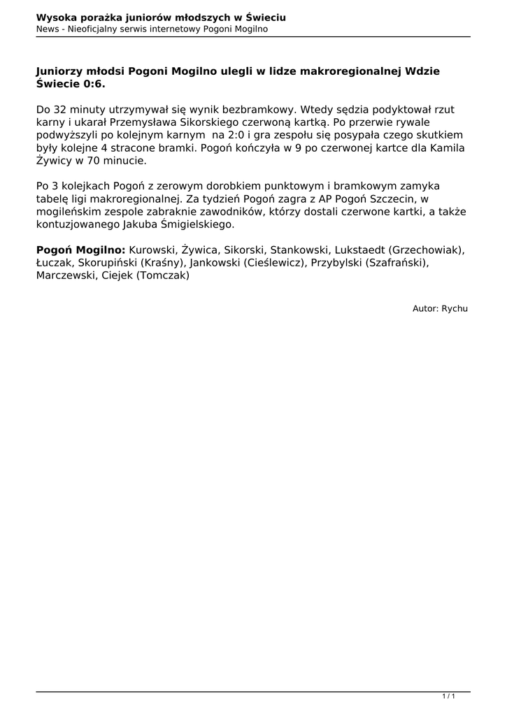 Wysoka porażka juniorów młodszych w Świeciu News - Nieoficjalny serwis internetowy Pogoni Mogilno Juniorzy młodsi Pogoni Mogilno ulegli w lidze makroregionalnej Wdzie Świecie 0:6. Do 32 minuty utrzymywał się wynik bezbramkowy. Wtedy sędzia podyktował rzut karny i ukarał Przemysława Sikorskiego czerwoną kartką. Po przerwie rywale podwyższyli po kolejnym karnym na 2:0 i gra zespołu się posypała czego skutkiem były kolejne 4 stracone bramki. Pogoń kończyła w 9 po czerwonej kartce dla Kamila Żywicy w 70 minucie. Po 3 kolejkach Pogoń z zerowym dorobkiem punktowym i bramkowym zamyka tabelę ligi makroregionalnej. Za tydzień Pogoń zagra z AP Pogoń Szczecin, w mogileńskim zespole zabraknie zawodników, którzy dostali czerwone kartki, a także kontuzjowanego Jakuba Śmigielskiego. Pogoń Mogilno: Kurowski, Żywica, Sikorski, Stankowski, Lukstaedt (Grzechowiak), Łuczak, Skorupiński (Kraśny), Jankowski (Cieślewicz), Przybylski (Szafrański), Marczewski, Ciejek (Tomczak) Autor: Rychu 1/1 Powered by TCPDF (www.tcpdf.org)