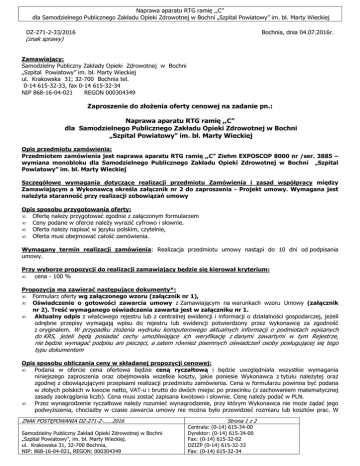 Naprawa aparatu RTG ramię ,,C” dla Samodzielnego Publicznego Zakładu Opieki Zdrowotnej w Bochni „Szpital Powiatowy” im. bł. Marty Wieckiej DZ-271-2-33/2016 Bochnia, dnia 04.07.2016r. (znak sprawy) Zamawiający: Samodzielny Publiczny Zakłady Opieki Zdrowotnej w Bochni „Szpital Powiatowy” im. bł. Marty Wieckiej ul. Krakowska 31; 32-700 Bochnia tel. 0-14 615-32-33, fax 0-14 615-32-34 NIP 868-16-04-021 REGON 000304349 Zaproszenie do złożenia oferty cenowej na zadanie pn.: Naprawa aparatu RTG ramię ,,C” dla Samodzielnego Publicznego Zakładu Opieki Zdrowotnej w Bochni „Szpital Powiatowy” im. bł. Marty Wieckiej Opis przedmiotu zamówienia: Przedmiotem zamówienia jest naprawa aparatu RTG ramię ,,C” Ziehm EXPOSCOP 8000 nr /ser. 3885 – wymiana monobloku dla Samodzielnego Publicznego Zakładu Opieki Zdrowotnej w Bochni „Szpital Powiatowy” im. bł. Marty Wieckiej Szczegółowe wymagania dotyczące realizacji przedmiotu Zamówienia i zasad współpracy między Zamawiającym a Wykonawcą określa załącznik nr 2 do zaproszenia - Projekt umowy. Wymagana jest należyta staranność przy realizacji zobowiązań umowy Opis sposobu przygotowania oferty: • Ofertę należy przygotować zgodnie z załączonym formularzem • Ceny podane w ofercie należy wyrazić cyfrowo i słownie. • Oferta należy napisać w języku polskim, czytelnie, • Oferta musi obejmować całość zamówienia. Wymagany termin realizacji zamówienia: Realizacja przedmiotu umowy nastąpi do 10 dni od podpisania umowy. Przy wyborze propozycji do realizacji zamawiający będzie się kierował kryterium: • cena - 100 % Propozycja ma zawierać następujące dokumenty*: • Formularz oferty wg załączonego wzoru (załącznik nr 1), • Oświadczenie o gotowości zawarcia umowy z Zamawiającym na warunkach wzoru Umowy (załącznik nr 2). Treść wymaganego oświadczenia zawarta jest w załączniku nr 1. • Aktualny odpis z właściwego rejestru lub z centralnej ewidencji i informacji o działalności gospodarczej, jeżeli odrębne przepisy wymagają wpisu do rejestru lub ewidencji potwierdzony przez wykonawcę za zgodność z oryginałem. W przypadku złożenia wydruku komputerowego aktualnych informacji o podmiotach wpisanych do KRS, jeżeli będą posiadać cechy umożliwiające ich weryfikację z danymi zawartymi w tym Rejestrze, nie będzie wymagać podpisu ani pieczęci, a zatem również pisemnych oświadczeń osoby posługującej się tego typu dokumentem Opis sposobu obliczania ceny w składanej propozycji cenowej: • Podana w ofercie cena ofertowa będzie ceną ryczałtową i będzie uwzględniała wszystkie wymagania niniejszego zaproszenia oraz obejmowała wszelkie koszty, jakie poniesie Wykonawca z tytułu należytej oraz zgodnej z obowiązującymi przepisami realizacji przedmiotu zamówienia. Cena w formularzu powinna być podana w złotych polskich w kwocie netto, VAT-u i brutto do dwóch miejsc po przecinku (z zachowaniem matematycznej zasady zaokrąglania liczb). Cena musi zostać zapisana kwotowo i słownie. Cenę należy podać w PLN. • Przez wynagrodzenie ryczałtowe należy rozumieć wynagrodzenie, przy którym Wykonawca nie może żądać jego podwyższenia, chociażby w czasie zawarcia umowy nie można było przewidzieć rozmiaru lub kosztów prac. W ZNAK POSTĘPOWANIA DZ-271-2-……2016 Samodzielny Publiczny Zakład Opieki Zdrowotnej w Bochni „Szpital Powiatowy”, im. bł. Marty Wieckiej. ul. Krakowska 31, 32-700 Bochnia, NIP: 868-16-04-021, REGON: 000304349 Strona 1 z 2 Centrala: (0-14) 615-34-00 Dyrektor: (0-14) 615-34-00 Fax: (0-14) 615-32-02 DZIZP (0-14) 615-32-33 Fax: (0-14) 615-32-34 Naprawa aparatu RTG ramię ,,C” dla Samodzielnego Publicznego Zakładu Opieki Zdrowotnej w Bochni „Szpital Powiatowy” im. bł. Marty Wieckiej • związku z powyższym cena oferty musi zawierać wszelkie koszty niezbędne do zrealizowania zamówienia, wynikające wprost z opisu przedmiotu zamówienia, jak również nie ujęte w nich, a bez których nie można wykonać zamówienia. Dla porównania ofert Zamawiający przyjmie cenę brutto obejmującą podatek od towarów i usług (VAT) za całość zamówienia. Określenie stawki podatku VAT jest obowiązkiem Wykonawcy. Cenę oferty należy podać w złotych polskich netto i brutto z uwzględnieniem stawki podatku VAT w „FORMULARZU OFERTOWYM” z zaokrągleniem do dwóch miejsc po przecinku. Miejsce i termin złożenia oferty: Ofertę należy złożyć do dnia 08.07.2016 r. do godziny 12:00 w siedzibie Zamawiającego lub przesłać faksem na numer 014 615 32 34 lub drogą elektroniczną na adres [email protected] (liczy się data i godzina wpływu do Zamawiającego) Osobami uprawnionymi do kontaktów z wykonawcami z ramienia zamawiającego są: Zamawiający zaleca przesyłanie ewentualnych zapytań dotyczących treści specyfikacji drogą email w formacie WORD na adres [email protected], tel./fax (0-14) 615-32-33/34 Godziny pracy Zamawiającego - 7:30 - 15:05 Informacje dotyczące zawierania umowy: Po dokonanym wyborze najkorzystniejszej oferty wybrany Wykonawca podpisze umowę w terminie i miejscu określonym przez Zamawiającego wg. projektu stanowiącego załącznik nr 2 do zaproszenia. Zamawiający zastrzega sobie prawo do: • zakończenia postępowania bez dokonania wyboru którejkolwiek z ofert • unieważnienia postępowania bez podania przyczyn. • zmiany warunków postępowania bez podania przyczyn. Dyrektor Jarosław Kycia ZNAK POSTĘPOWANIA DZ-271-2-……2016 Samodzielny Publiczny Zakład Opieki Zdrowotnej w Bochni „Szpital Powiatowy”, im. bł. Marty Wieckiej. ul. Krakowska 31, 32-700 Bochnia, NIP: 868-16-04-021, REGON: 000304349 Strona 2 z 2 Centrala: (0-14) 615-34-00 Dyrektor: (0-14) 615-34-00 Fax: (0-14) 615-32-02 DZIZP (0-14) 615-32-33 Fax: (0-14) 615-32-34