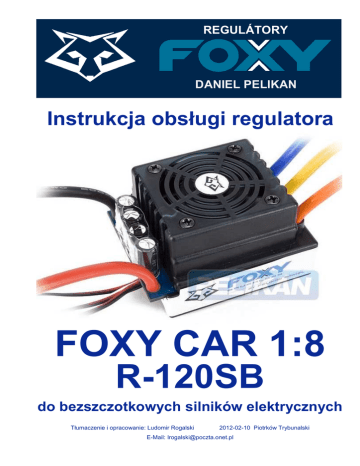 REGULÁTORY DANIEL PELIKAN Instrukcja obsługi regulatora FOXY CAR 1:8 R-120SB do bezszczotkowych silników elektrycznych Tłumaczenie i opracowanie: Ludomir Rogalski 2012-02-10 Piotrków Trybunalski E-Mail: [email protected] Regulátory FOXY CAR R - 120SB Spis treści Strona ■ Wstęp ……………………………………………………………………………………………………………………………………………………………………………………………………….…………….………………….. 3 ■ Opis i funkcje ……………………………………………………………………………………………………………………………………………….………………….………………………………..…….…………. 3 ■ Funkcje programowalne ……………………………………………………………………………………………………………………………………………………………..………………..…….… 3 ■ Podstawowe dane techniczne ……………………………………………………………………………………………………………………..……………………………………..………… 4 ■ Podłączanie regulatora FOXY CAR 1:8 ………………………………………………………………………………………….…………………………….……...……..…….. 4 ○ Schemat podłączania regulatora FOXY CAR 1:8 R-120SB …………………………..…………………………………..………..………. 6 ■ Programowanie regulatora FOXY CAR 1:8 ……….…………………………………………………………………………………………………………………….……. 7 ○ Kalibracja drąŜka gazu …………………………………………………………………………………………………………………………………….………………………..…………….…..…… 7 ■ Funkcje programowalne/Ustawienia domyślne ………………………………………….………………………………………………….…………..……….……… 8 ■ Opis funkcji programowalnych .................................................................................................................................................................................................................…..………. 9 1. PCO (Power Cut Off) – napięcie odcięcia silnika napędowego …………………………………………………………..….….…… 9 2. Tryby jazdy …………………………………………………………………………………………………………………………………………………………………………….…………………………..…………. 9 3. Kąt wyprzedzenia (Komutacja) ………………………………………………………………………………………………………………………………...………………...…………. 10 4. Przyśpieszenie ………………………………………………………………………………………………………………………………………………………….…………………………….…..……….…… 11 5. Moc silnika na biegu wstecznym……………………………………………………………………………………..……………………………..……………………………..……… 11 6. Limit gazu ………………………………………………………………….………………………………………………………………………………………..……………………………………..…………….……… 11 7. Intensywność hamowania ……………………………………………………………………………………………………………………………………………………………..…….………. 11 8. Intensywność hamulca w „neutrum” ……………………………………………….…………………………………………………....……………………………….……..…. 11 9. Częstotliwość PWM ………………………………………………………………………….………………………………………………………………………………………………………………. 12 10. Szerokość „neutrum” ……………………………………………………………………………………………………………………………………………………………………….………………… 12 ■ Zasady bezpiecznej eksploatacji ………………………………………………………………………………………………………………………………………………….……………. 12 ■ Programowanie regulatora kartą programującą FOXY CARD CAR 1:8 ………………………….……..….……..…………. 13 © 2012 Ludomir Rogalski Regulatory FOXY CAR R-120SB 2/15 Regulátory FOXY CAR R - 120SB Drogi Przyjacielu, dziękujemy, Ŝe zechciałeś kupić nasz nowy produkt, elektroniczny regulator obrotów do bezszczotkowych silników elektrycznych. Regulatory linii FOXY CAR pokrywają cały zakres zastosowań w modelach samochodów RC klas Off-Road i On-Road, począwszy od modeli w skali 1:18 a skończywszy na modelach w skali 1:8. Jesteś posiadaczem nowoczesnego regulatora z rozszerzonymi moŜliwościami progra mowania i ustawiania wymaganych parametrów. Regulator FOXY CAR R-120 SB moŜesz łatwo i szybko programować kartą programującą FOXY CARD CAR 1:8. Karta sprzedawana jest w komplecie z regulatorem. Regulatory posiadają zintegrowany, bardzo wydajny zasilacz impulsowy SBEC, który umoŜliwia uŜycie serwomechanizm