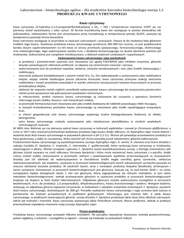 Laboratorium – biotechnologia ogólna – dla studentów kierunku biotechnologia wersja 1.3 PRODUKCJA KWASU CYTRYNOWEGO Kwas cytrynowy Kwas cytrynowy (2-hydroksy-1,2,3-propanotrikarboksylowy) o Mcz = 192 i temperaturze topnienia 153ºC po raz pierwszy został wyizolowany z soku cytryn. W formie krystalicznej kwas ten występuje w postaci bezwodnej lub jednowodnej. Jednowodna forma jest otrzymywana przez krystalizację w temperaturze poniżej 36,6ºC, powyżej tej temperatury powstaje forma bezwodna. Kwas cytrynowy występuje w przyrodzie w owocach cytrusowych i ananasach. Owoce te do niedawna były głównym źródłem tego kwasu. Światowa produkcja kwasu cytrynowego przekracza 300 000 ton rocznie, co jest podyktowane bardzo dużym zapotrzebowaniem na ten kwas ze strony przemysłu spożywczego, farmaceutycznego, chemicznego oraz metalurgicznego. Jego wykorzystanie wynika m.in. z działania konserwującego na skutek obniżania wartości pH środowiska. Jednocześnie jest związkiem nietoksycznym, o dobrych walorach smakowych i zapachowych. Zastosowanie kwasu cytrynowego i jego pochodnych w produkcji i przetwórstwie żywności jest stosowany (za zgodą FAO/WHO) jako inhibitor enzymów, głównie oksydaz powodujących utlenianie polifenoli, co objawia się ciemnieniem owoców i warzyw, wykorzystywany jest do produkcji napojów, słodyczy, owoców kandyzowanych i win, jako środek zakwaszający i stabilizujący, tworzenie połączeo kompleksowych z jonami metali (Fe, Cu, Zn) zadecydowało o zastosowaniu jako stabilizatora olejów; wiążąc metale katalizujące proces jełczenia tłuszczów, kwas cytrynowy przerywa reakcję tworzenia nadtlenków i innych produktów powstałych w wyniku utleniania nienasyconych kwasów tłuszczowych w procesie autooksydacji olejów, zdolnośd do wiązania metali ciężkich umożliwiła wykorzystanie kwasu cytrynowego do oczyszczania powierzchni metali przed spawaniem lub pokrywaniem powłokami ochronnymi, w mleczarstwie, wodne roztwory kwasu cytrynowego są stosowane do usuwania z aparatury kamienia mlecznego (osad z białka, tłuszczu i soli mineralnych mleka), w przemyśle farmaceutycznym stosowany jest jako środek dodawany do tabletek powodujący efekt musujący, w stacjach krwiodawstwa pochodne kwasu cytrynowego są stosowane jako środki zapobiegające krzepnięciu krwi, w chemii gospodarczej sole kwasu cytrynowego wypierają trudno biodegradowane fosforany ze składu detergentów, estry kwasy cytrynowego znalazły zastosowanie jako nietoksyczne plastyfikatory w cienkich powłokach ochraniających żywnośd. W 1893 roku Wehmer po raz pierwszy wykrył kwas cytrynowy w kulturach pędzlaków i nazwał je Citromyces pfefferianus, a Curie w 1917 roku stworzył przemysłowe podstawy produkcji tego kwasu dzięki odkryciu, że Aspergillus niger rośnie dobrze i wydziela duże ilości kwasu cytrynowego w pożywkach płynnych o pH 2,5-3,5. Wzrost pH powoduje przestawienie produkcji na kwas glukonowy, a dalej na szczawiowy. Niska wartośd pH chroni pożywkę przed zakażeniami, głównie bakteryjnymi. Producentami kwasu cytrynowego są wyselekcjonowane szczepy Aspergillus niger, A. wentii, A. clavatus oraz liczne drożdże z rodzaju Candida (C. lipolytica, C. tropicalis, C. intermedia, C. guilliermondi), które syntezują kwas cytrynowy w środowisku zawierającym n-alkany. Wśród szczepów z gatunku C. lipolytica został wyselekcjonowany szczep, u którego stwierdzono cykl płciowy (został nazwany na cześd odkrywcy Yarrowia lipolytica) i który może wytwarzad kwas cytrynowy z n-parafin, dzięki czemu znalazł szybko zastosowanie w przemyśle. Jednym z podstawowych aspektów przemawiających za stosowaniem drożdży jest ich zdolnośd do wykorzystywania w charakterze źródła węgla szerokiej gamy surowców, zwłaszcza niekonwencjonalnych. Jak wiadomo, używanie w procesach biotechnologicznych tanich odnawialnych surowców pozwala na znaczne obniżenie kosztów produkcji. W ostatnich latach, wraz z rozwojem produkcji biopaliw (biodiesla), atrakcyjnym i tanim surowcem stosowanym w procesach biotechnologicznych jest gliceryna. Szacuje się, że pod koniec 2010 r. na rynku europejskim będzie dostępnych około 1 mln ton gliceryny, którą zagospodaruje się różnymi metodami, w tym także metodami biotechnologicznymi. Jednak przetwarzanie glicerolu w użyteczne produkty w procesach biotechnologicznych znajduje się dopiero w fazie badao laboratoryjnych. Odpadowa gliceryna została wykorzystana szczególnie w procesach beztlenowych, m.in. do produkcji: 1,3 propanodiolu, dihydroksyacetonu, kwasu bursztynowego i wodoru. Wstępne badania, wskazują, że odpadowy glicerol zapewnia otrzymanie, w hodowlach z udziałem mutantów octanowych Y. lipolytica, wysokich ilości kwasu cytrynowego, dochodzących do 200 g/l. Ponadto wydajnośd kwasu cytrynowego z tego surowca była wyższa w porównaniu do hodowli prowadzonych w podłożach glukozowych. Interesujący jest również fakt, iż obok kwasu cytrynowego, w podłożach zawierających glicerol, szczep drożdży Y. lipolytica produkuje także duże ilości alkoholi cukrowych, takich jak erytrytol i mannitol. Kwas cytrynowy wytwarzają także Penicillium citrinum, Mucor piriformis. Jednak w praktyce przemysłowej największe znaczenie mają szczepy Aspergillus niger. Proces produkcyjny Produkcję kwasu cytrynowego prowadzi kilkoma metodami. Na początku najczęściej stosowano metodę powierzchniową, potem wgłębną, a ostatnio – szczególnie w Japonii – stosuje się hodowlę na pożywkach stałych. Prowadzący: dr Sławomir Wierzba Laboratorium – biotechnologia ogólna – dla studentów kierunku biotechnologia wersja 1.3 PRODUKCJA KWASU CYTRYNOWEGO Metoda powierzchniowa Oczyszczony melas rozcieocza się wodą do zawartości 15 – 17% cukru, zakwasza kwasem siarkowym do pH 6,3, dodaje pewną ilośd żelazocyjanku potasowego, sterylizuje, ochładza do temp. 40ºC i przetłacza do komór fermentacyjnych, odka