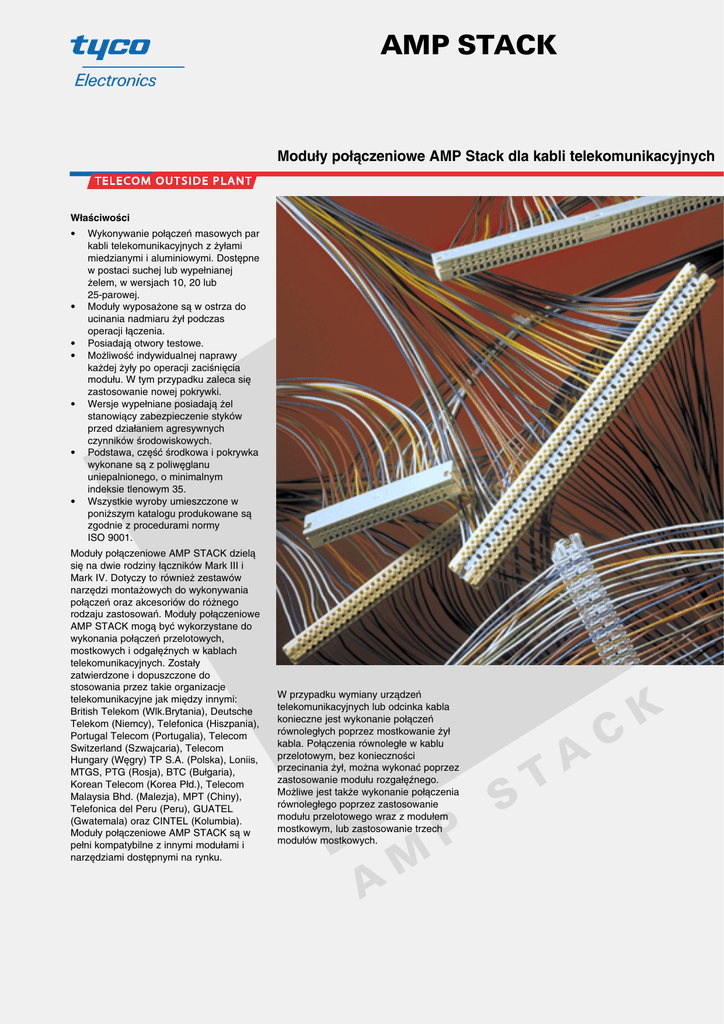 AMP STACK Modu∏y po∏àczeniowe AMP Stack dla kabli telekomunikacyjnych W∏aÊciwoÊci • • • • • • • Wykonywanie po∏àczeƒ masowych par kabli telekomunikacyjnych z ˝y∏ami miedzianymi i aluminiowymi. Dost´pne w postaci suchej lub wype∏nianej ˝elem, w wersjach 10, 20 lub 25-parowej. Modu∏y wyposa˝one sà w ostrza do ucinania nadmiaru ˝y∏ podczas operacji ∏àczenia. Posiadajà otwory testowe. Mo˝liwoÊç indywidualnej naprawy ka˝dej ˝y∏y po operacji zaciÊni´cia modu∏u. W tym przypadku zaleca si´ zastosowanie nowej pokrywki. Wersje wype∏niane posiadajà ˝el stanowiàcy zabezpieczenie styków przed dzia∏aniem agresywnych czynników Êrodowiskowych. Podstawa, cz´Êç Êrodkowa i pokrywka wykonane sà z poliw´glanu uniepalnionego, o minimalnym indeksie tlenowym 35. Wszystkie wyroby umieszczone w poni˝szym katalogu produkowane sà zgodnie z procedurami normy ISO 9001. Modu∏y po∏àczeniowe AMP STACK dzielà si´ na dwie rodziny ∏àczników Mark III i Mark IV. Dotyczy to równie˝ zestawów narz´dzi monta˝owych do wykonywania po∏àczeƒ oraz akcesoriów do ró˝nego rodzaju zastosowaƒ. Modu∏y po∏àczeniowe AMP STACK mogà byç wykorzystane do wykonania po∏àczeƒ przelotowych, mostkowych i odga∏´ênych w kablach telekomunikacyjnych. Zosta∏y zatwierdzone i dopuszczone do stosowania przez takie organizacje telekomunikacyjne jak mi´dzy innymi: British Telekom (Wlk.Brytania), Deutsche Telekom (Niemcy), Telefonica (Hiszpania), Portugal Telecom (Portugalia), Telecom Switzerland (Szwajcaria), Telecom Hungary (W´gry) TP S.A. (Polska), Loniis, MTGS, PTG (Rosja), BTC (Bu∏garia), Korean Telecom (Korea P∏d.), Telecom Malaysia Bhd. (Malezja), MPT (Chiny), Telefonica del Peru (Peru), GUATEL (Gwatemala) oraz CINTEL (Kolumbia). Modu∏y po∏àczeniowe AMP STACK sà w pe∏ni kompatybilne z innymi modu∏ami i narz´dziami dost´pnymi na rynku. W przypadku wymiany urzàdzeƒ telekomunikacyjnych lub odcinka kabla konieczne jest wykonanie po∏àczeƒ równoleg∏ych poprzez mostkowanie ˝y∏ kabla. Po∏àczenia równoleg∏e w kablu przelotowym, bez koniecznoÊci przecinania ˝y∏, mo˝na wykonaç poprzez zastosowanie modu∏u rozga∏´ênego. Mo˝liwe jest tak˝e wykonanie po∏àczenia równoleg∏ego poprzez zastosowanie modu∏u przelotowego wraz z modu∏em mostkowym, lub zastosowanie trzech modu∏ów mostkowych. A M P S A T C K AMP STACK Tyco, Raychem i AMP sà znakami handlowymi Tyco International. Pokazane tu w celach ilustracyjnych informacje, rysunki i schematy sà wed∏ug nas wiarygodne. Jednak˝e firma Tyco Electronics nie gwarantuje ich dok∏adnoÊci i kompletnoÊci oraz nie bierze na siebie odpowiedzialnoÊci zwiàzanej z ich u˝yciem. Zobowiàzania firmy Tyco Electronics mogà byç jedynie takie, jakie zosta∏y wyspecyfikowane w ”Standard Terms and Conditions of Sale” firmy Tyco Electronics dla niniejszego wyrobu i w ˝adnym przypadku firma Tyco Electronics nie b´dzie odpowiedzialna za jakiekolwiek przypadkowe, bezpoÊrednie lub wynikowe uszkodzenia powsta∏e w nast´pstwie sprzeda˝y, odsprzeda˝y, u˝ycia lub nieprawid∏owego u˝ycia tego wyrobu. U˝ytkownicy wyrobów firmy Tyco Electronics powinni sami dokonaç oszacowania w celu okreÊlenia przydatnoÊci ka˝dego takiego wyrobu do konkretnego zastosowania. Tyco Electronics Raychem NV Raychem Polska Sp. z o.o. Telecom Outside Plant Diestsesteenweg 692 3010 Kessel-Lo, Belgium Tel.: 32-16-351 011 Fax: 32-16-351 697 www.tycoelectronics.com Ul. Post´pu 2 02-676 Warszawa Tel.: 48-22- 549 07 20 Fax: 48-22- 549 07 21 [email protected] TC 700/DS/PO/1 08/00