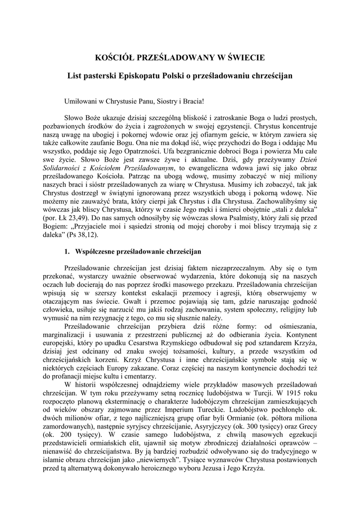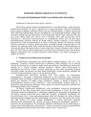 KOŚCIÓŁ PRZEŚLADOWANY W ŚWIECIE List pasterski Episkopatu Polski o prześladowaniu chrześcijan Umiłowani w Chrystusie Panu, Siostry i Bracia! Słowo Boże ukazuje dzisiaj szczególną bliskość i zatroskanie Boga o ludzi prostych, pozbawionych środków do życia i zagrożonych w swojej egzystencji. Chrystus koncentruje naszą uwagę na ubogiej i pokornej wdowie oraz jej ofiarnym geście, w którym zawiera się także całkowite zaufanie Bogu. Ona nie ma dokąd iść, więc przychodzi do Boga i oddając Mu wszystko, poddaje się Jego Opatrzności. Ufa bezgranicznie dobroci Boga i powierza Mu całe swe życie. Słowo Boże jest zawsze żywe i aktualne. Dziś, gdy przeżywamy Dzień Solidarności z Kościołem Prześladowanym, to ewangeliczna wdowa jawi się jako obraz prześladowanego Kościoła. Patrząc na ubogą wdowę, musimy zobaczyć w niej miliony naszych braci i sióstr prześladowanych za wiarę w Chrystusa. Musimy ich zobaczyć, tak jak Chrystus dostrzegł w świątyni ignorowaną przez wszystkich ubogą i pokorną wdowę. Nie możemy nie zauważyć brata, który cierpi jak Chrystus i dla Chrystusa. Zachowalibyśmy się wówczas jak bliscy Chrystusa, którzy w czasie Jego męki i śmierci obojętnie „stali z daleka” (por. Łk 23,49). Do nas samych odnosiłyby się wówczas słowa Psalmisty, który żali się przed Bogiem: „Przyjaciele moi i sąsiedzi stronią od mojej choroby i moi bliscy trzymają się z daleka” (Ps 38,12). 1. Współczesne prześladowanie chrześcijan Prześladowanie chrześcijan jest dzisiaj faktem niezaprzeczalnym. Aby się o tym przekonać, wystarczy uważnie obserwować wydarzenia, które dokonują się na naszych oczach lub docierają do nas poprzez środki masowego przekazu. Prześladowania chrześcijan wpisują się w szerszy kontekst eskalacji przemocy i agresji, którą obserwujemy w otaczającym nas świecie. Gwałt i przemoc pojawiają się tam, gdzie naruszając godność człowieka, usiłuje się narzucić mu jakiś rodzaj zachowania, system społeczny, religijny lub wymusić na nim rezygnację z tego, co mu się słusznie należy. Prześladowanie chrześcijan przybiera dziś różne formy: od ośmieszania, marginalizacji i usuwania z przestrzeni publicznej aż do odbierania życia. Kontynent europejski, który po upadku Cesarstwa Rzymskiego odbudował się pod sztandarem Krzyża, dzisiaj jest odcinany od znaku swojej tożsamości, kultury, a przede wszystkim od chrześcijańskich korzeni. Krzyż Chrystusa i inne chrześcijańskie symbole stają się w niektórych częściach Europy zakazane. Coraz częściej na naszym kontynencie dochodzi też do profanacji miejsc kultu i cmentarzy. W historii współczesnej odnajdziemy wiele przykładów masowych prześladowań chrześcijan. W tym roku przeżywamy setną rocznicę ludobójstwa w Turcji. W 1915 roku rozpoczęto planową eksterminację o charakterze ludobójczym chrześcijan zamieszkujących od wieków obszary zajmowane przez Imperium Tureckie. Ludobójstwo pochłonęło ok. dwóch milionów ofiar, z tego najliczniejszą grupę ofiar byli Ormianie (ok. półtora miliona zamordowanych), następnie syryjscy chrześcijanie, Asyryjczycy (ok. 300 tysięcy) oraz Grecy (ok. 200 tysięcy). W czasie samego ludobójstwa, z chwilą masowych egzekucji przedstawicieli ormiańskich elit, ujawnił się motyw zbrodniczej działalności oprawców – nienawiść do chrześcijaństwa. By ją bardziej rozbudzić odwoływano się do tradycyjnego w islamie obrazu chrześcijan jako „niewiernych”. Tysiące wyznawców Chrystusa postawionych przed tą alternatywą dokonywało heroicznego wyboru Jezusa i Jego Krzyża. 2 Przemiany, jakie dokonują się w Europie, wpisują się w dramat konfliktów i prześladowań chrześcijan, do których dochodzi w innych częściach świata. Według Raportu Papieskiego Stowarzyszenia Pomoc Kościołowi w Potrzebie w roku 2014 w 116 krajach świata dochodziło do łamania wolności religijnej, z czego w dwudziestu krajach sytuacja jest dramatyczna1. Ponad 100 tys. chrześcijan każdego roku jest brutalnie mordowanych, a jedynym motywem odebrania im życia jest wyznawana przez nich chrześcijańska wiara. Los chrześcijan oraz ich obecność w Iraku, Syrii, północnych stanach Nigerii ciągle stoi pod znakiem zapytania. Na oczach całego świata fundamentaliści z „państwa islamskiego” dokonują rzezi na wyznawcach Chrystusa, przybijając ich do krzyża, zadając tortury, dokonując rytualnych egzekucji. W samym Iraku przed dwunastoma laty żyło 1 milion 450 tys. chrześcijan, dzisiaj jest ich niecałe 100 tys. Arcybiskup Mosulu w sierpniu ubiegłego roku wysłał informację do Ojca Świętego, że w jego diecezji po 1400 latach przestała istnieć wspólnota chrześcijańska. Podobne wieści możemy już niedługo usłyszeć z Aleppo w Syrii i z wielu innych diecezji, gdzie coraz brutalniej eliminuje się chrześcijan. Jednym z bolesnych przejawów współczesnej przemocy jest także zabijanie misjonarzy, najczęściej pracujących i dających świadectwo Chrystusowi wśród najuboższych mieszkańców naszego globu. Według statystyk publikowanych przez watykańską Kongregację Ewangelizacji Narodów każdego roku ginie do 20 do 30 katolickich misjonarzy. Są wśród nich także Polacy, jak choćby młodzi franciszkanie o. Zbigniew Strzałkowski i o. Michał Tomaszek, którzy za kilka tygodni będą przez papieża Franciszka ogłoszeni błogosławionymi. Zostali oni zamordowani przed ponad dwudziestu laty przez terrorystów marksistowskiego ruchu „Świetlisty Szlak”, który dążył zbrodniczymi metodami do zmiany ustroju w Peru. Dwaj trzydziestoletni misjonarze z Polski zostali zabici za to, że głosili Ewangelię, ale również dlatego, że troszczyli się o potrzeby Indian cierpiących skrajne ubóstwo, zapewniając najuboższym chleb i odzienie oraz budując wspólnotę solidarności i wzajemnej pomocy wśród andyjskich górali. Takich wstrząsając