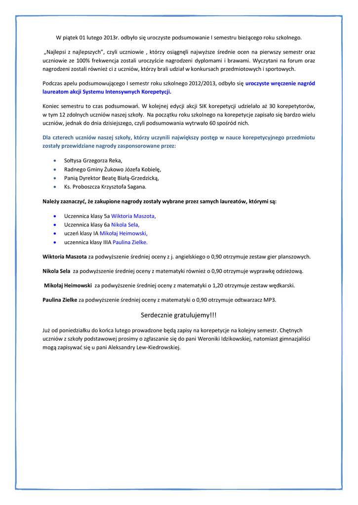 W piątek 01 lutego 2013r. odbyło się uroczyste podsumowanie I semestru bieżącego roku szkolnego. „Najlepsi z najlepszych”, czyli uczniowie , którzy osiągnęli najwyższe średnie ocen na pierwszy semestr oraz uczniowie ze 100% frekwencja zostali uroczyście nagrodzeni dyplomami i brawami. Wyczytani na forum oraz nagrodzeni zostali również ci z uczniów, którzy brali udział w konkursach przedmiotowych i sportowych. Podczas apelu podsumowującego I semestr roku szkolnego 2012/2013, odbyło się uroczyste wręczenie nagród laureatom akcji Systemu Intensywnych Korepetycji. Koniec semestru to czas podsumowań. W kolejnej edycji akcji SIK korepetycji udzielało aż 30 korepetytorów, w tym 12 zdolnych uczniów naszej szkoły. Na początku roku szkolnego na korepetycje zapisało się bardzo wielu uczniów, jednak do dnia dzisiejszego, czyli podsumowania wytrwało 60 spośród nich. Dla czterech uczniów naszej szkoły, którzy uczynili największy postęp w nauce korepetycyjnego przedmiotu zostały przewidziane nagrody zasponsorowane przez: Sołtysa Grzegorza Reka, Radnego Gminy Żukowo Józefa Kobielę, Panią Dyrektor Beatę Białą-Grzedzicką, Ks. Proboszcza Krzysztofa Sagana. Należy zaznaczyć, że zakupione nagrody zostały wybrane przez samych laureatów, którymi są: Uczennica klasy 5a Wiktoria Maszota, Uczennica klasy 6a Nikola Sela, uczeń klasy IA Mikołaj Heimowski, uczennica klasy IIIA Paulina Zielke. Wiktoria Maszota za podwyższenie średniej oceny z j. angielskiego o 0,90 otrzymuje zestaw gier planszowych. Nikola Sela za podwyższenie średniej oceny z matematyki również o 0,90 otrzymuje wyprawkę odzieżową. Mikołaj Heimowski za podwyższenie średniej oceny z matematyki o 1,20 otrzymuje zestaw wędkarski. Paulina Zielke za podwyższenie średniej oceny z matematyki o 0,90 otrzymuje odtwarzacz MP3. Serdecznie gratulujemy!!! Już od poniedziałku do końca lutego prowadzone będą zapisy na korepetycje na kolejny semestr. Chętnych uczniów z szkoły podstawowej prosimy o zgłaszanie się do pani Weroniki Idzikowskiej, natomiast gimnazjaliści mogą zapisywać się u pani Aleksandry Lew-Kiedrowskiej.