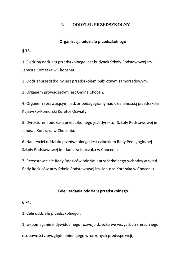I. ODDZIAŁ PRZEDSZKOLNY Organizacja oddziału przedszkolnego § 73. 1. Siedzibą oddziału przedszkolnego jest budynek Szkoły Podstawowej im. Janusza Korczaka w Choceniu. 2. Oddział przedszkolny jest przedszkolem publicznym samorządowym. 3. Organem prowadzącym jest Gmina Choceń. 4. Organem sprawującym nadzór pedagogiczny nad działalnością przedszkola Kujawsko-Pomorski Kurator Oświaty. 5. Dyrektorem oddziału przedszkolnego jest dyrektor Szkoły Podstawowej im. Janusza Korczaka w Choceniu. 6. Nauczyciel oddziału przedszkolnego jest członkiem Rady Pedagogicznej Szkoły Podstawowej im. Janusza Korczaka w Choceniu. 7. Przedstawiciele Rady Rodziców oddziału przedszkolnego wchodzą w skład Rady Rodziców przy Szkole Podstawowej im. Janusza Korczaka w Choceniu. Cele i zadania oddziału przedszkolnego § 74. 1. Cele oddziału przedszkolnego : 1) wspomaganie indywidualnego rozwoju dziecka we wszystkich sferach jego osobowości z uwzględnieniem jego wrodzonych predyspozycji, 2) doprowadzenie dziecka do takiego stopnia rozwoju psycho – fizycznego i społecznego oraz wyposażenie go w zasób wiadomości, umiejętności i sprawności jaki jest niezbędny do podjęcia nauki w szkole, 3) ukształtowanie poczucie tożsamości ze społecznie akceptowanymi wzorami i normami postępowania a także poczucia współodpowiedzialności za własne postępowanie i zachowanie, 4) wspomaganie wychowawczej i opiekuńczej roli rodziny w ścisłym z nią współdziałaniu w celu ujednolicenia oddziaływań wychowawczych. 2. Zadania oddziału przedszkolnego: 1) zapewnienie kształcenia, wychowania i opieki odpowiednio do wieku dziecka i osiągniętego stopnia rozwoju, 2) zapewnienie dzieciom bezpiecznych i higienicznych warunków pobytu w oddziale przedszkolnym, 3) organizowanie pracy z wychowankami zgodnie z zasadami higieny pracy, nauki i wypoczynku oraz prawidłowościami psychologii rozwojowej dzieci, 4) dostosowanie treści, metod i form pracy dydaktycznej, wychowawczej i opiekuńczej do możliwości psycho – fizycznych dzieci oraz jej indywidualizacja zgodnie z jednostkowymi potrzebami i możliwościami, 5) wspomaganie indywidualnego rozwoju dziecka z wykorzystaniem jego własnej inicjatywy, 6) prowadzenie działalności diagnostycznej dotyczącej rozwoju dziecka, 7) udzielanie pomocy pedagogiczno – psychologicznej 8) podtrzymywanie poczucia tożsamości narodowej, etnicznej, językowej i religijnej, 9) pomoc dzieciom z rodzin będących w trudnej sytuacji życiowej i materialnej. 3. Oddział przedszkolny zapewnia możliwość korzystania z opieki psychologiczno – pedagogicznej, specjalnych form pracy wychowawczo – dydaktycznej z uwzględnieniem indywidualnych potrzeb rozwojowych i edukacyjnych oraz predyspozycji dzieci poprzez: 1) wskazywanie dla dzieci właściwych poradni psychologiczno – pedagogicznych po konsultacji i za zgodą rodziców lub opiekunów, prowadzenie indywidualizacji pracy z poszczególnymi dziećmi zgodnie z zaleceniami tychże poradni. 4. W oddziale przedszkolnym przestrzega się praw dziecka zgodnie z Konwencją Praw Dziecka. Szanuje się prawo dziecka do indywidualnej linii rozwoju: 1) pracę wychowawczo – dydaktyczną prowadzi się na poziomie zgodnym z poziomem rozwoju i indywidualnymi potrzebami dziecka, 2) wzmacnia się u dzieci poczucie własnej godności i wartości. 3) szanuje się wszystkie dzieci niezależnie od rasy, pochodzenia, wyznania, zdolności czy ułomności, 4) w oddziale przedszkolnym nie stosuje się kar cielesnych i reaguje na krzywdę wyrządzoną dziecku przez innych. 5. Sposób realizacji zadań oddziału przedszkolnego – w oddziale przedszkolnym nauczyciel prowadzący: 1) wspomaga i ukierunkowuje indywidualny rozwój dziecka, dostosowując treści, metody i organizację pracy wychowawczo – dydaktycznej i opiekuńczej do potrzeb i możliwości rozwojowych dziecka, w szczególności poprzez : a) stosowanie zadań dla dzieci w sytuacjach naturalnych, b) system ofert edukacyjnych, c) stosowanie zadań otwartych w trakcie zajęć, d) działania korekcyjne, kompensacyjne, profilaktyczne i stymulujące, 2) organizuje zajęcia o atrakcyjnych dla dzieci treściach z zastosowaniem różnorodnych, w miarę możliwości nowatorskich, form i metod pracy, 3) umożliwia dzieciom intensywne uczestnictwo w działaniu, przeżywaniu i poznawaniu otaczającego świata poprzez stawianie zadań dostosowanych do rzeczywistych potrzeb, możliwości i zainteresowań dzieci, 4) organizuje sytuacje edukacyjne sprzyjające nawiązywaniu przez dzieci różnorodnych kontaktów społecznych i wchodzeniu w różnorodne interakcje osobowe a także umożliwiających im wyrażanie własnych emocji, myśli i wiedzy w różnorodnej twórczości własnej – werbalnej, plastycznej, ruchowej, muzycznej, 5) w działalności dydaktyczno – wychowawczej ukazuje dzieciom piękno języka ojczystego oraz bogactwo kultury i tradycji narodowej i regionalnej, 6) tworzy warunki umożliwiające dziecku osiągnięcie gotowości szkolnej w atmosferze akceptacji i bezpieczeństwa. 6. Oddział przedszkolny realizuje cele i zadania wynikające z ustawy, a także z wydanych na jej podstawie aktów wykonawczych, poprzez organizowanie przez nauczycieli pracy z całą grupą dzieci, zespołowo lub indywidualnie, w oparciu o podstawy programowe wychowania przedszkolnego, stosując zróżnicowane metody i formy pracy z dzieckiem zaczerpnięte z różnorodnych koncepcji pedagogicznych. 7. Oddział przedszkolny realizuje swoje cele i zadania we współdziałaniu z rodzicami lub opiekunami dziecka. 8. Oddział przedszkolny zapewnia dzieciom bezpieczeństwo podczas pobytu w szkole oraz wszystkich zajęć organizowanych poza szkołą; 1) zapewnia stałą opiekę podczas pobytu dziecka w oddziale przedszkolnym oraz zajęć organizowanych poza terenem szkoły, 2) uczy zasad bezpiecznego zachowania i przestrzegania higieny, 3) stwarza atmosferę akceptacji, 4) zapewnia organizację wycieczek zg