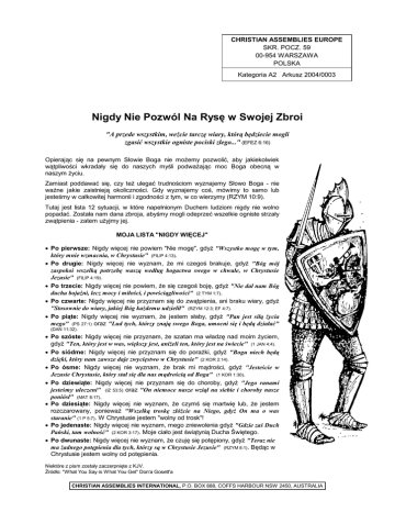 CHRISTIAN ASSEMBLIES EUROPE SKR. POCZ. 59 00-954 WARSZAWA POLSKA Kategoria A2 Arkusz 2004/0003 Nigdy Nie Pozwól Na Rysę w Swojej Zbroi "A przede wszystkim, weźcie tarczę wiary, którą będziecie mogli zgasić wszystkie ogniste pociski złego..." (EFEZ 6:16) Opierając się na pewnym Słowie Boga nie możemy pozwolić, aby jakiekolwiek wątpliwości wkradały się do naszych myśli podważając moc Boga obecną w naszym życiu. Zamiast poddawać się, czy też ulegać trudnościom wyznajemy Słowo Boga - nie ważne jakie zaistnieją okoliczności. Gdy wyznajemy coś, mówimy to samo lub jesteśmy w całkowitej harmonii i zgodności z tym, w co wierzymy (RZYM 10:9). Tutaj jest lista 12 sytuacji, w które napełnionym Duchem ludziom nigdy nie wolno popadać. Została nam dana zbroja, abyśmy mogli odeprzeć wszelkie ogniste strzały zwątpienia - zatem użyjmy jej. MOJA LISTA "NIGDY WIĘCEJ" Po pierwsze: Nigdy więcej nie powiem "Nie mogę", gdyż "Wszystko mogę w tym, który mnie wzmacnia, w Chrystusie" (FILIP 4:13). Po drugie: Nigdy więcej nie wyznam, że mi czegoś brakuje, gdyż "Bóg mój zaspokoi wszelką potrzebę waszą według bogactwa swego w chwale, w Chrystusie Jezusie" (FILIP 4:19). Po trzecie: Nigdy więcej nie powiem, że się czegoś boję, gdyż "Nie dał nam Bóg ducha bojaźni, lecz mocy i miłości, i powściągliwości" (2 TYM 1:7). Po czwarte: Nigdy więcej nie przyznam się do zwątpienia, ani braku wiary, gdyż "Stosownie do wiary, jakiej Bóg każdemu udzielił" (RZYM 12:3; EF 4:7). Po piąte: Nigdy więcej nie wyznam, że jestem słaby, gdyż "Pan jest siłą życia mego" (PS 27:1) oraz "Lud tych, którzy znają swego Boga, umocni się i będą działać" (DAN 11:32). Po szóste: Nigdy więcej nie przyznam, że szatan ma władzę nad moim życiem, gdyż "Ten, który jest w was, większy jest, aniżeli ten, który jest na świecie" (1 JAN 4:4). Po siódme: Nigdy więcej nie przyznam się do porażki, gdyż "Bogu niech będą dzięki, który nam zawsze daje zwycięstwo w Chrystusie" (2 KOR 2:14). Po ósme: Nigdy więcej nie wyznam, że brak mi mądrości, gdyż "Jesteście w Jezusie Chrystusie, który stał się dla nas mądrością od Boga" (1 KOR 1:30). Po dziewiąte: Nigdy więcej nie przyznam się do choroby, gdyż "Jego ranami jesteśmy uleczeni" (IZ 53:5) oraz "On niemoce nasze wziął na siebie i choroby nasze poniósł" (MAT 8:17). Po dziesiąte: Nigdy więcej nie wyznam, że czymś się martwię lub, że jestem rozczarowany, ponieważ "Wszelką troskę złóżcie na Niego, gdyż On ma o was staranie" (1 P 5:7). W Chrystusie jestem "wolny od trosk"! Po jedenaste: Nigdy więcej nie wyznam, mego zniewolenia gdyż "Gdzie zaś Duch Pański, tam wolność" (2 KOR 3:17). Moje ciało jest świątynią Ducha Świętego. Po dwunaste: Nigdy więcej nie wyznam, że czuję się potępiony, gdyż "Teraz nie ma żadnego potępienia dla tych, którzy są w Chrystusie Jezusie" (RZYM 8:1). Będąc w Chrystusie jestem wolny od potępienia. Niektóre z pism zostały zaczerpnięte z KJV. Źródło: "What You Say is What You Get" Don'a Gosett'a CHRISTIAN ASSEMBLIES INTERNATIONAL, P.O. BOX 888, COFFS HARBOUR NSW 2450, AUSTRALIA Table filled in by: Tomek Jan DOCUMENT INFORMATION File name: SA2004PL.DOC Created with template: SHEET-GB.DOT First release: 03/00 Last update on: 11/03/00 Last update by: Tomek Jan Pictures/Objects: PhotoPaint (PCX) (info about program) FONT INFORMATION Font name: File name(s) File date(s) Arial arial.ttf 05.09.96 Times New Roman times.ttf 05.09.96 PRINT INFORMATION Operating System: Windows 3.11 MS-WORD version 2.0c Printer Driver/Version: HPIIIP/1.11.93 P.O. BOXES Approved for P.O. BOX: Comments: C.A.E. Warsaw, Poland