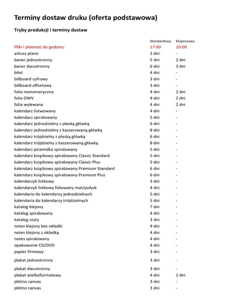 Terminy dostaw druku (oferta podstawowa) Tryby produkcji i terminy dostaw Standardowy Ekspresowy Pliki i płatność do godziny: arkusz plano baner jednostronny baner dwustronny bilet billboard cyfrowy billboard offsetowy folia monomeryczna folia OWV folia wylewana kalendarz listwowany kalendarz spiralowany kalendarz jednodzielny z płaską główką kalendarz jednodzielny z kaszerowaną główką kalendarz trójdzielny z płaską główką kalendarz trójdzielny z kaszerowaną główką kalendarz piramidka spiralowany kalendarz książkowy spiralowany Classic Standard kalendarz książkowy spiralowany Classic Plus kalendarz książkowy spiralowany Premium Standard kalendarz książkowy spiralowany Premium Plus kalendarzyk listkowy kalendarzyk listkowy foliowany mat/połysk kalendaria do kalendarzy jednodzielnych kalendaria do kalendarzy trójdzielnych katalog klejony katalog spiralowany katalog szyty notes klejony bez okładki notes klejony z okładką notes spiralowany opakowanie CD/DVD papier firmowy 17:00 2 dni 5 dni 6 dni 4 dni 3 dni 3 dni 4 dni 4 dni 4 dni 4 dni 5 dni 6 dni 8 dni 6 dni 8 dni 5 dni 5 dni 5 dni 6 dni 6 dni 3 dni 4 dni 5 dni 5 dni 7 dni 4 dni 3 dni 4 dni 4 dni 4 dni 4 dni 3 dni 10:00 2 dni 3 dni 2 dni 2 dni 2 dni - plakat jednostronny 3 dni - plakat dwustronny plakat wielkoformatowy płótno canvas płótno canvas 3 dni 4 dni 3 dni 3 dni 2 dni - pocztówka podkład na biurko proof cyfrowy siatka mesh stojak prezentacyjny teczka ofertowa ulotka 4 dni 4 dni 2 dni 4 dni 5 dni 3 dni 4 dni 2 dni 2 dni - wizytówki wizytówki składane zaproszenie 3 dni 4 dni 4 dni - *Wszystkie terminy podane są w dniach roboczych.